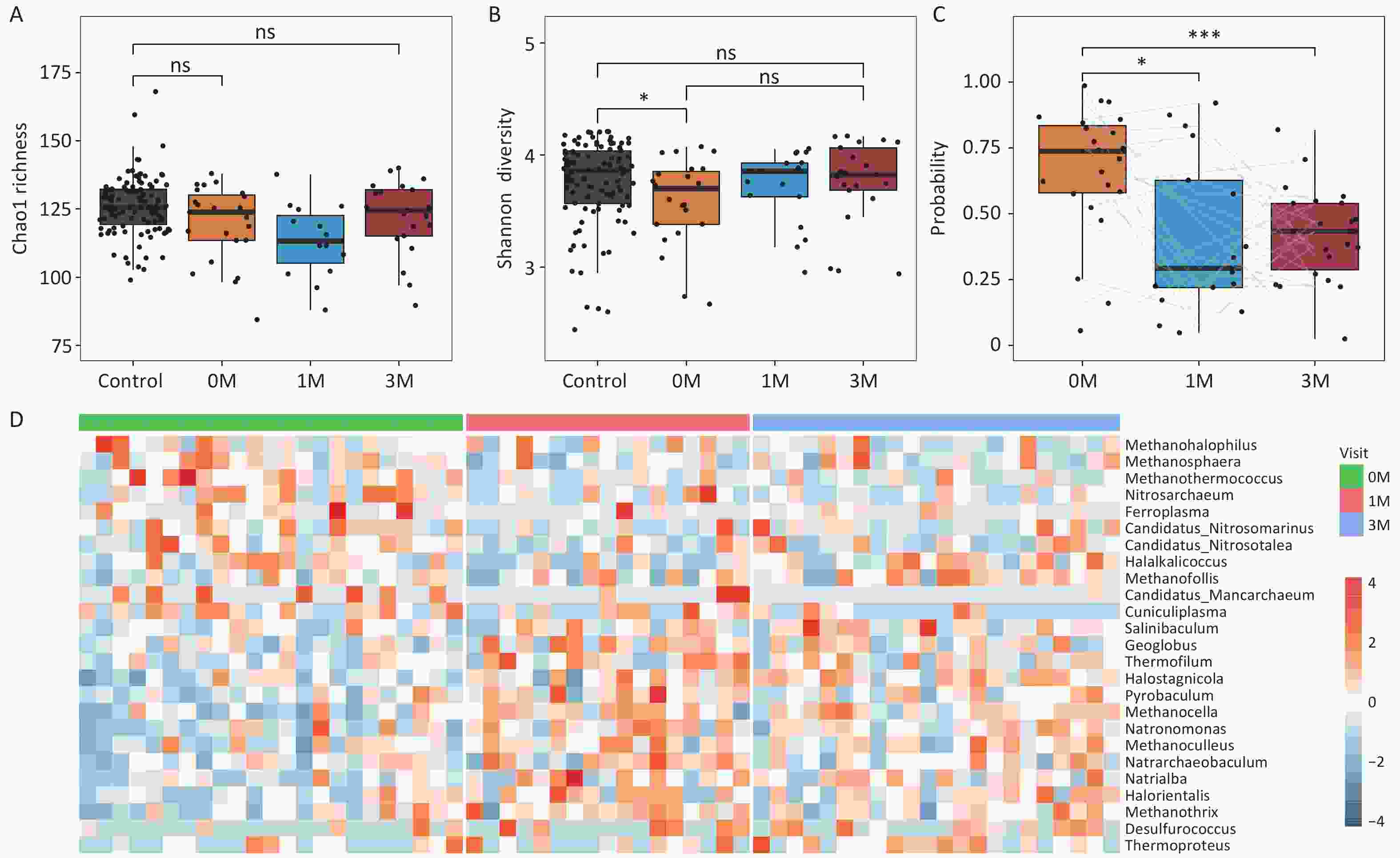 Figure 4. Bariatric surgery mitigates gut archaeal dysbiosis in obese subjects. (A) Chao1 richness and (B) Shannon diversity for obese subjects before and after surgery. Groups were compared using the Wilcoxon rank-sum test. (C) The probability of obesity in obese subjects before and after surgery. (D) Heatmap showing fold changes of the differential gut archaeal genera for obese subjects post-bariatric surgery compared with baseline. Groups were compared using LEfSe (Linear discriminant analysis Effect Size). S0: before surgery. S1: 1 month after surgery. S3: 3 months after surgery. Groups were compared using the Wilcoxon rank-sum test. * P < 0.05,** P < 0.01,*** P < 0.001.