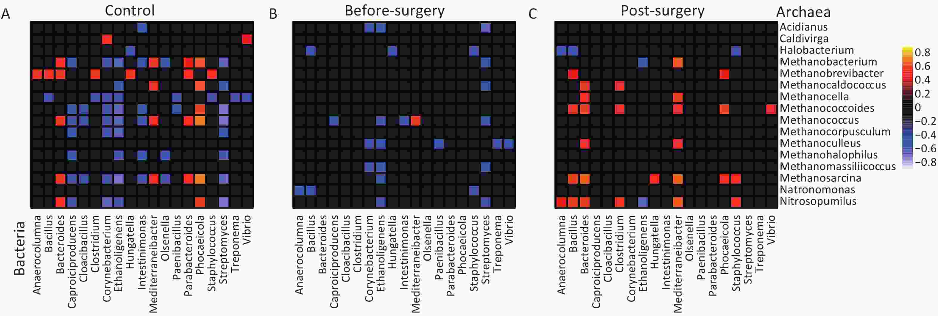Figure 5. Decreased bacterial-archaeal correlations are found in obese subjects but restored post-bariatric surgery. (A) Lean controls, (B) Obese subjects before surgery, and (C) Obese subjects after surgery. Correlation coefficients were estimated and corrected for compositional effects using the SparCC algorithm. A subset of correlations with coefficient strengths of > 0.5 or < -0.5 and P < 0.05 were considered significant. Any taxa with correlation pairs ≥ 2 were kept in the heatmaps.