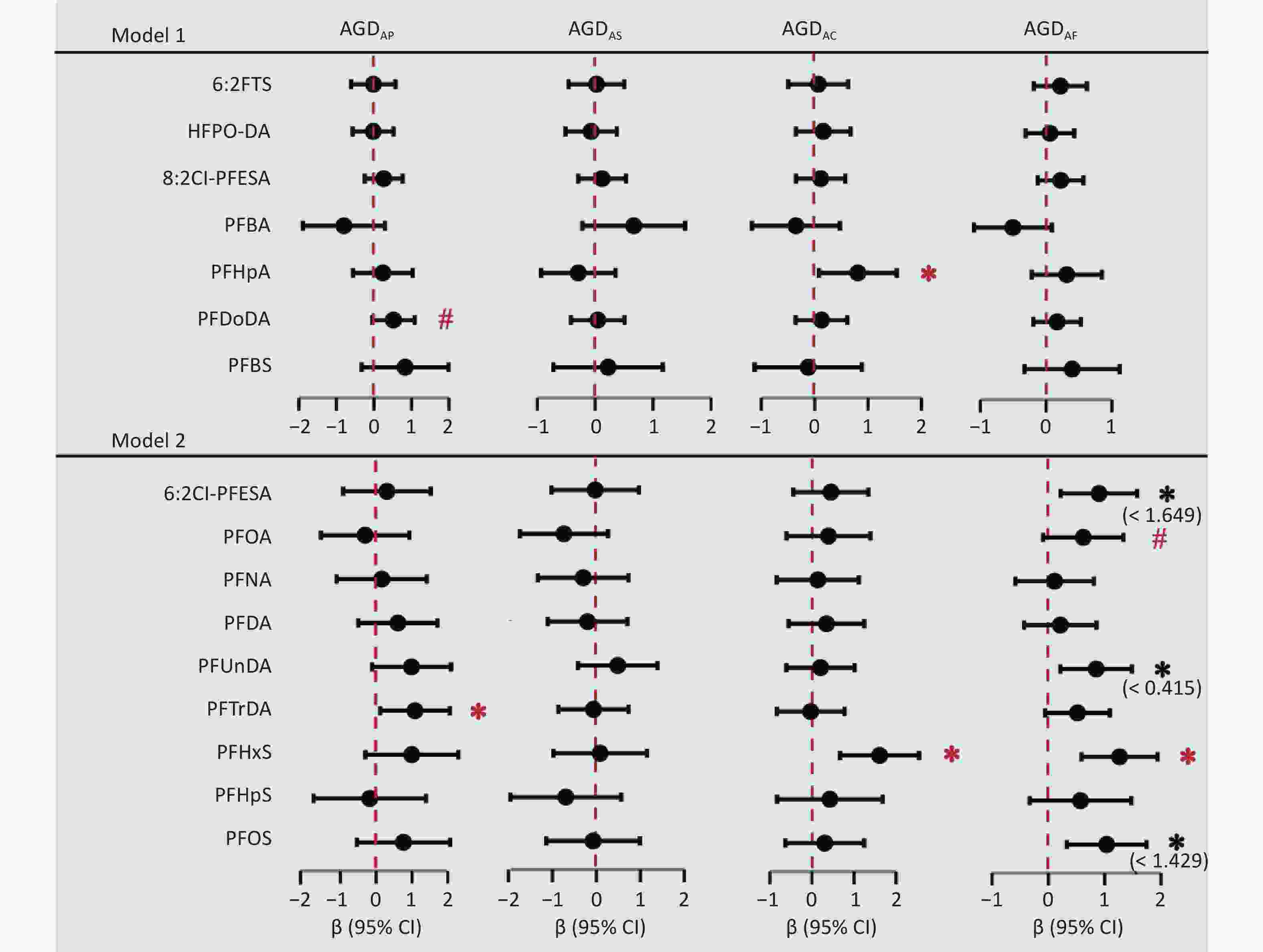 Figure 2. The forest plot displays the adjusted regression coefficients (β) and 95% confidence intervals (95% CIs) derived from separate multivariable linear regression models assessing the associations between each PFAS (log-transformed) congener and AGD. Solid dots represent point estimates (β), and horizontal lines represent the 95% CIs. Model 1 was adjusted for maternal age, gestational age, parity, educational attainment, pre-pregnancy BMI, pre-pregnancy passive smoking, and birth weight. Model 2 was further adjusted for exposure level. BMI, body mass index; CI, confidence interval; AGDAP, anopenile distance; AGDAS, anoscrotal distance; AGDAC, anoclitoris distance; AGDAF, anofourchette distance. 6:2 FTS, 6:2 fluorotelomer sulfonic acid; HFPO-DA, hexafluoropropylene oxide dimer acid; 6:2 Cl-PFESA, 6:2 chlorinated polyfluorinated ether sulfonate; 8:2 Cl-PFESA, 8:2 Chlorinated polyfluoroalkyl ether sulfonate; PFBA, perfluorobutanoic acid; PFHpA, perfluoroheptanoic acid; PFOA, perfluorooctanoic acid; PFNA, perfluorononanoic acid; PFDA, perfluorodecanoic acid; PFUnDA, perfluoroundecanoic acid; PFDoDA, Sodium perfluoro-n-dodecanoate; PFTrDA, perfluorotridecanoic acid; PFBS, perfluorobutane sulfonic acid; PFHxS, perfluorohexane sulfonic acid; PFHpS, perfluoroheptane sulfonic acid; PFOS, perfluorooctane sulfonic acid. * P < 0.05, # P < 0.1.