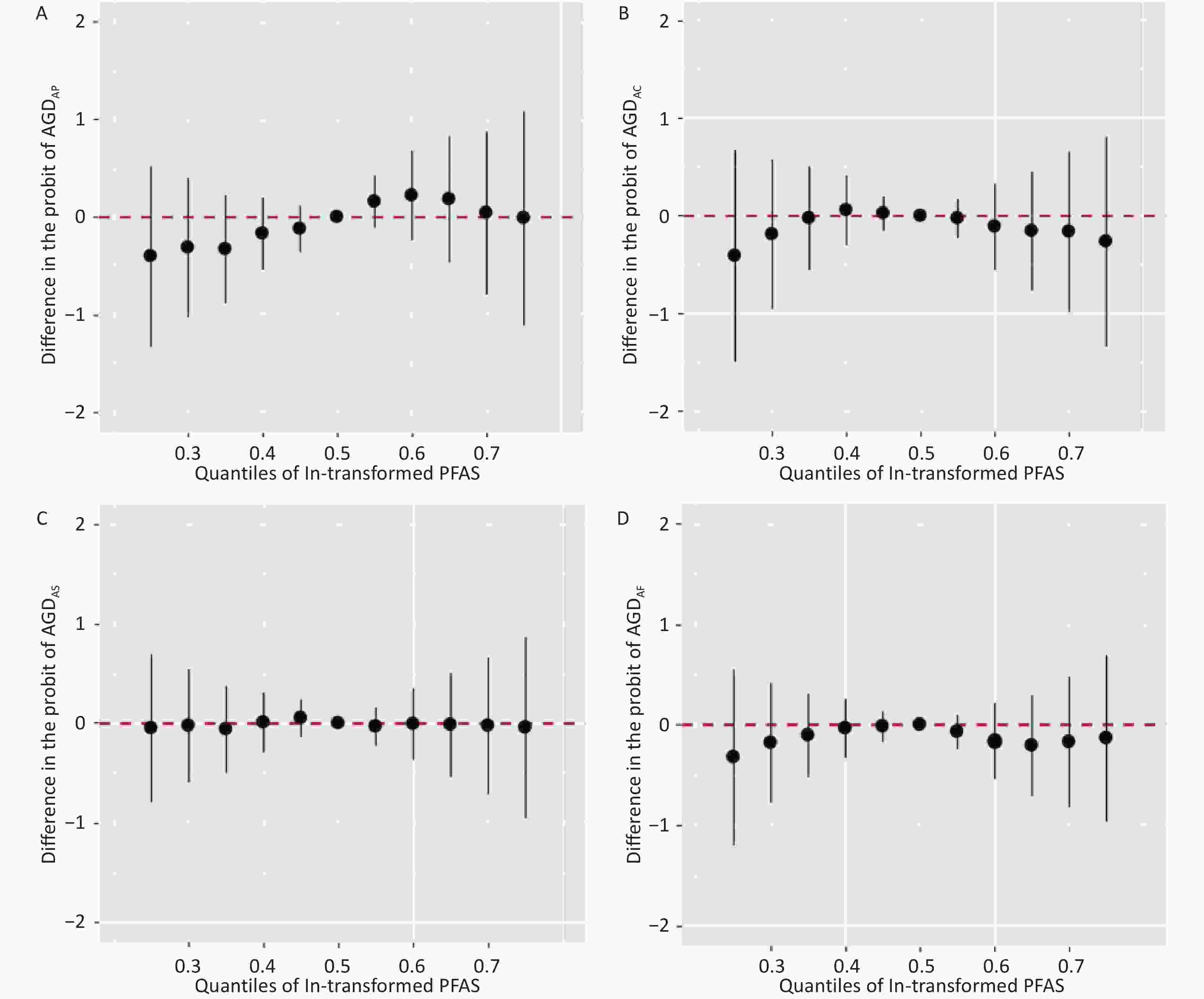 Figure 3. Overall effects of prenatal exposure to PFAS mixture on male or female AGD in BKMR. Overall effects plot the estimated difference in AGD when all 16 PFAS concentrations are fixed at the specified quantiles (0.25–0.75) compared to when all 16 PFAS’s concentrations are fixed at the 50th percentile. Models were adjusted for maternal age, gestational age, parity, educational attainment, pre-pregnancy BMI, pre-pregnancy passive smoking, and birth weight. AGDAP, anopenile distance; AGDAS, anoscrotal distance; AGDAC, anoclitoris distance; AGDAF, anofourchette distance; BKMR, Bayesian kernel machine regression models.