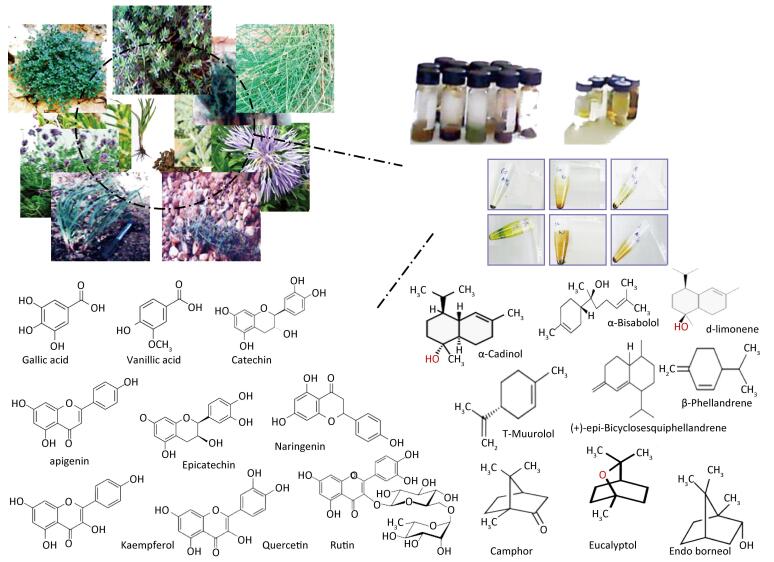 Aerial parts, tuberous roots, and peels of medicinal plants with phenolic compounds, as shown in Table 1 and Figure 1, were collected in the springtime from March to May from 2 locations in Tunisia: 9 species from the southwest (Gafsa) and 3 from the northeast (Zaghouan), with coordinates N 34° 22' 49.8'' and E 9° 3' 23.4''; N 36° 24' and E 10° 09', respectively. Voucher specimens were deposited in the National Institute of Agronomic of Tunisia (INAT) Herbarium in Tunisia.