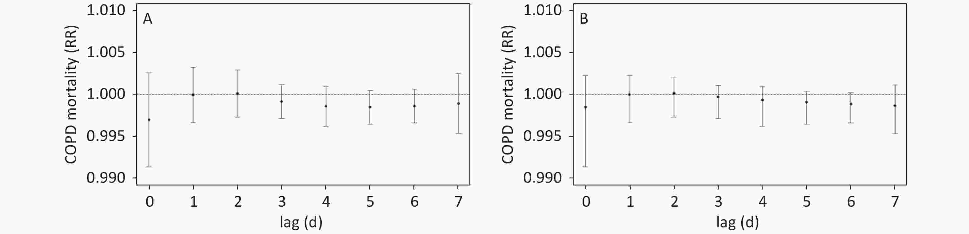 Figure S2.  From 2016 to 2018, RR and 95% CI of PM2.5(A)/PM10(B) of COPD mortality in Weifang with lagged 0–7 days.