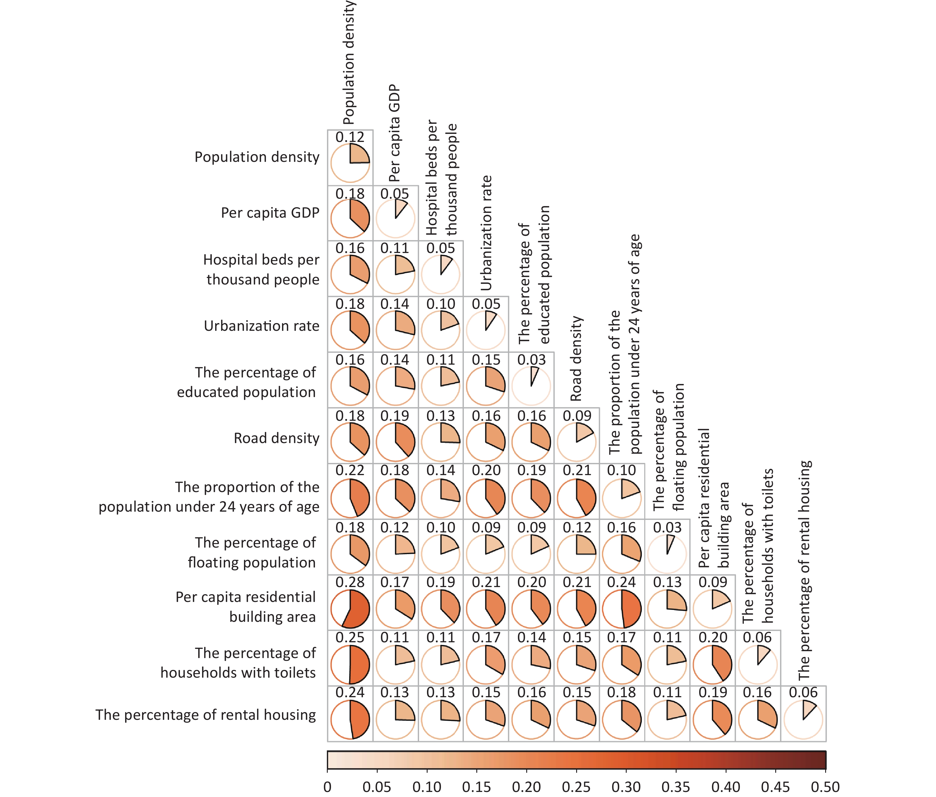 Category Potential factors q-statistic P Status of vaccination Per capita GDP (yuan) 0.05 0.01 Percentage of educated population (%) 0.03 0.01 Social economy Urbanization rate (%) 0.05 0.02 Hospital beds of 1,000 people 0.05 0.01 Living environment Per capita residential building area (m3) 0.10 0.01 Percentage of rental housing (%) 0.06 0.01 Percentage of households with toilets (%) 0.06 0.01 Demographics Population density (number of people/100 m2) 0.12 0.01 Proportion of the population under 24 years of age (%) 0.10 0.01 Percentage of floating population (%) 0.03 0.05 Note. GDP, gross domestic product. -