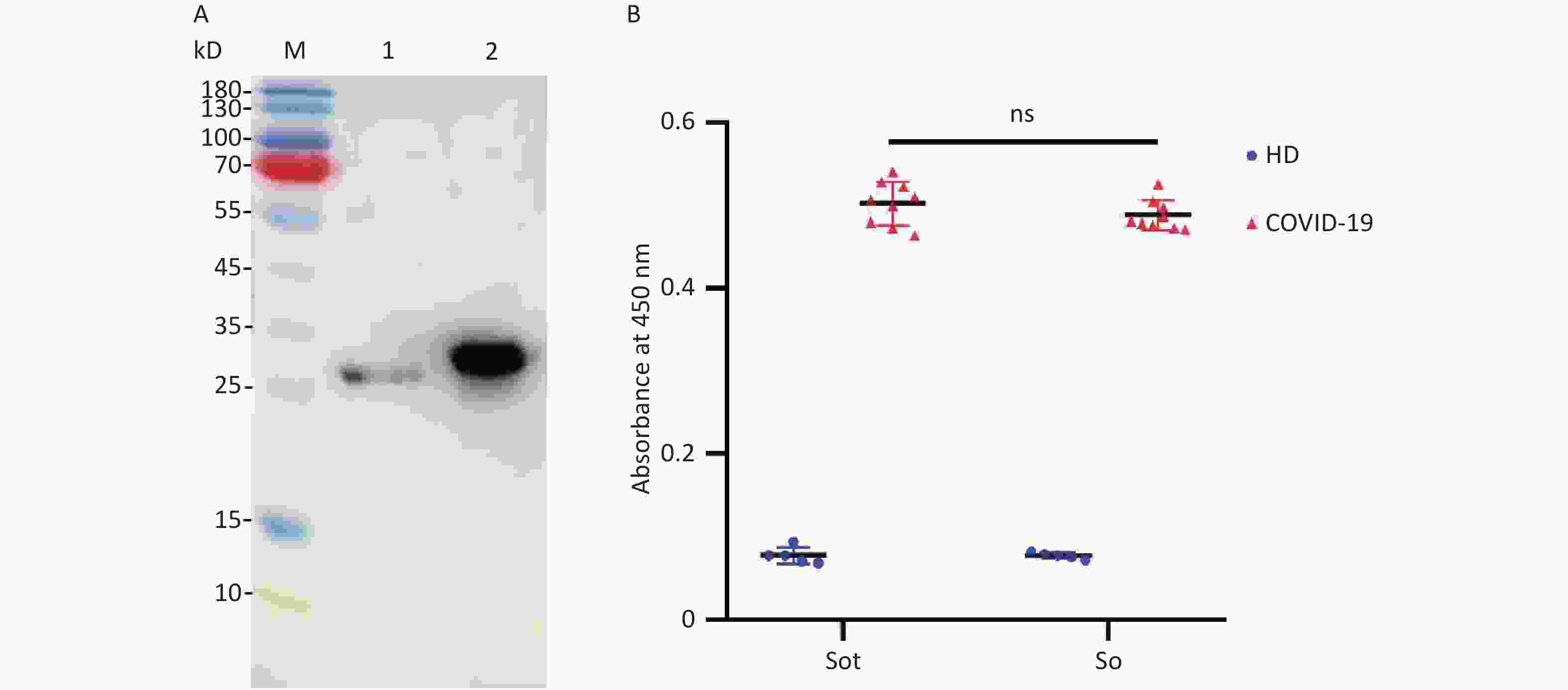 Figure 4. Antigenicity analysis of the recombinant proteins: (A) WB assay of the proteins: Lane M, protein marker; lane 1, So protein; lane 2, Sot protein. (B) Absorbance at 450 nm of ELISA. WB, Western blotting; ELISA, enzyme-linked immunosorbent assay; HD, healthy donors; COVID-19, coronavirus disease 2019.