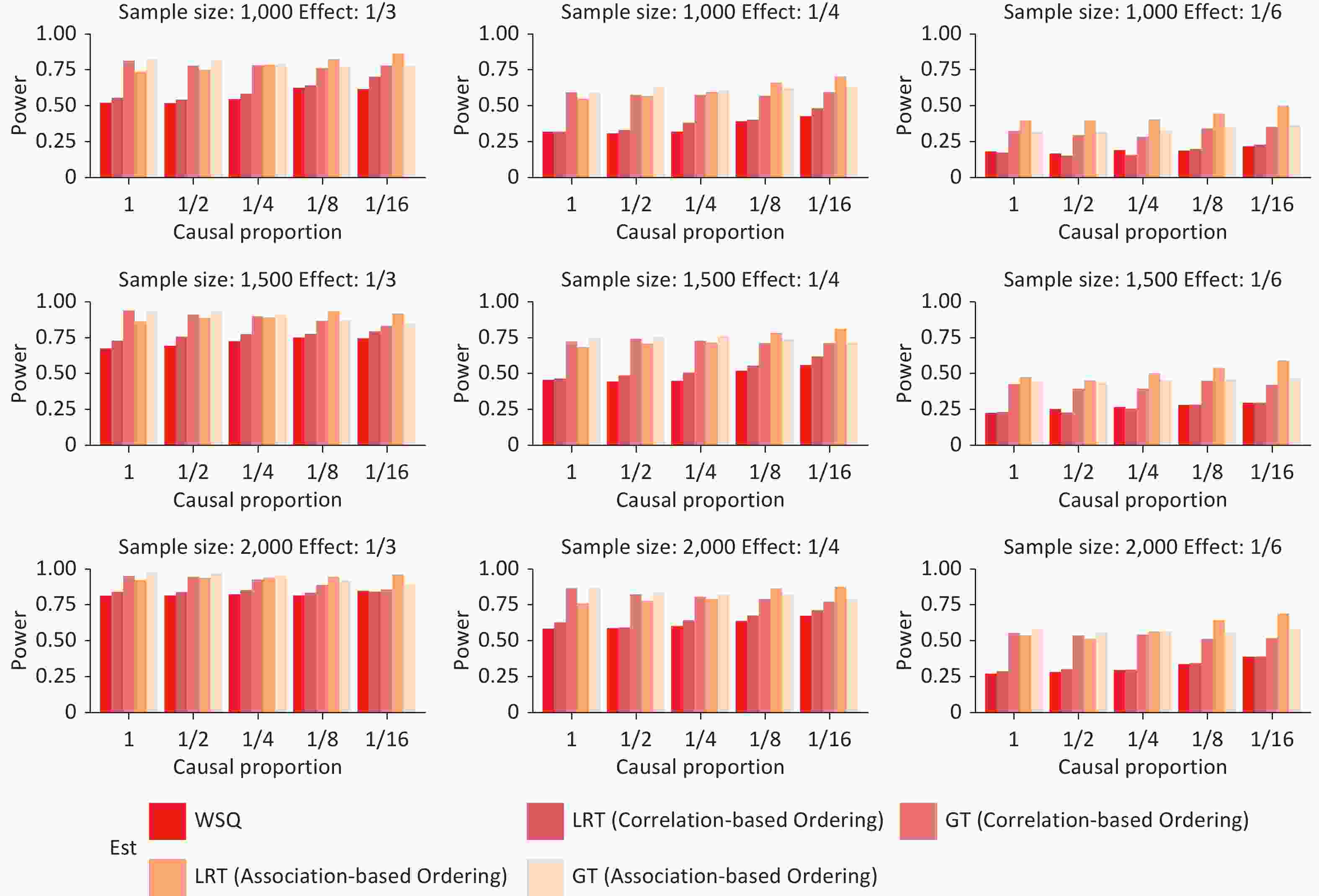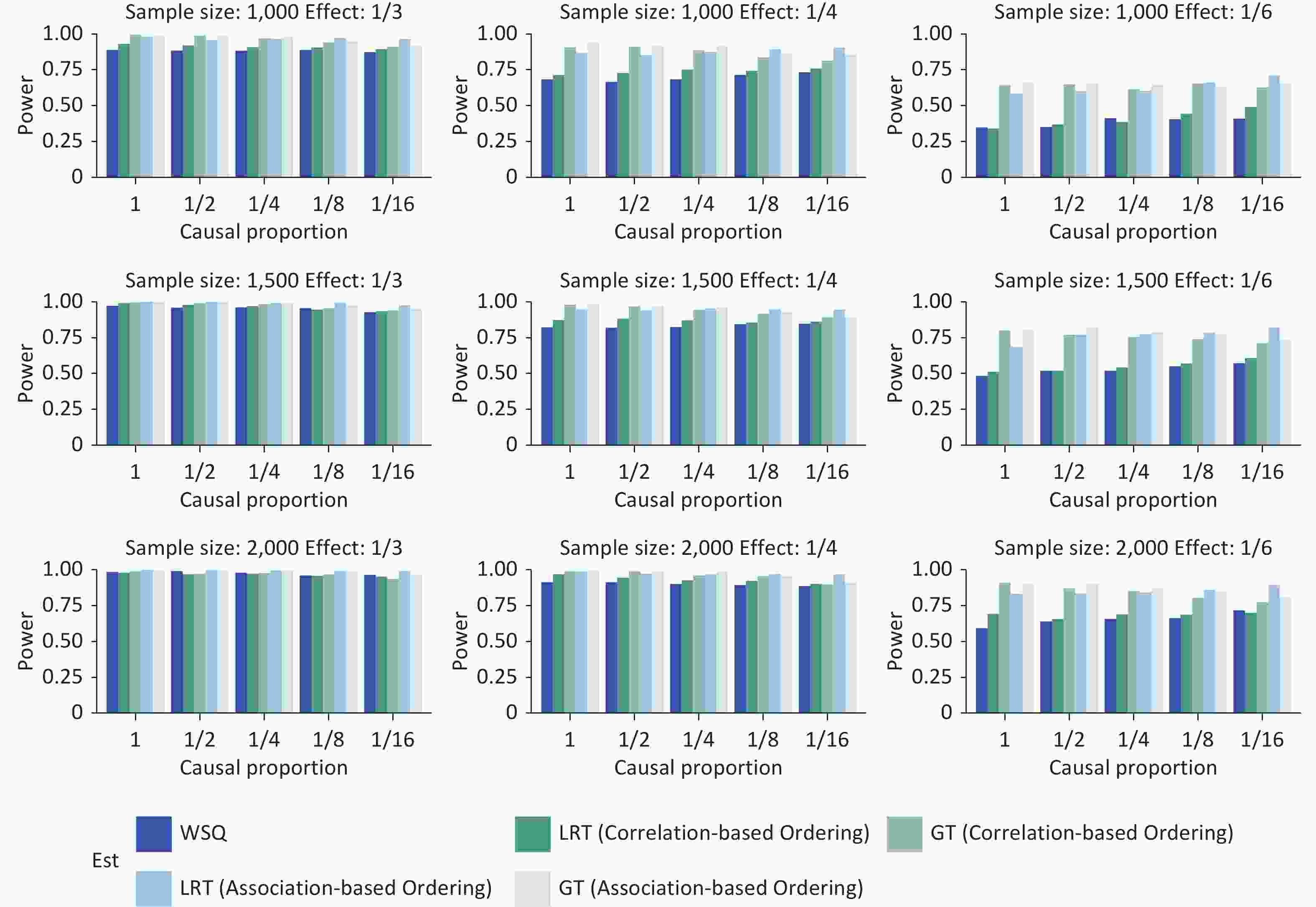 Figure 3. Power simulation of the unidirectional exposure effect for binary outcomes under various sample sizes, total effect size magnitudes, causal exposure proportions, and testing method combinations. WQS, weighted quantile sum regression; LRT, likelihood ratio test; GT, global test.