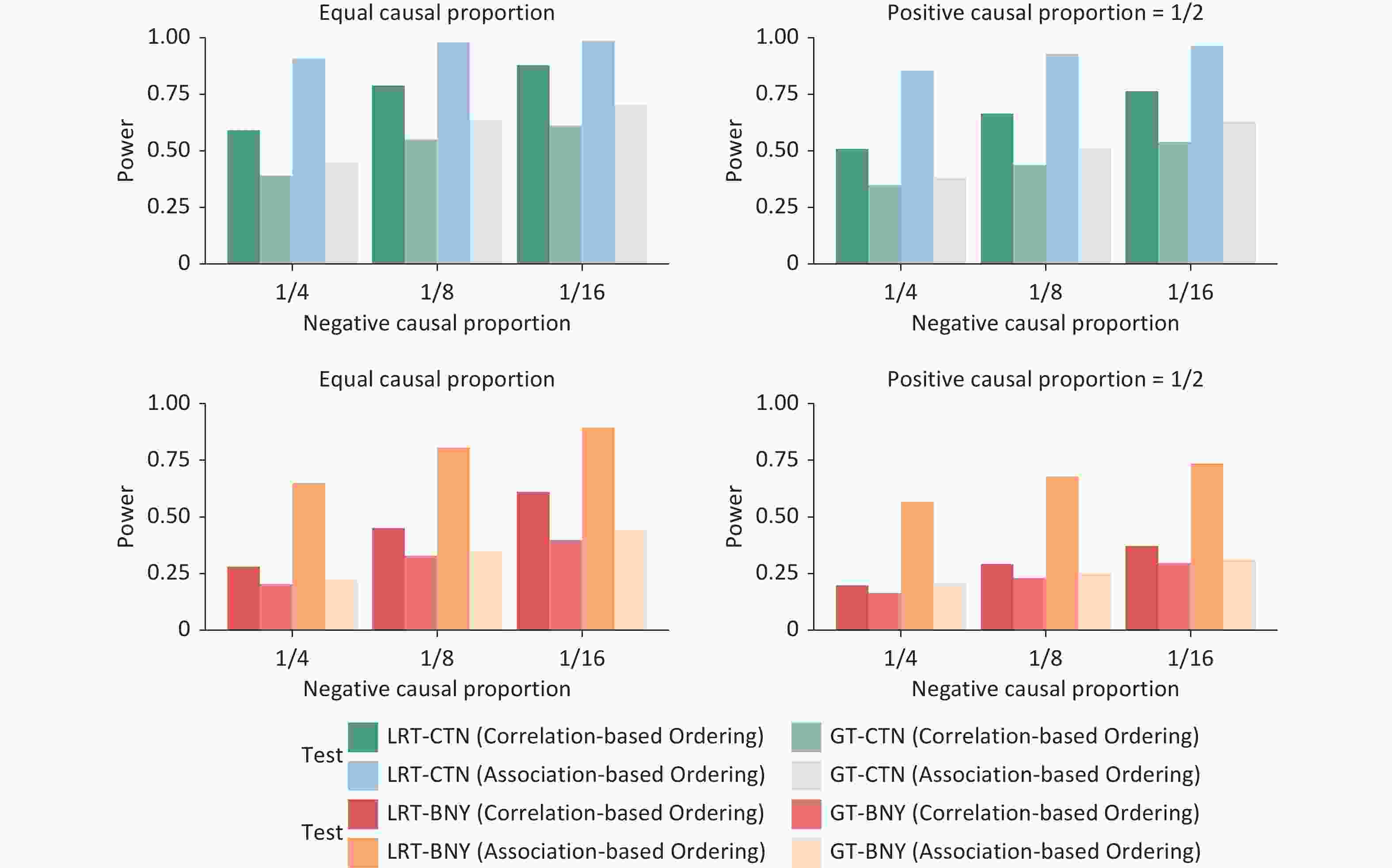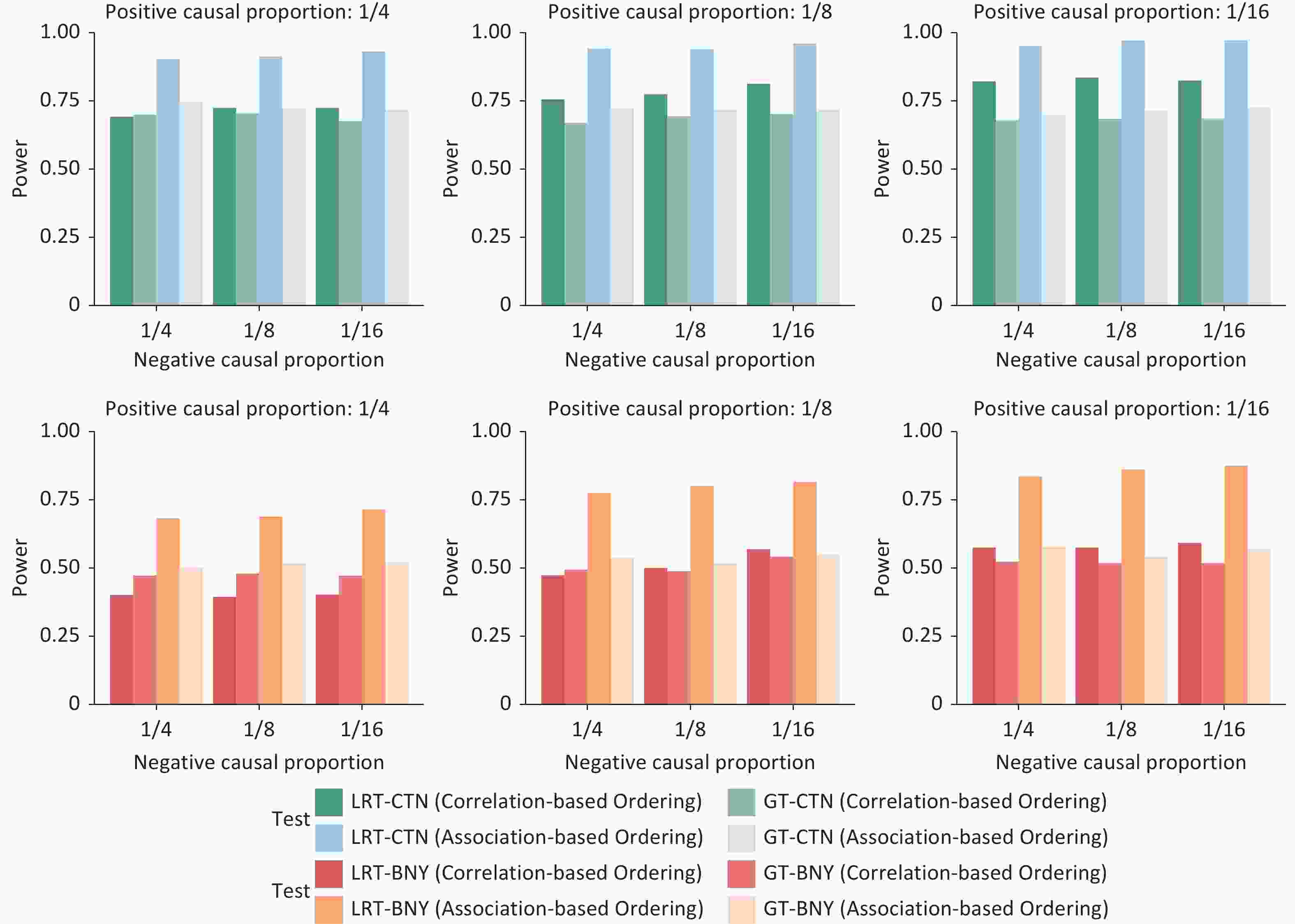 (BNY)Association based ordering 1,000 0.05 0.055 0.051 0.058 0.051 0.056 0.050 0.059 0.050 0.01 0.013 0.010 0.012 0.010 0.013 0.011 0.013 0.010 1,500 0.05 0.052 0.050 0.059 0.051 0.055 0.051 0.058 0.050 0.01 0.012 0.010 0.013 0.012 0.013 0.011 0.013 0.010 2,000 0.05 0.054 0.051 0.055 0.051 0.056 0.049 0.057 0.050 0.01 0.012 0.011 0.011 0.010 0.013 0.009 0.013 0.010 Correlation based ordering 1,000 0.05 0.052 0.044 0.049 0.051 0.042 0.041 0.055 0.031 0.01 0.012 0.011 0.014 0.011 0.010 0.008 0.008 0.002 1,500 0.05 0.053 0.055 0.052 0.049 0.048 0.054 0.053 0.050 0.01 0.008 0.011 0.011 0.009 0.011 0.012 0.011 0.010 2,000 0.05 0.053 0.042 0.053 0.051 0.053 0.055 0.055 0.047 0.01 0.013 0.008 0.011 0.012 0.008 0.009 0.008 0.008 Note. LRT, likelihood ratio test; GT, global test; CTN, continuous; BNY, binary. GFLM, generalized functional linear model. Both LRT and GT generally maintain type I error rates close to the nominal significance level $ \alpha $, with GT exhibiting a more conservative tendency. Under association-based ordering, both tests maintain stable control with rates ranging from 0.049–0.059 at $ \alpha =0.05 $. Correlation-based ordering showed slightly more variability in the control group, particularly for the GT with a smaller sample size. The GT was insensitive to the degree of dimensionality reduction, whereas the LRT tended toward an inflated type I error as the number of mixture exposures increased. For LRT, the robustness of testing continuous outcomes appeared slightly superior to that of binary outcomes, whereas GT demonstrated comparable control across both outcome types. In summary, these findings suggest that the GT provides a more robust testing method for GFLM, maintaining better type I error control across various scenarios of dimensionality outcome types and ordering mechanisms.