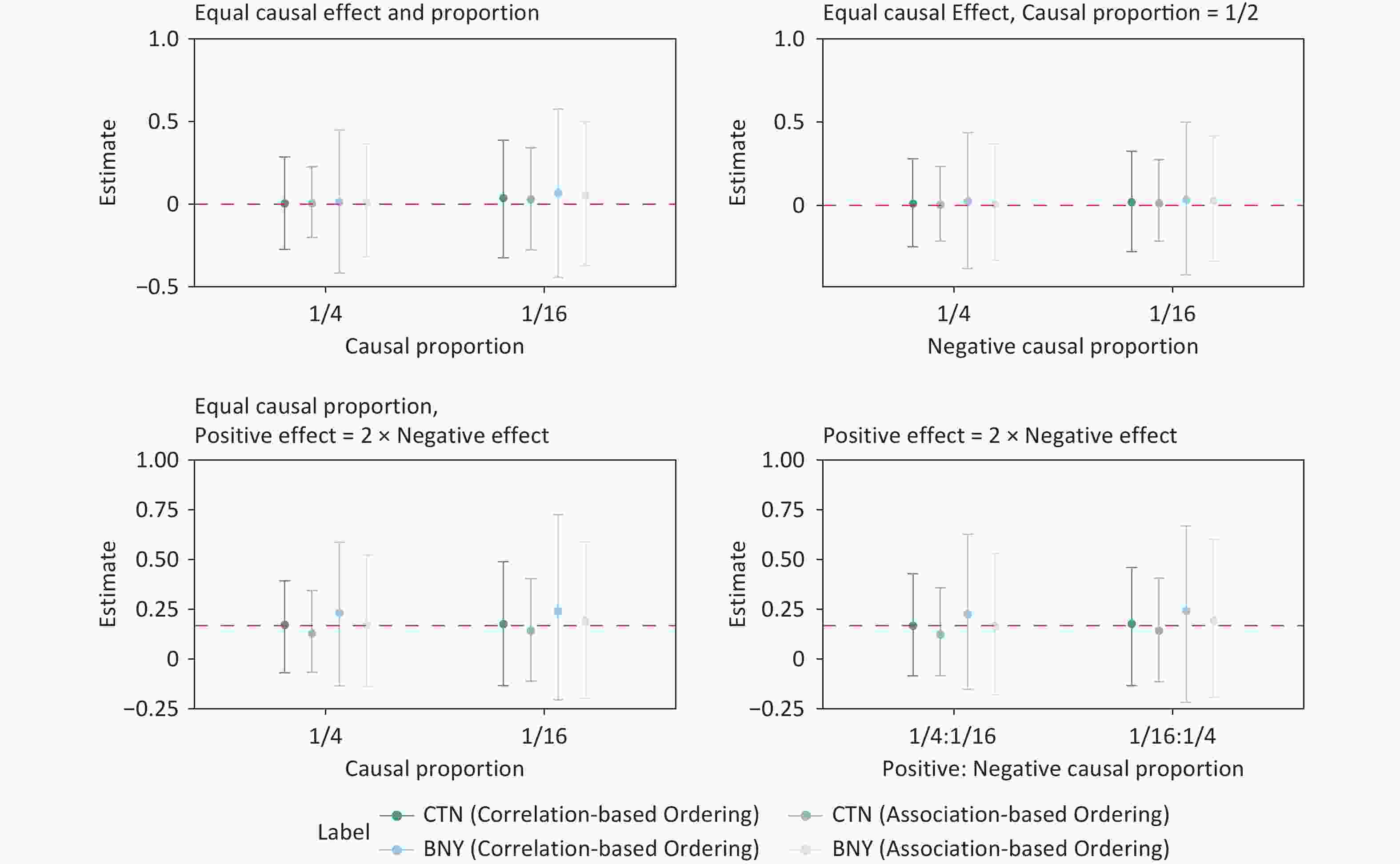 $$ \begin{array}{c}E\left({y}_{i}\right)={\alpha }_{0}+{w}_{1}{Z}_{1i}+{w}_{2}{Z}_{2i}+{w}_{3}\sum _{i=1}^{{m}_+}{v}_{i}{p}_{i}-{w}_{4}\sum _{j=1}^{{m}_-}{u}_{j}{q}_{j}+{ϵ}_{i}, \end{array} $$ (11) in which $ {Z}_{1i}~N\left(0, 1\right) $ and $ {Z}_{2i}~Bernoulli\left(0.5\right) $ are continuous and binary covariates, respectively; $ {m}_{+} $ and $ {m}_{-} $ are the numbers of two sets of causal exposures $ {p}_{i} $ and $ {q}_{j} $ with weights $ {v}_{i} $ and $ {u}_{j} $ restricted to $ \sum _{i=1}^{{m}_{+}}{v}_{i}=\sum _{j=1}^{{m}_{-}}{u}_{j}=1 $; $ {w}_{k}\in \left[0, 1\right) $ with $ \sum _{k=1}^{4}{w}_{k}=1 $ are the effect sizes of the corresponding terms; and $ {ϵ}_{i}~N(0, 1) $ are random errors. In Model (7), the negative sign of $ {w}_{4} $ indicates that $ {q}_{j} $ represents exposure with negative effects on the outcome. Given the mutual exclusivity of $ {p}_{i} $ and $ {q}_{j} $, this model assumes a unidirectional association between any single exposure and outcome. The proportion of null-effect exposures can be controlled by adjusting the magnitudes of $ {m}_{+} $ and $ {m}_{-} $. Therefore, $ {w}_{3} $ and $ {w}_{4} $ represent the cumulative positive and negative exposure effects, respectively, and their difference $ {w}_{3}-{w}_{4} $ denoting the overall mixture exposure effect. By setting $ {\alpha }_{0}=\mathrm{log}\left(0.25\right) $, corresponding to a 20% incidence rate, the continuous outcome is generated by $ {y}_{i}~N\left(E\left({y}_{i}\right), 1\right) $, and the binary outcome is generated by $ {y}_{i}~Bernoulli\left(\mathrm{exp}\left\{E\left({y}_{i}\right)\right\}/\left(\mathrm{exp}\left\{E\left({y}_{i}\right)\right\}+1\right)\right) $.