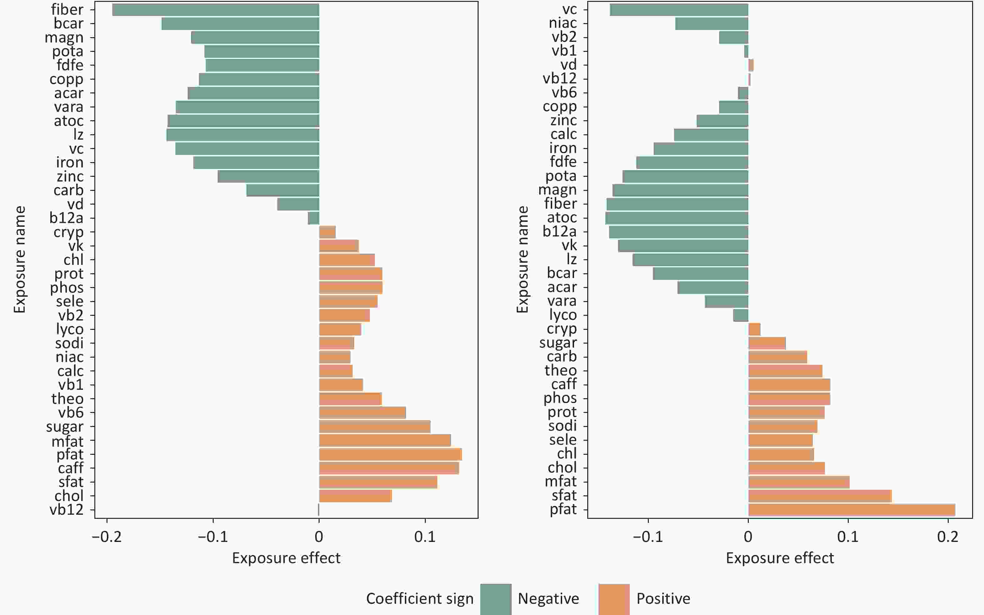 Figure 8. Nutrient effect estimates under association-based and correlation-based ordering assumptions (NHANES 2011–2016).