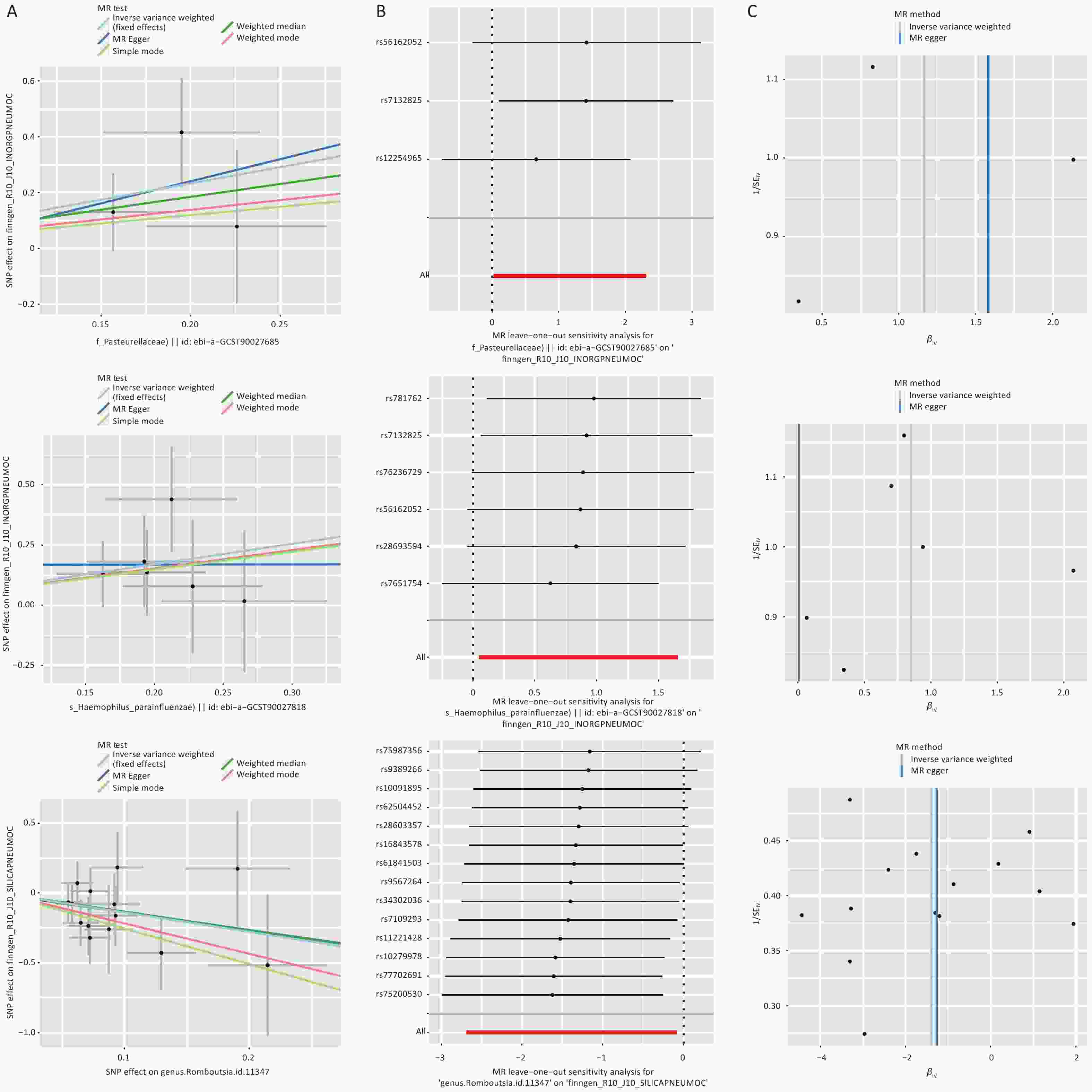 In the MiBioGen study, the number of SNPs used as IVs for each microbial taxon ranged from 3 to 21, totaling 2,353 SNPs included in the follow-up study. We identified 2, 9, and 10 gut microbial taxa associated with the risk of asbestosis, inorganic pneumoconiosis, and silicosis, respectively. Among the protective factors against asbestosis, we identified Dorea, Eubacterium rectale group, Clostridia class, Butyricicoccus genus, and Marvinbryantia genus. Conversely, Eubacterium ruminantium group, Lachnospira genus, Butyrivibrio genus, and Alistipes genus were associated with an increased risk of asbestosis. Regarding inorganic pneumoconiosis, elevated levels of Marvinbryantia and Olsenella genera were linked to a decreased disease risk, while Catenibacterium, Holdemania, and Dialister genera were associated with an increased risk. Similarly, increased levels of Methanobrevibacter genus, Methanobacteria class, Methanobacteriales order, and Methanobacteriaceae family, alongside Marvinbryantia genus, were found to reduce the risk of inorganic pneumoconiosis. Conversely, increased levels of Catenibacterium, Holdemania, and Dialister were correlated with a higher disease risk. In the context of silicosis, genus.unknowngenus.id.1868, Dialister genus, and Romboutsia genus, all classified under Erysipelotrichales order, Erysipelotrichaceae family, and Erysipelotrichia class, exhibited a positive correlation with disease risk. In contrast, Adlercreutzia genus, Ruminococcaceae UCG002 genus, Mollicutes class, and Tenericutes phylum demonstrated a negative correlation with silicosis risk (Figure 2 and Supplementary Tables S2–S4). Similarly, in an independent analysis, we employed a total of 3,974 SNPs as instrumental variables, with the number of strongly associated SNPs per microbial colony ranging from 3 to 19. After excluding weak instrumental variables, the mean F-statistic value was 21.56. We identified 10 functional pathways and 10 gut microbial abundances causally linked to asbestosis, 10 pathways and 12 gut microbial abundances associated with inorganic pneumoconiosis, and 8 pathways and 4 gut microbial abundances causally linked to silicosis (Supplementary Tables S5–S7).