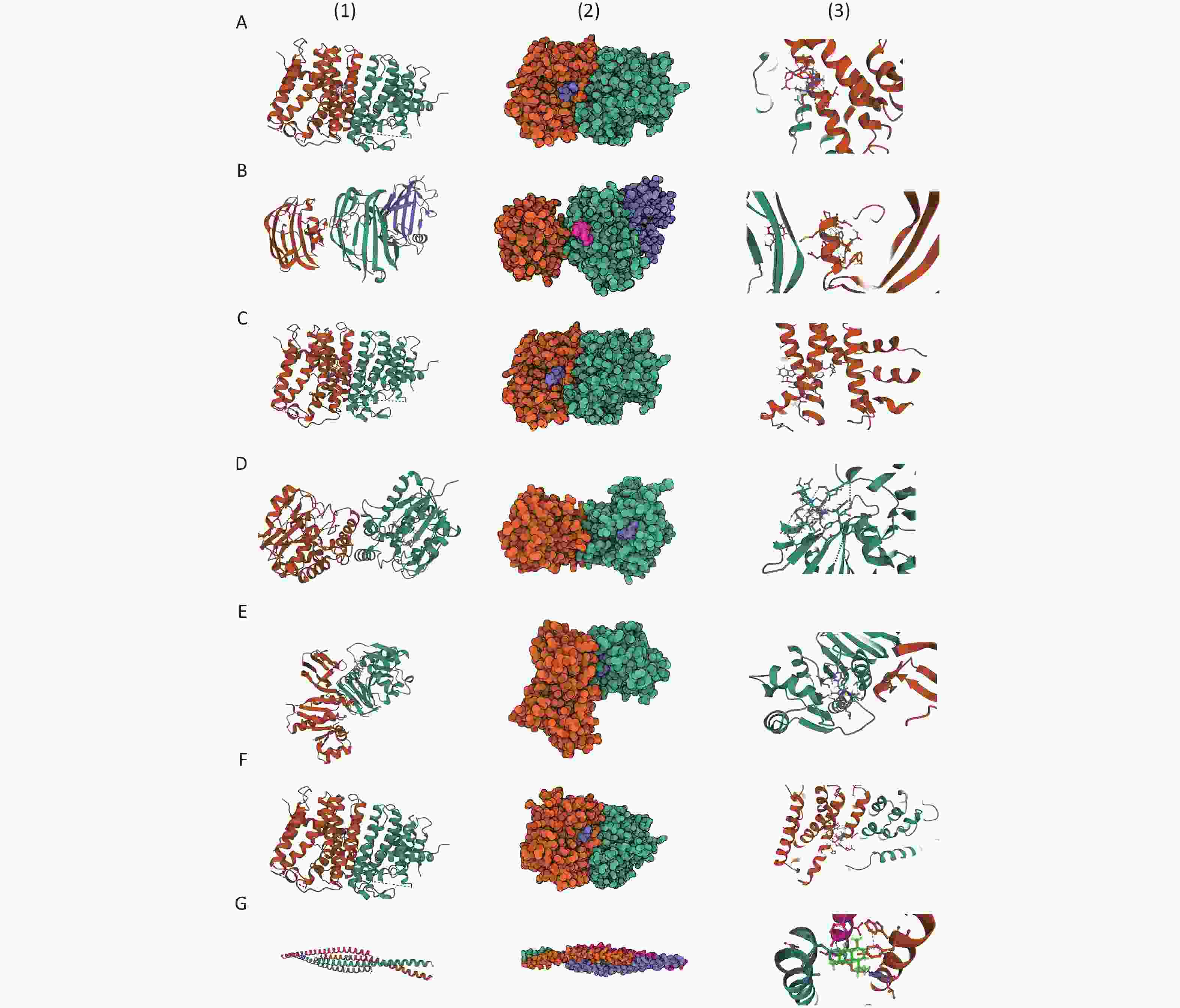 Figure 6. Prediction of potential drugs candidates and molecular docking analysis. (A) GGPS1-Zoledronic acid; (B) GGPS1-Minodronic acid; (C) GGPS1-Ibandronate; (D) PPT1-Palmitic Acid; (E) GM2A-Lauric acid; (F) TPK1-Thiamine; (G) VIM-Artenimol.