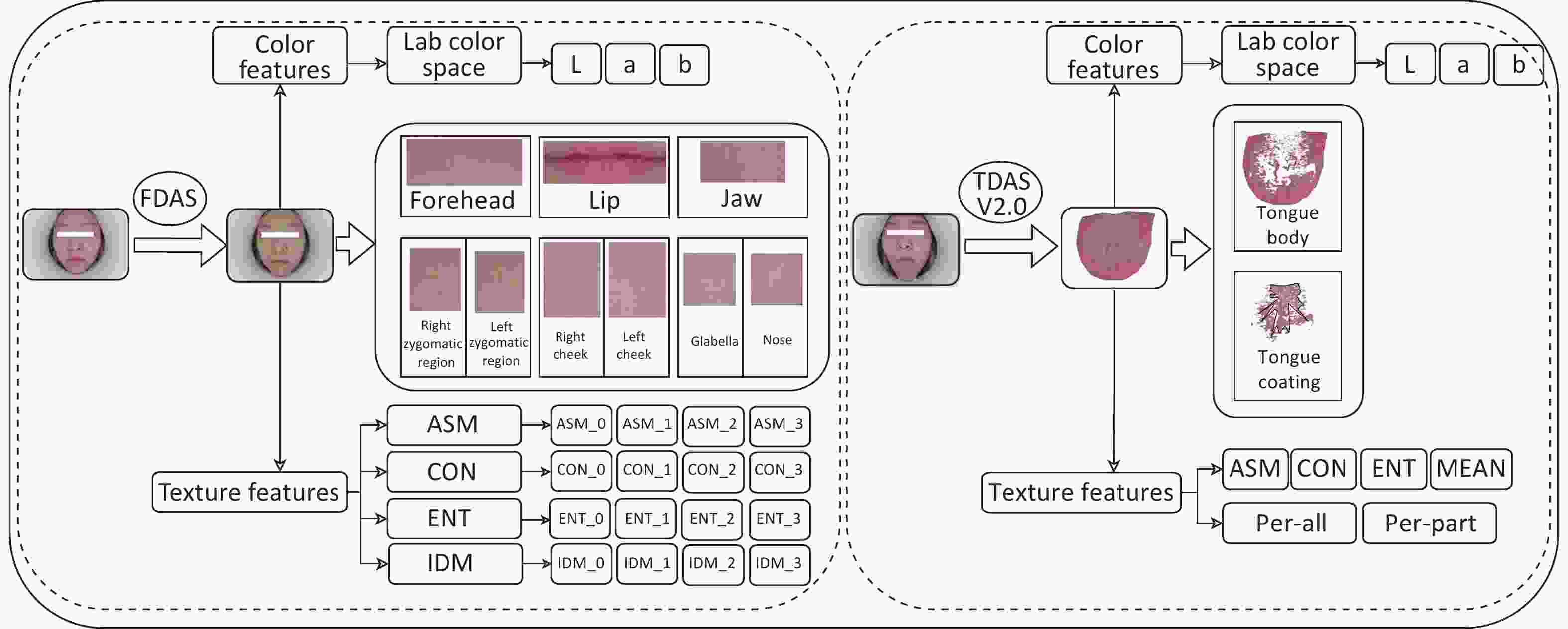 In this study, the color and texture features of the tongue body (TB) and tongue coating (TC) were extracted using Tongue Diagnosis Analysis System version 2.0 (TDAS v2.0), a tongue diagnosis analysis system developed by the Intelligent Diagnosis Technology Research Team at Shanghai University of Traditional Chinese Medicine (Figure 2). The color features were expressed using the Lab color space, where the L-value represents lightness, with a higher L-value indicating a brighter color. The a-value corresponds to the red-green axis, where a positive value indicates redness (higher values mean deeper red) and a negative value indicates greenness (lower values mean deeper green). The b-value pertains to the yellow-blue axis, where a positive value signifies yellowness (higher values indicate deeper yellow) and a negative value denotes blueness (lower values mean deeper blue). The color features included TB-L, TB-a, TB-b, TC-L, TC-a, and TC-b. Texture features included contrast (CON), angular second moment (ASM), entropy (ENT), and mean value (MEAN). Among them, the larger the values of texture features CON, ENT, and MEAN, and the smaller the ASM value, the rougher the tongue texture[37]. In addition, the tongue coating indices for all parts and for each part were calculated based on the pixel values. Facial color and texture features were extracted using Face Diagnosis Analysis System (FDAS) (Figure 2). The extraction range for the facial image indicators encompassed the entire face and nine specific facial areas. Based on the gray-level co-occurrence matrix (GLCM), certain feature quantities were extracted to describe the texture feature information of the facial image[38,39]. The feature quantities included ASM, CON, ENT, and inverse different moment (IDM). The facial color and tongue variables used in the analysis are shown in Supplementary Tables S1–S2. Statistical analysis was performed on the facial and tongue image features of the two groups.