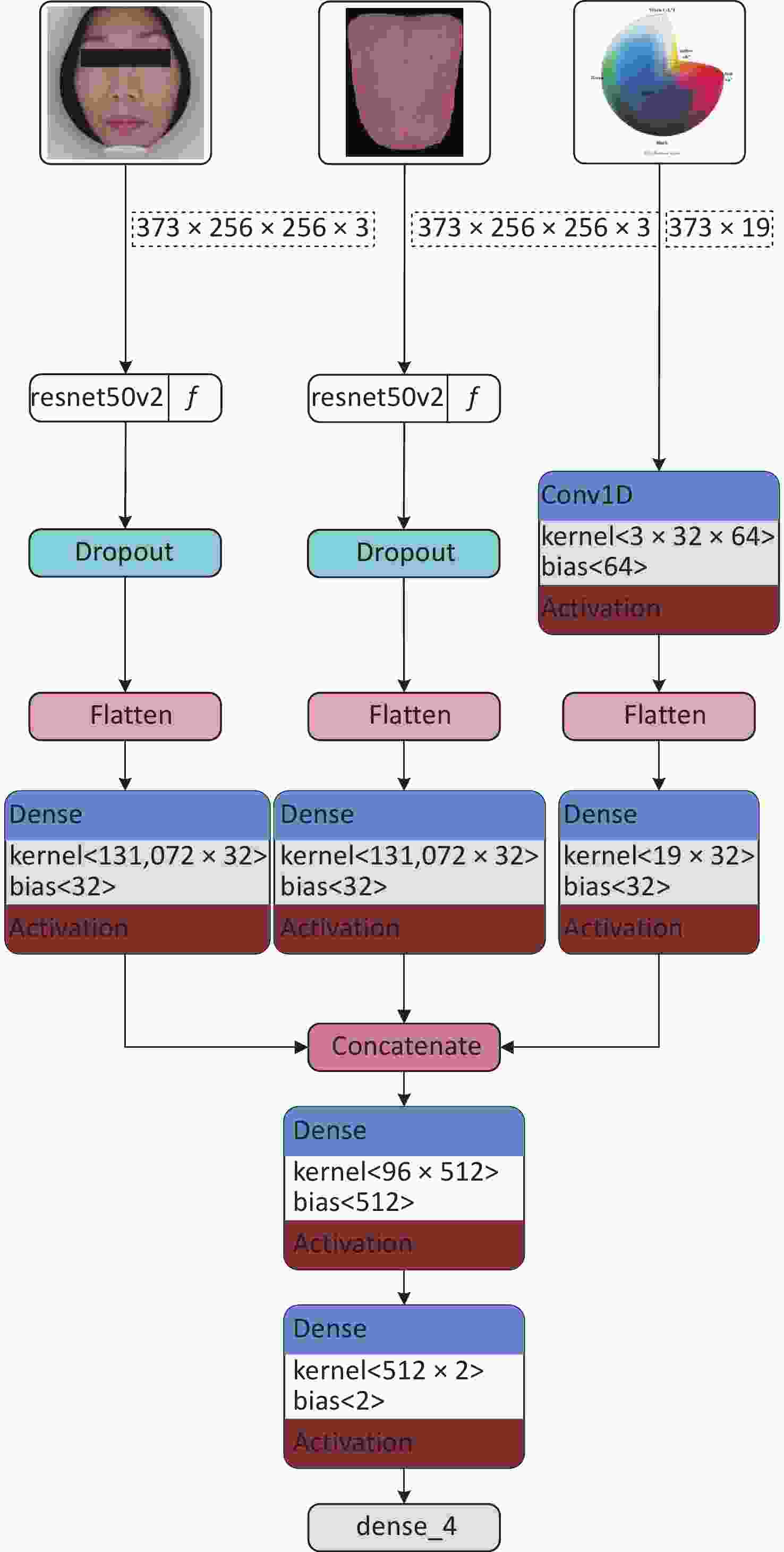 The anemia and healthy control groups were classified with ResNet as the primary deep learning structure. The ResNet50V2 model was used to extract features from facial and tongue images segmented using the TDAS software. The purpose of this step was to extract representative features from the images to support subsequent classification tasks. To fully utilize the color space information, researchers organized the color and texture features of faces and tongues after LASSO analysis into a one-dimensional array. These features, excluding the interference of multicollinearity, reflected the inherent differences between women with and without anemia in terms of facial and tongue color and texture. Conv1D was employed to extract core features from these color and texture characteristics, further identifying the most useful information for classification. Next, the image feature information extracted by the ResNet50V2 model was fused with the color-space features extracted by the Conv1D model. This step was achieved through a concat operation by fusing features from three dimensions at the feature level. This feature fusion method can fully utilize image, color, and texture information, thereby improving classification accuracy. Finally, a fully connected layer is used to complete the classification. The fully connected layer can map the previous feature fusion results to different classification labels, enabling decision making for classifying the anemia and healthy control groups. During the classification process, the softmax function was adopted as the activation function, which can output a probability value for each category indicating the likelihood of a sample belonging to that category. The implementation path of this model is illustrated in Figure 3.