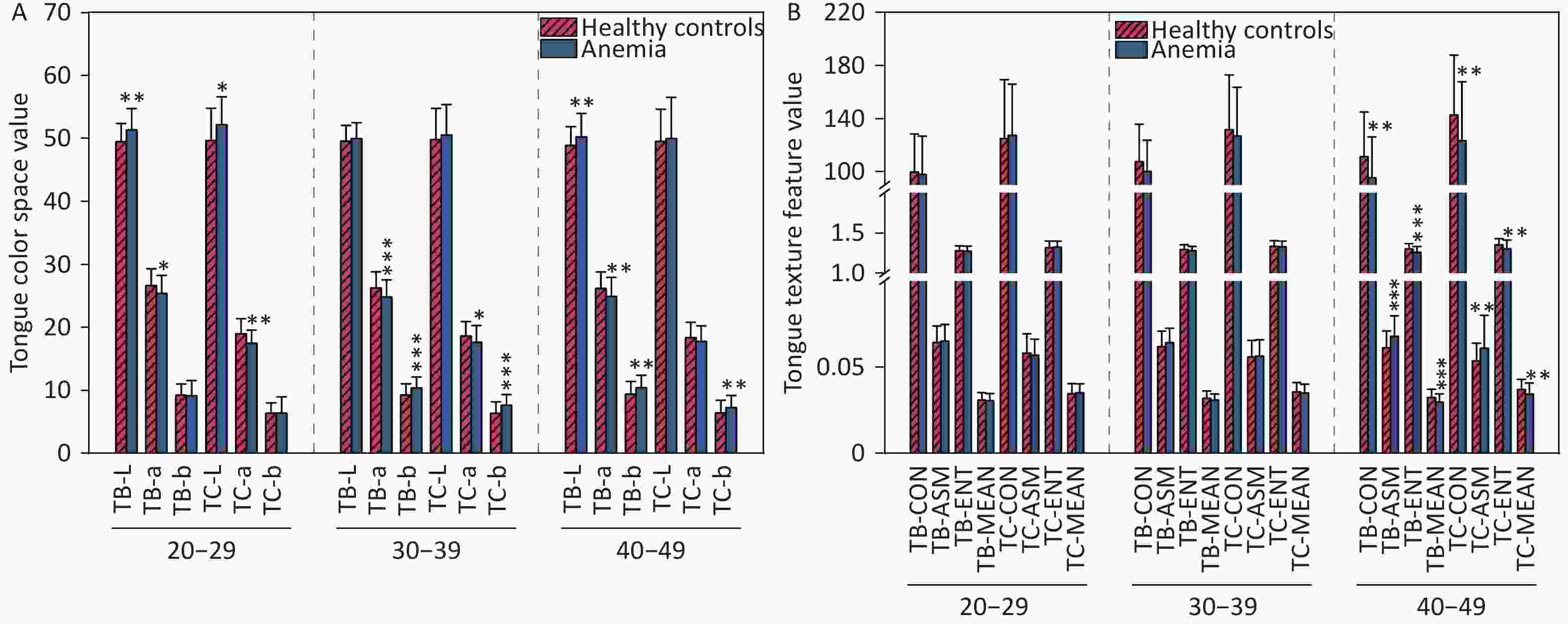 Comparison of tongue features between the anemia and healthy control groups indicated significant differences in the color and texture of the tongue body and tongue coating (P < 0.05). With regard to color, the L-values of tongue quality and tongue coating in the anemia group across all age groups were greater than those in the healthy control group. The a-values of the anemia group were lower than those of the healthy control group, and the b-values of the anemia group were greater than those of the healthy control group. There were also differences in the texture characteristics of tongue quality and tongue coating in the 40–49-year age group, specifically manifested in the texture characteristics of TB-CON, TC-CON, TB-ENT, TC-ENT, TB-MEAN, and TC-MEAN, which were lower in the anemia group than in the healthy control group. TB-ASM and TC-ASM texture indicators were greater in the anemia group than in the healthy control group. No difference in par-All and per-Part was noted between the anemia group and the healthy control group. The statistical analysis results of tongue data from the two groups are presented in Figure 5 and Supplementary Table S5.