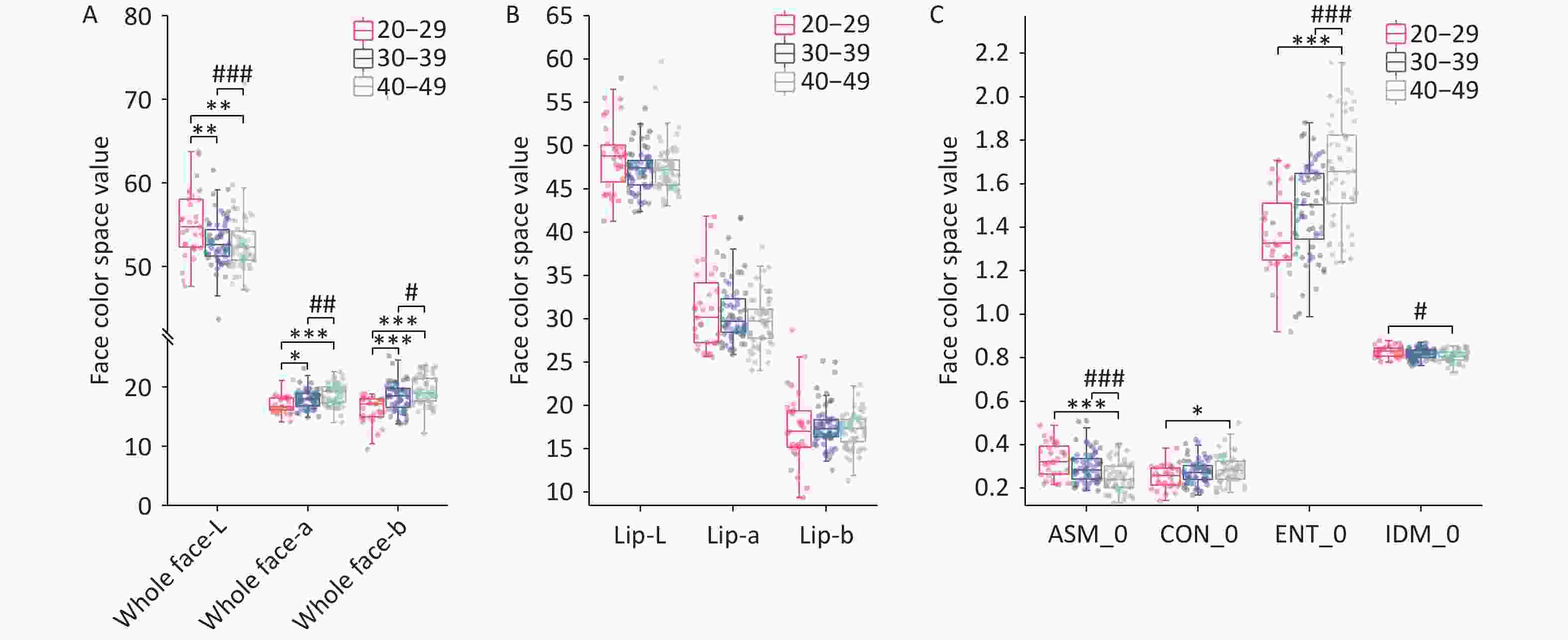 Figure 6. The trend changes in facial image color and texture indicators across different age groups for female anemia patients. (A) Full-face color indicators. (B) Lip color indicators. (C) Facial texture indicators. Compared with the 20–29 age group, *P < 0.05; **P < 0.01; ***P < 0.001; Compared with the 30–39 age group, #P < 0.05; ##P < 0.01; ###P < 0.001. ASM, angular second moment; CON, contrast; ENT, entropy; IDM, inverse different moment.