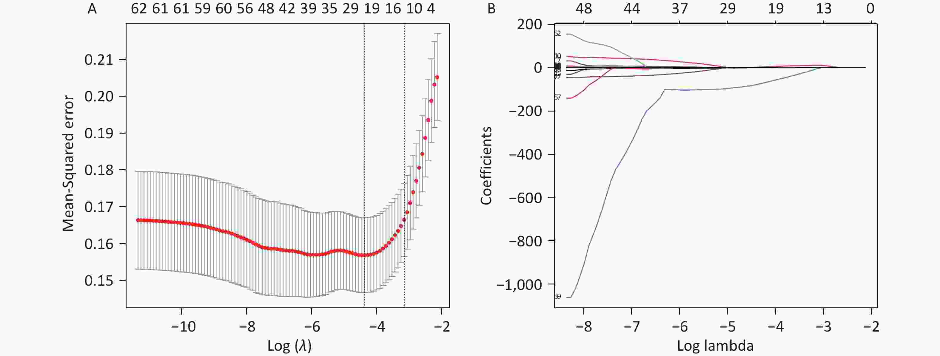 Figure 7. The results of variable selection using LASSO regression. (A) A plot of Log(λ) versus the number of selected variables. The vertical axis represents the minimum mean squared error, the upper horizontal axis indicates the number of predictor variables, and the lower horizontal axis corresponds to the Log(λ) value associated with the λ parameter. Vertical dashed lines are drawn at the points of minimum mean squared error (λ = 0.015) and the standard error of the minimum distance (λ = 0.043). (B) A plot of Log(λ) versus the coefficient values of the variables. The vertical axis shows the coefficient values of the predictor variables, the top horizontal axis indicates the number of predictor variables, and the bottom horizontal axis corresponds to the Log(λ) associated with the λ parameter.