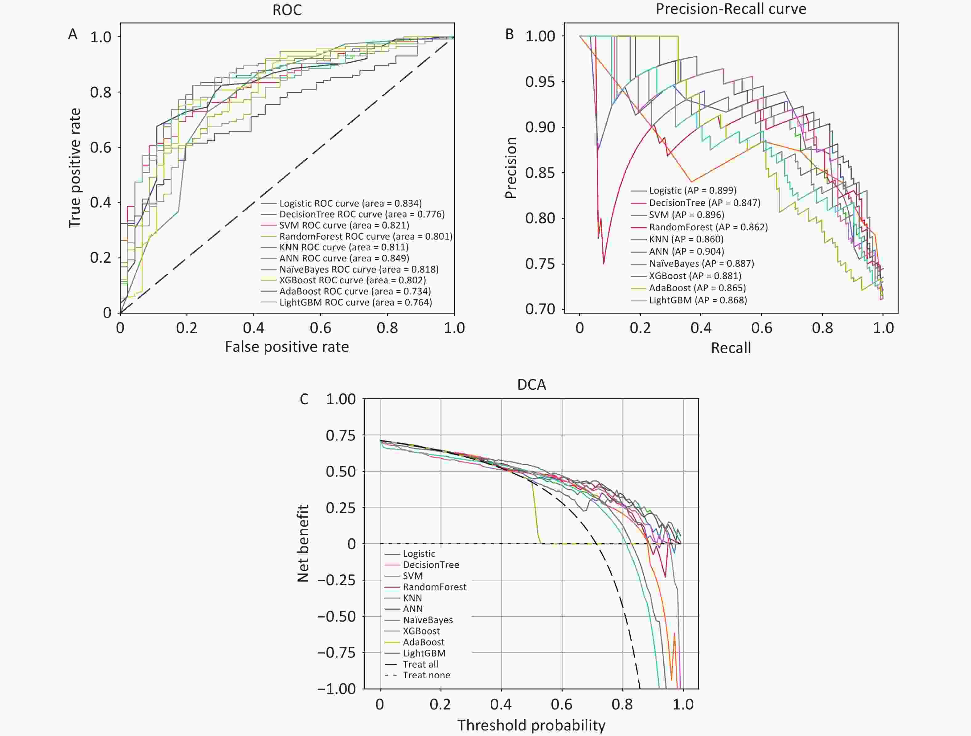 Figure 8. Comprehensive analysis of test set results for different machine learning algorithms. (A) ROC curve and AUC for the test set. All participants were divided into training and test sets at a 7:3 ratio. (B) the PR curve and AP value for the test set, with Precision on the y-axis and Recall on the x-axis. A PR curve closer to the top right corner indicates better model performance. In cases where the PR curves of different prediction models cross, the AP value under the PR curve is used for further quantification and comparison of different models. (C) DCA for the test set, where the x-axis represents threshold probability, and the y-axis represents net benefit. The two dashed lines above the x-axis represent two extreme cases: the light dashed line indicates that all indicators are negative, resulting in a net benefit of 0 for treatment. The dark dashed line represents all prediction indicators being positive, with a net benefit represented by a negative slope diagonal line. The remaining solid lines represent different models. The further the solid line is from the two extreme lines and the larger the area it forms, the better the clinical model’s effectiveness.