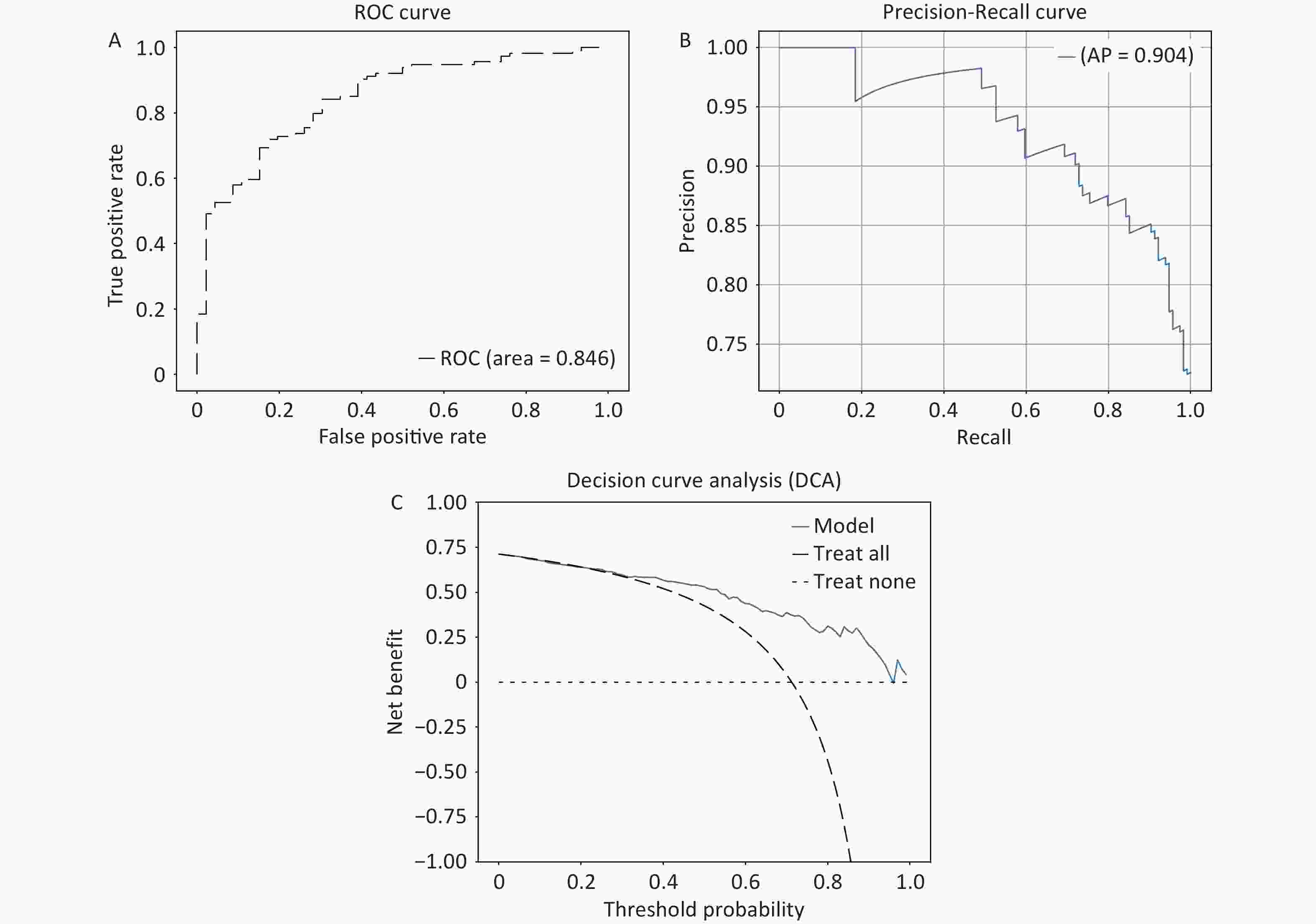 The above parametric models were trained and tested, and the importance of the test set indicators in the different models was analyzed to select the optimal model. The anemia screening model was evaluated using the ROC curve, area under the ROC curve (AUROC), precision-recall (PR) curve, and Decision Curve Analysis (DCA). The ROC curve and AUROC can be used to directly assess the ability of the model to distinguish patients with anemia. A larger AUROC indicates better discriminatory power for the prediction model. The PR curve and the area under the PR curve (AP) can be used to comprehensively evaluate precision and recall and are sensitive to the prediction of positive events. They are often used to evaluate models when there are fewer positive events than when there are more negative events. DCA assesses the effectiveness of the prediction model in decision-making by quantifying the net benefit at different threshold probabilities[41].