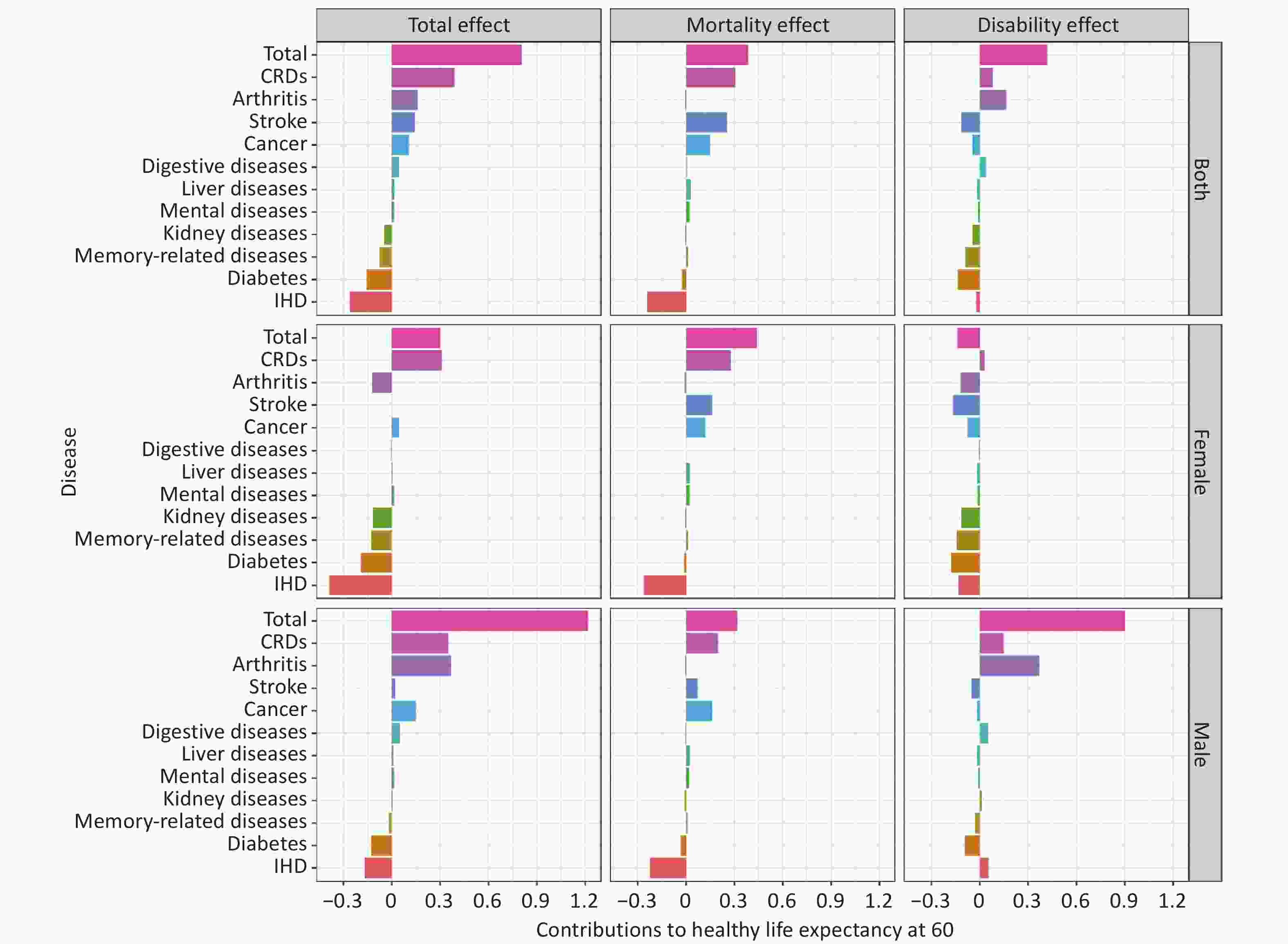 The decomposition results indicated that in both sexes, IHD led to the greatest reduction in HLE60 (−0.27 years), followed by diabetes (−0.16 years), memory-related diseases (−0.08 years), and kidney diseases (−0.05 years). In contrast, CRDs contributed the most to increases in HLE60 (0.39 years), followed by arthritis (0.16 years), stroke (0.14 years), and cancer (0.10 years).