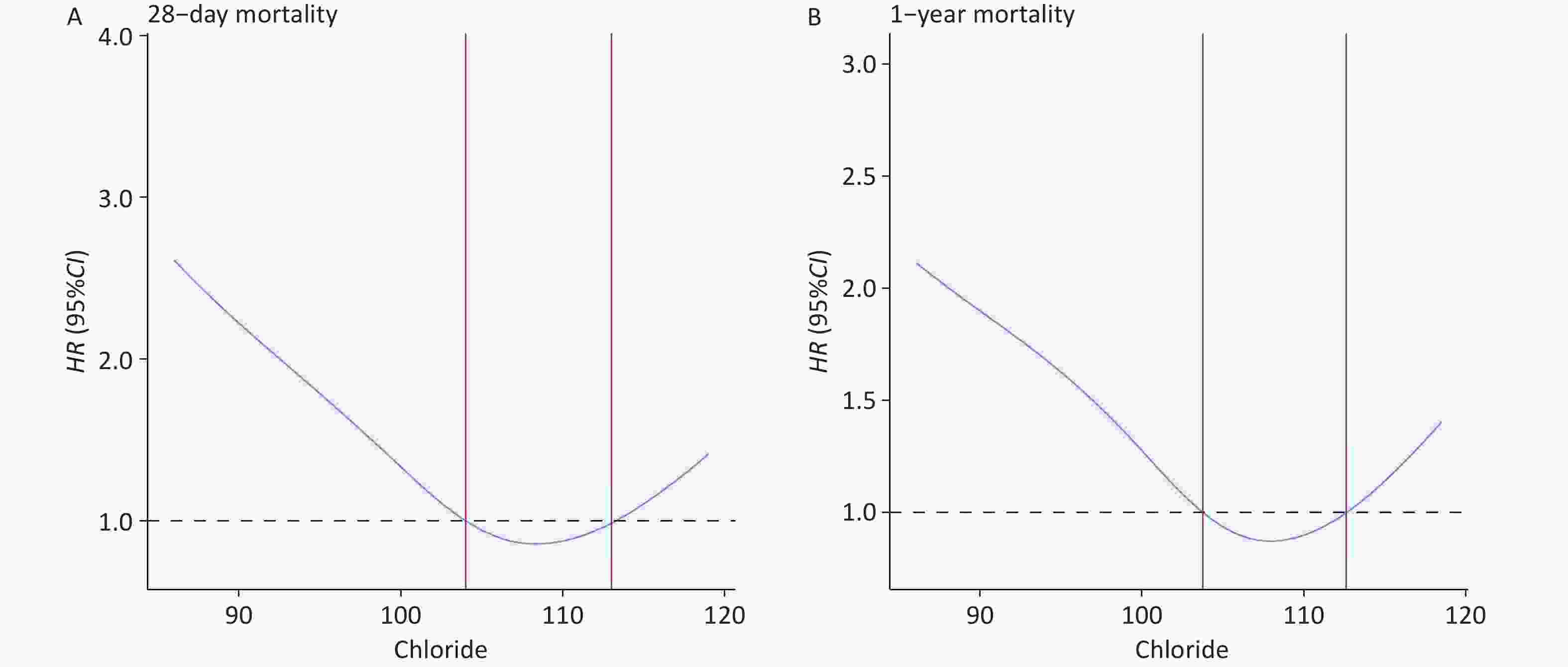 Figure 2. Association between chloride levels and hazard ratio of 28-day (A) and 1-year (B) all-cause mortality. HR, hazard ratio; CI, confidence interval.