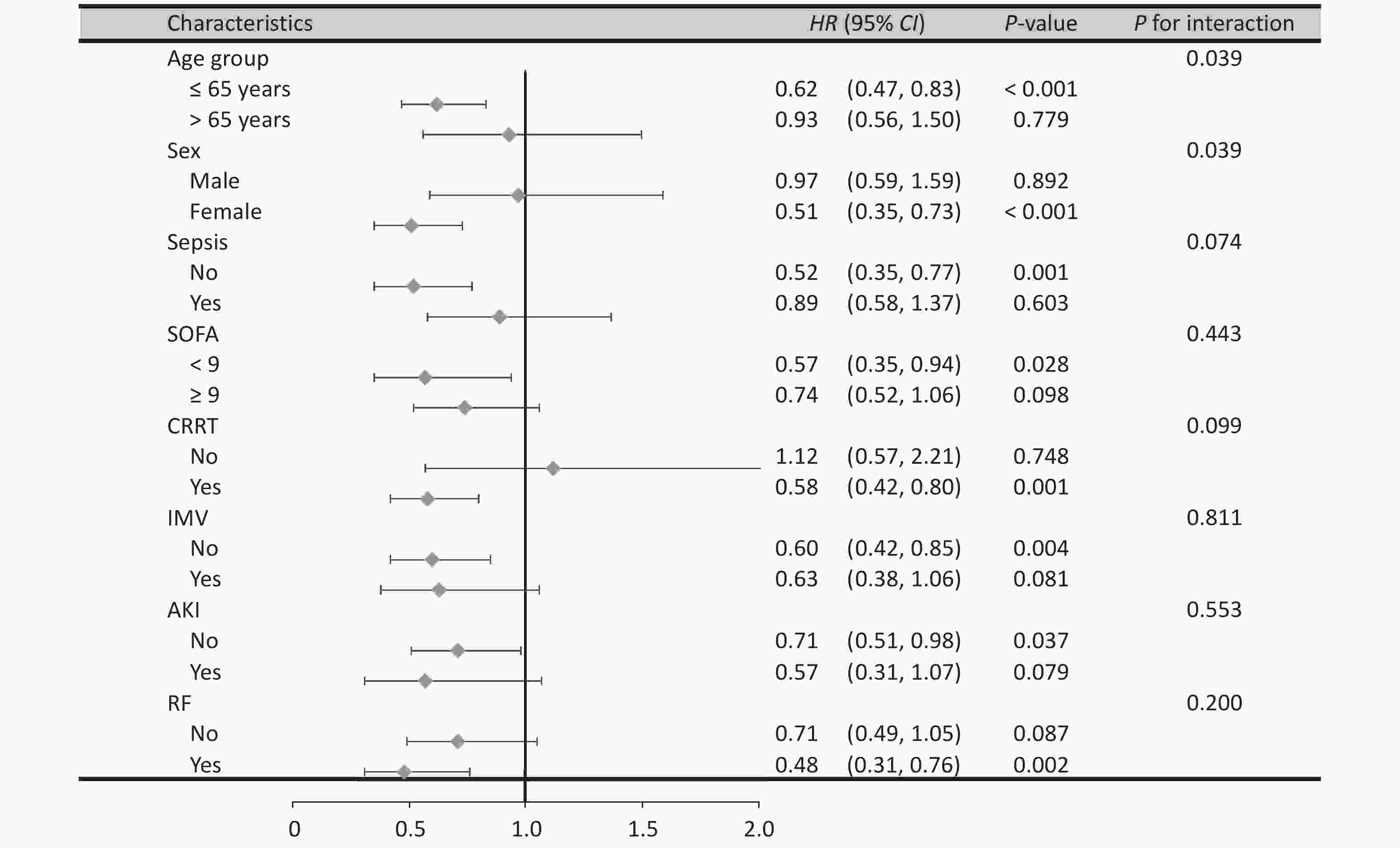 Figure 4. Subgroup analysis of patients with hepatic coma for 28-day mortality rates. HR, hazard ratio; CI, confidence interval; SOFA, Sequential Organ Failure Assessment; CRRT, continuous renal replacement therapy; IMV, invasive mechanical ventilation; AKI, acute kidney injury; RF, respiratory failure.
