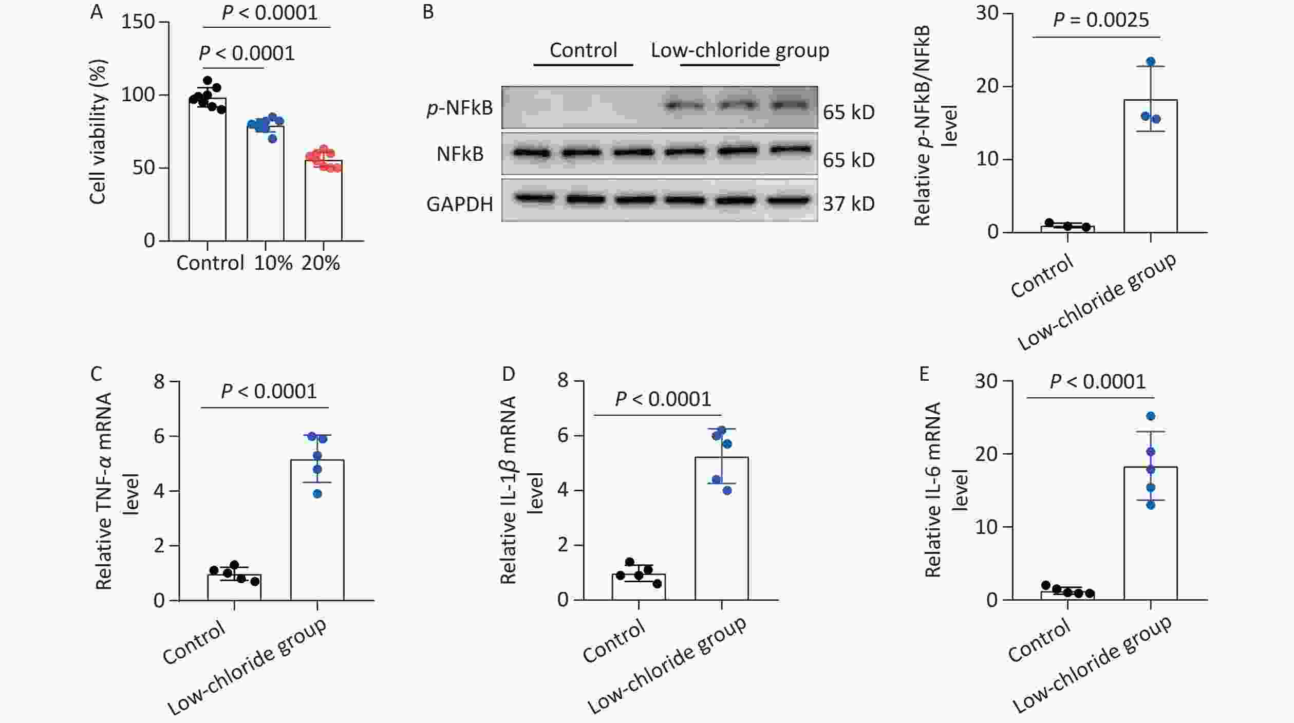 Figure 7. Effects of low-chloride environment on cell viability and the NF-κB inflammatory pathway. (A) Effects of culture media containing different chloride ion concentrations on neuronal cell viability. (B) Expression of p-NF-κB protein in mouse neurons cultured in a medium containing 20% reduced chloride ions. (C) Comparison of TNF-α mRNA expression between the low-chloride group and the normal group. (D) Comparison of IL-1β mRNA expression between the low-chloride and normal groups. (E) Comparison of IL-6 mRNA expression between the low-chloride and normal groups.