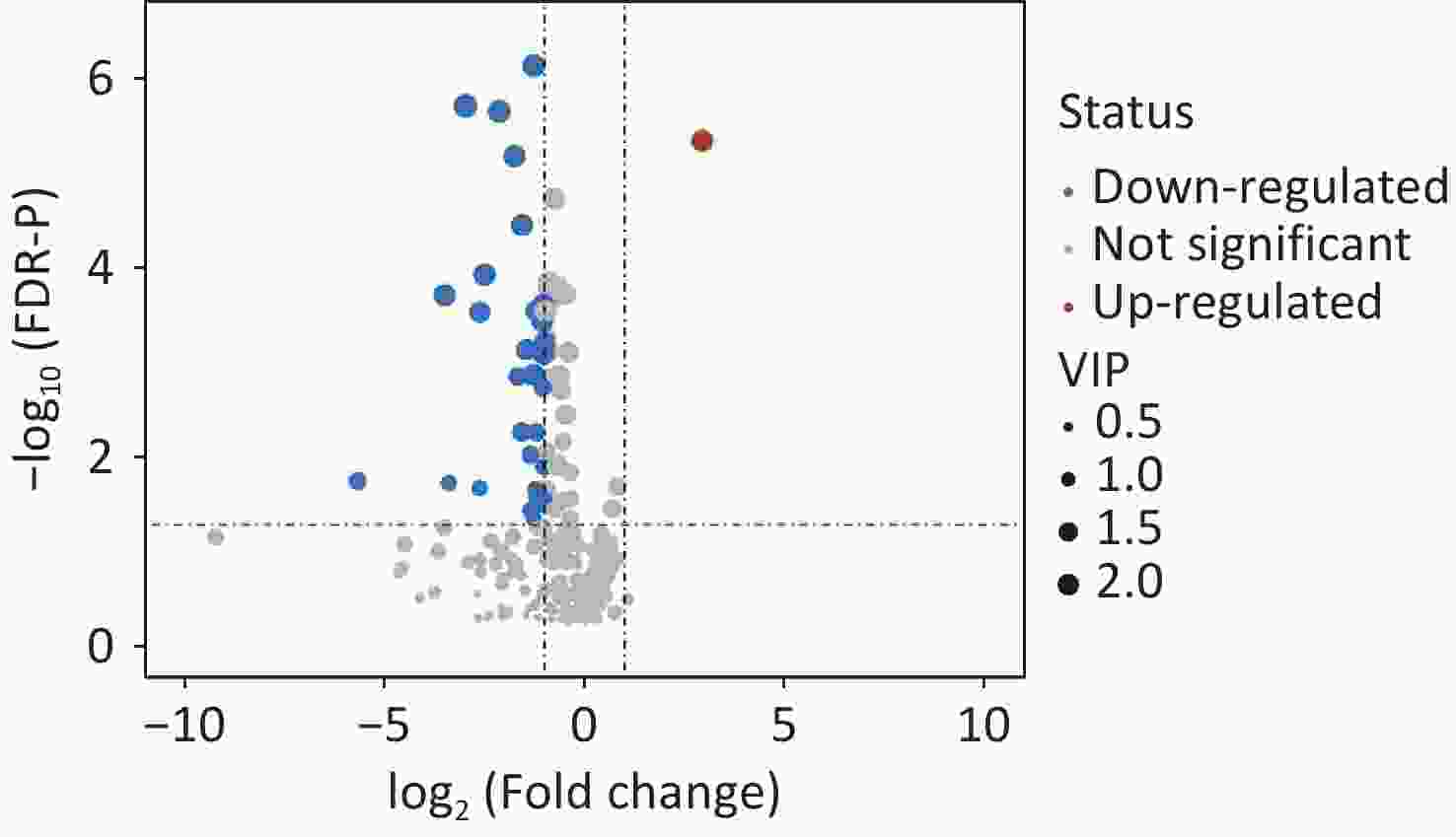 Figure 2. Volcano plot showing the group differences in lipid molecules assayed between IS cases and healthy controls. Dots represent the group comparison results for lipid molecules, with significantly upregulated lipids in red, significantly downregulated lipids in blue, and non-significantly different lipids in gray. The areas of the dots indicate the VIP of the corresponding lipid molecules. VIP, variable influences in projection.