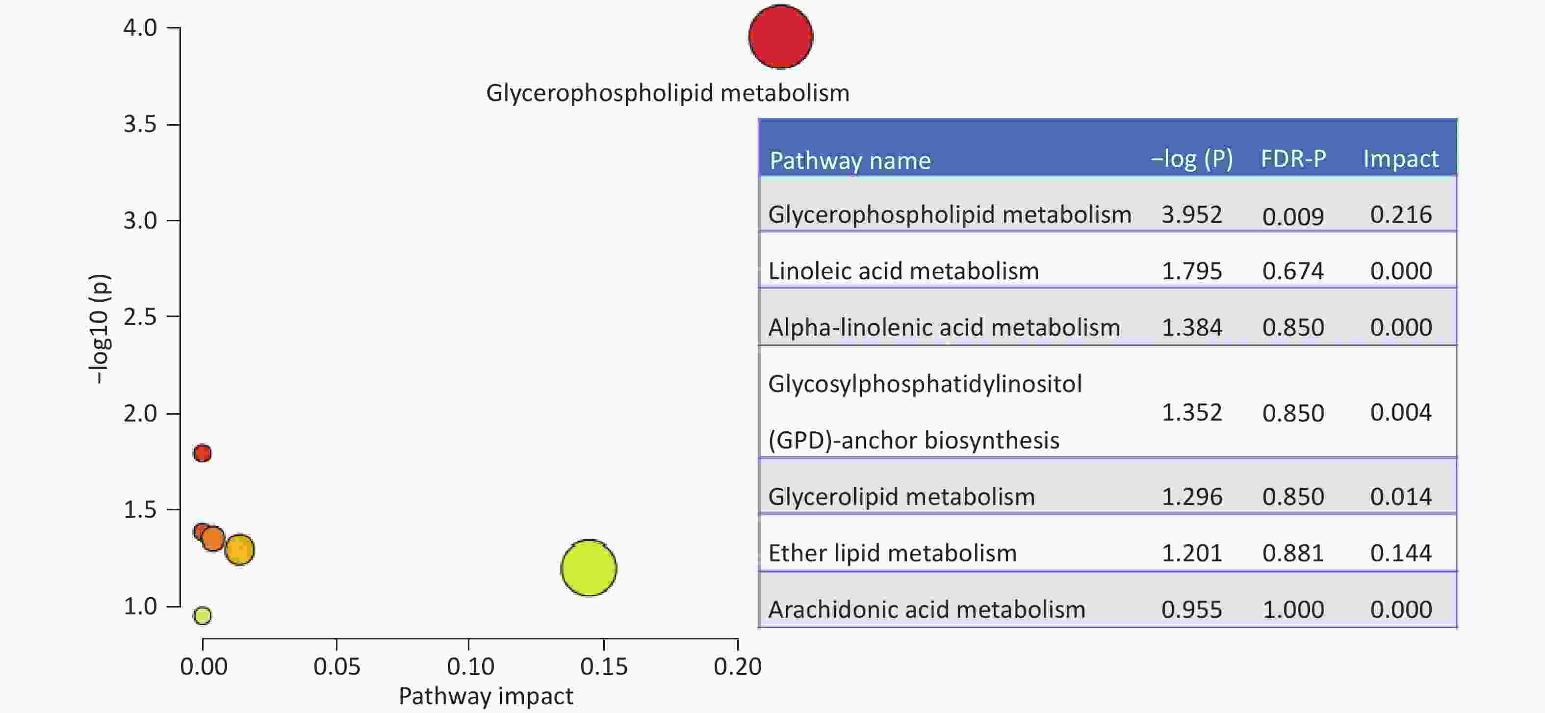 Figure 3. Enriched pathways based on the differential lipid molecules. The impact and statistical P values for the pathways are proportional to node radius and color, respectively. Only glycerophospholipid metabolism showed statistical significance an FDR-P = 0.009 and impact = 0.216. FDR: false discovery rate.