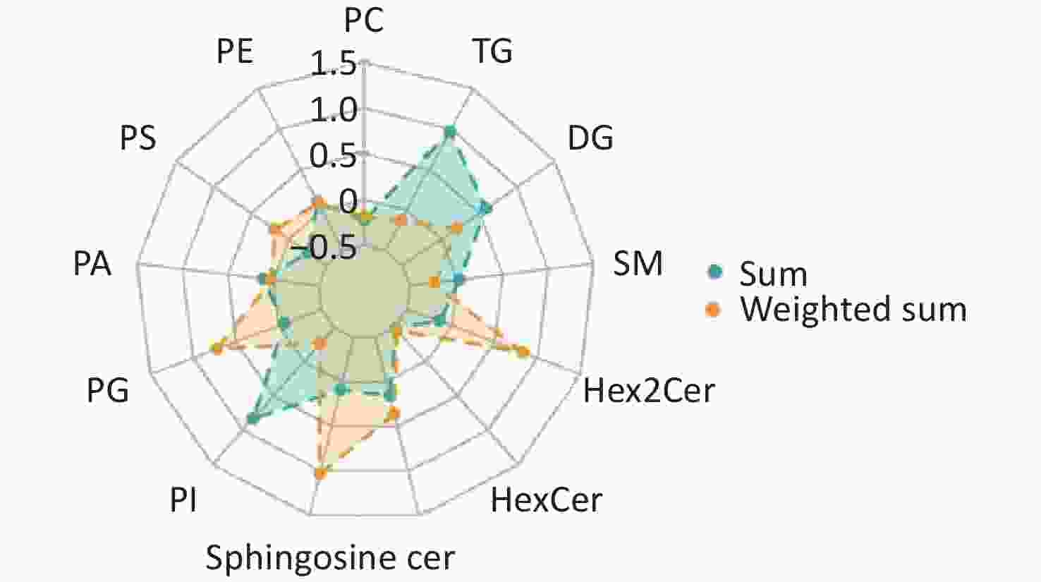Data were processed using an absolute quantitative lipidomics method[15]. In specific, MS raw data files were converted to the mzXML format using the “msconvert” program from ProteoWizard (version 3.0.6150), and processed by the R package XCMS (version 1.41.0). The preprocessed results generated a data matrix consisting of RT, m/z, and peak intensity. The cut-off for the match score was set at 0.8, and minfrac was set at 0.5. Metabolic features detected in less than 50% of the QC samples were discarded. Lipid identification was achieved by spectral matching using an in-house MS/MS spectral library. Absolute quantitation of lipids can be achieved based on the peak area of the identified lipid and the internal standard in a sample. Lipids with missing values in more than 50% of the samples or relative standard deviations > 30% were excluded. The remaining missing values were filled in with half the minimum value of the corresponding lipid molecules.