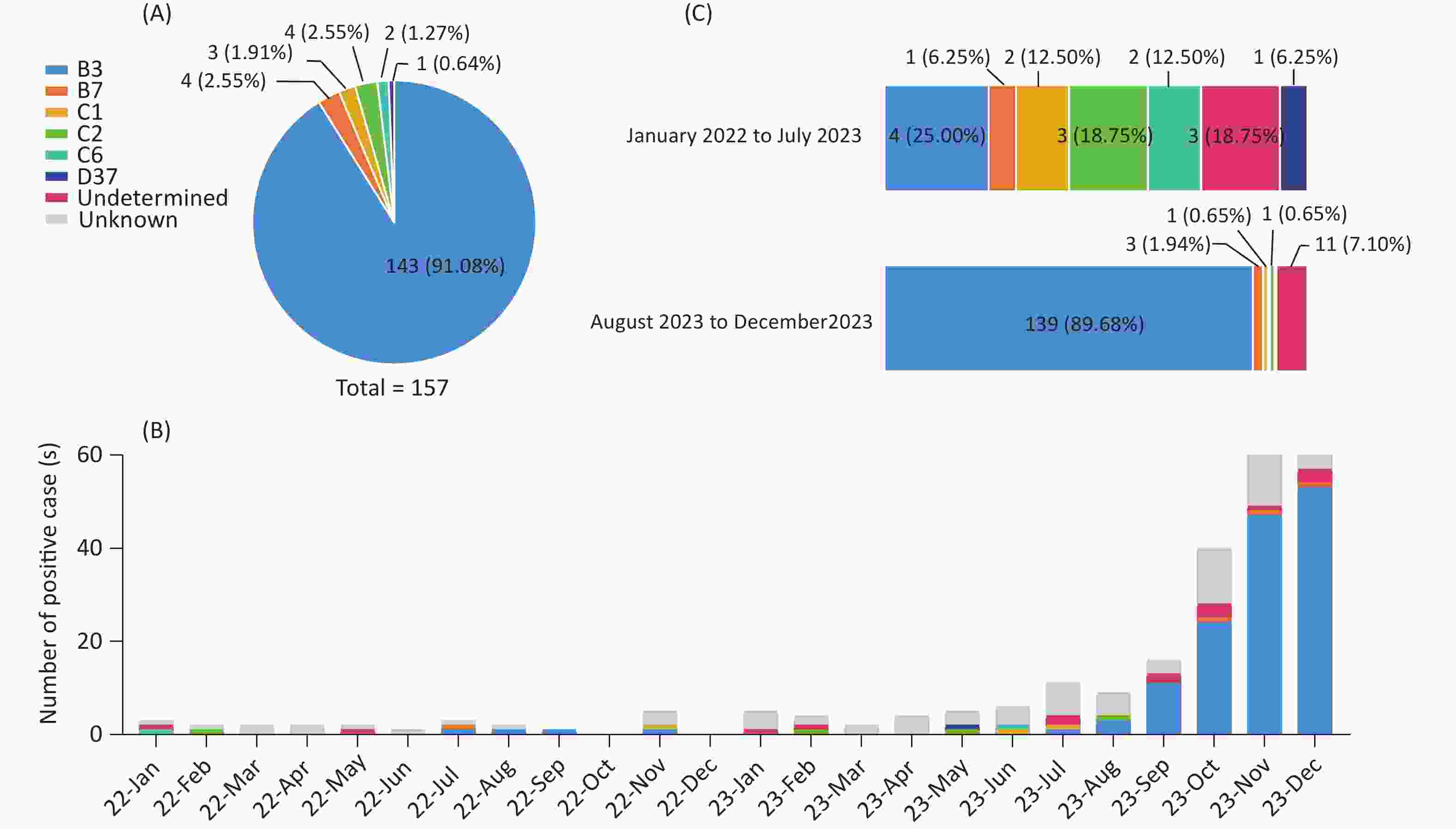 Figure 2. HAdV typing results and distribution of different HAdV types. (A) Successfully typed HAdV cases in a pie chart. (B) Number of positive cases of different HAdV types (2022–2023). (C) Composition of HAdV types in HAdV-positive cases with sequences of penton base, hexon, and fiber genes before and after August 2023.