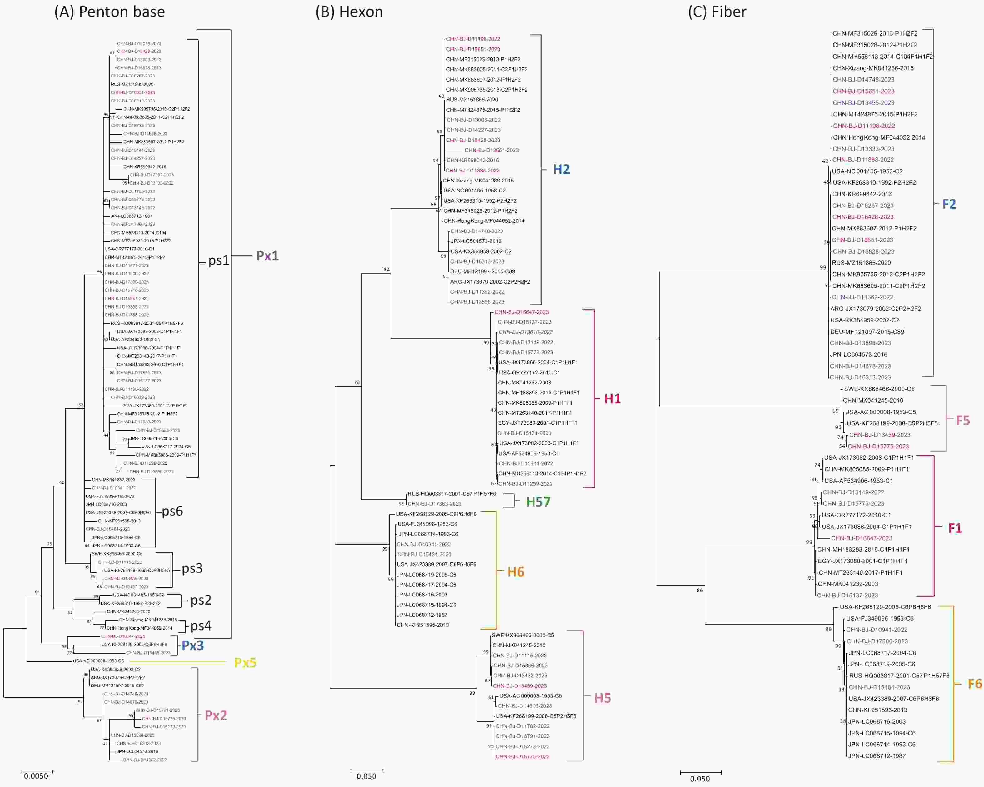 Genetic recombinant pattern No. of cases Type of penton base gene Type of hexon gene Type of fiber gene Collection, year Supposed type P7H3F3 6 P7 H3 F3 2023 Maybe B114 Px1ps1H2F2 5 Px1ps1 H2 F2 2022, 2023 Maybe C108 Px1ps3H5F5 1 Px1ps3 H5 F5 2023 NA Px2H5F5 1 Px2 H5 F5 2023 NA Px3H1F1 1 Px3 H1 F1 2023 NA Phylogenetic maximum-likelihood trees were constructed for the eight HAdV-C strains based on penton base, hexon, and fiber gene sequences (Figure 3). Fiber gene sequences formed three clades (F1, F2, and F5), hexon gene sequences clustered into three clades (H1, H2, and H5), and penton base gene sequences showed high variability across the four major clades (Px1ps1, Px1ps3, Px2, and Px3).
