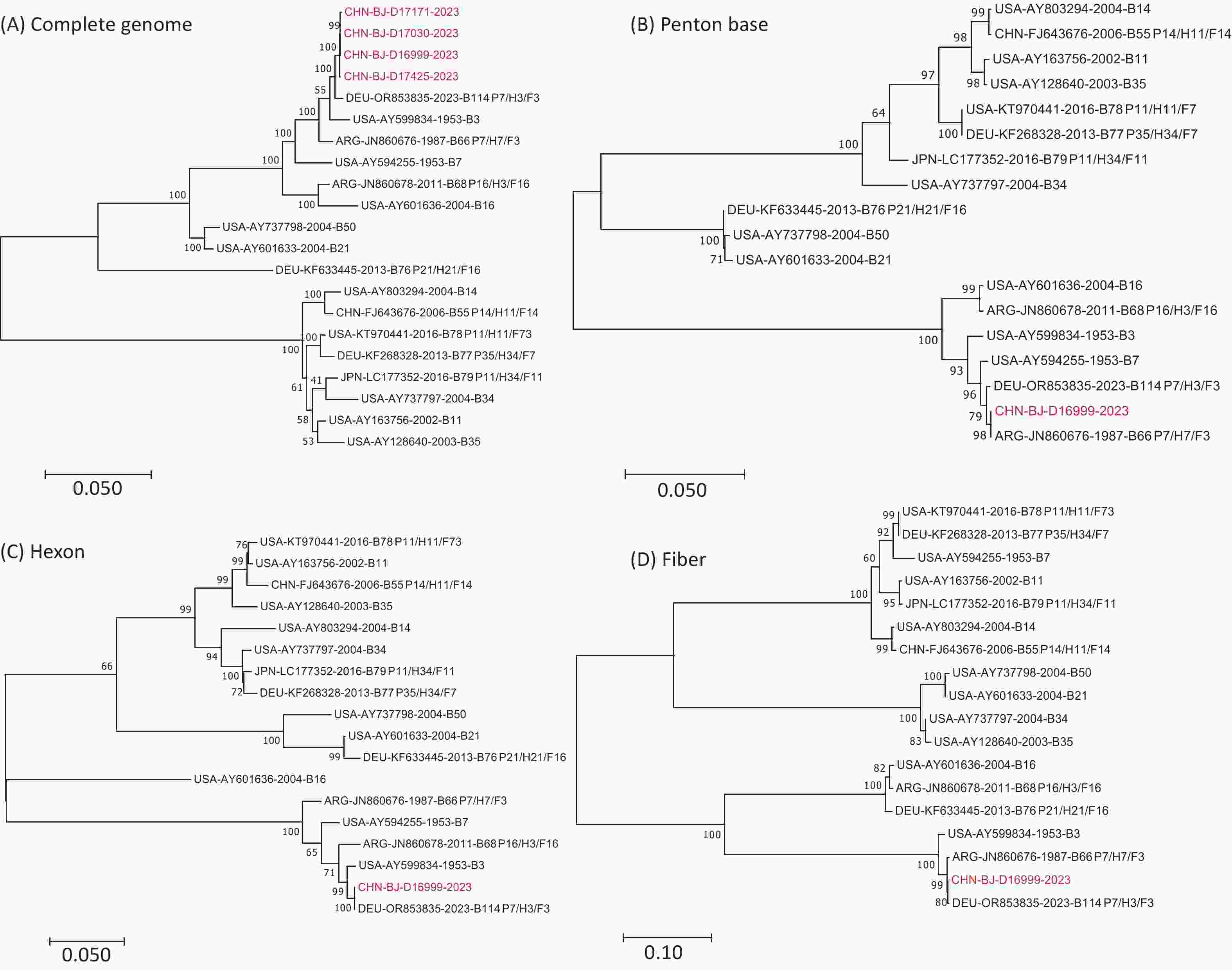 Figure 4. Phylogenetic analysis of complete genomic sequences of four cases (A), penton base (B), hexon (C), and fiber (D) gene sequences of D16999 compared with those of HAdV-B3, -B7, and -B114.