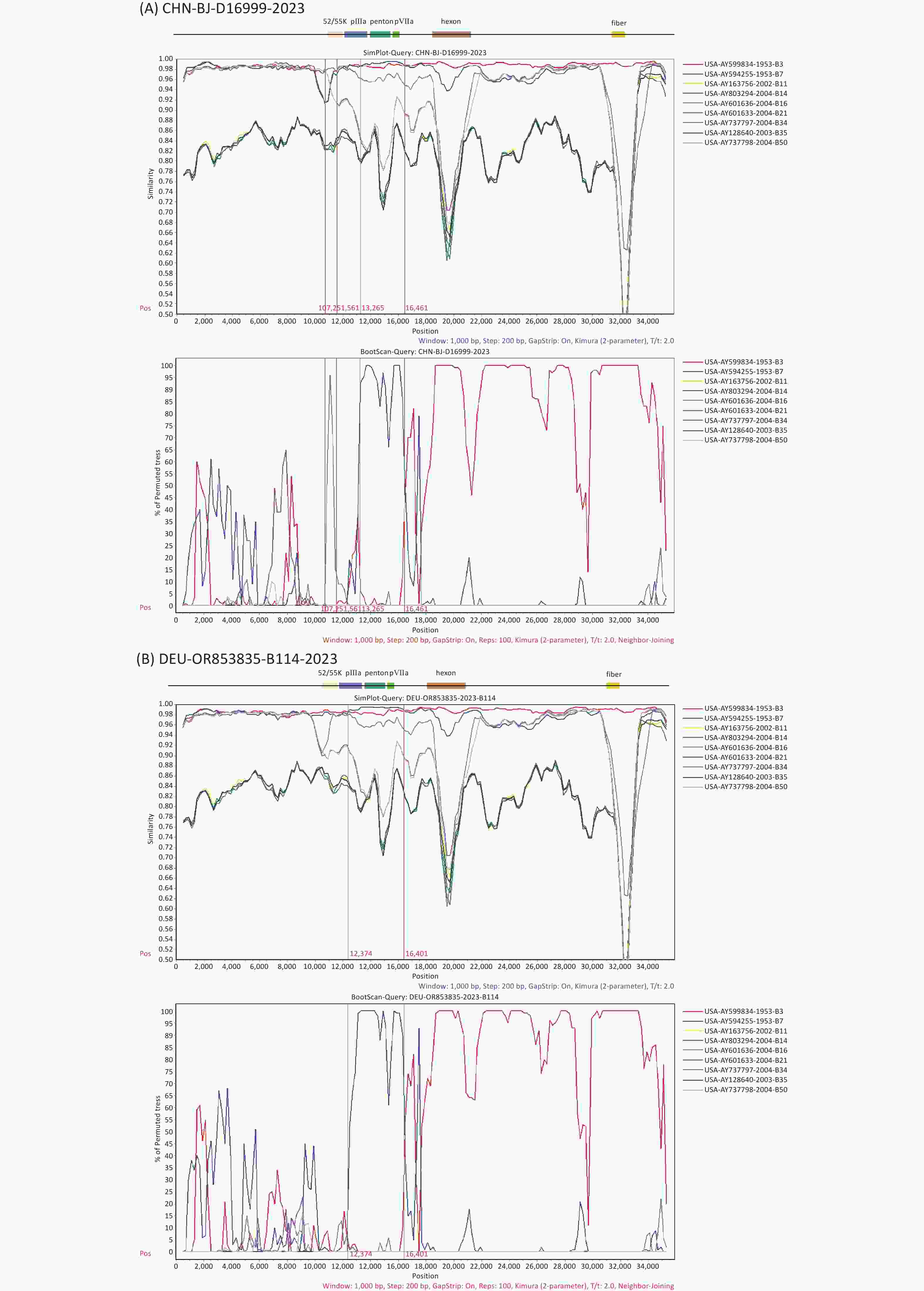 Figure 5. Recombination analysis of the genomic sequences of CHN-BJ-D16999-2023 and HAdV-B114 (GenBank No. OR853835) compared with that of other HAdV-B strains, performed using SimPlot software through similarity plotting and bootscanning with the following parameters: window size of 1,000 nt, step size of 200 nt, the Kimura distance model, and the neighbor-joining tree model. (A) Recombination analysis of the genomic sequences of CHN-BJ-D16999-2023. (B) Recombination analysis of the genomic sequences of HAdV-B114. Gene fragments of protein L1 52/55 kD (on 10,890–12,026 nt), protein IIIa precursor (on 12,051–13,817 nt), penton base (on 13,905–15,539 nt), and protein VII precursor (on 15,553–16,131 nt) of the prototype strain GB.