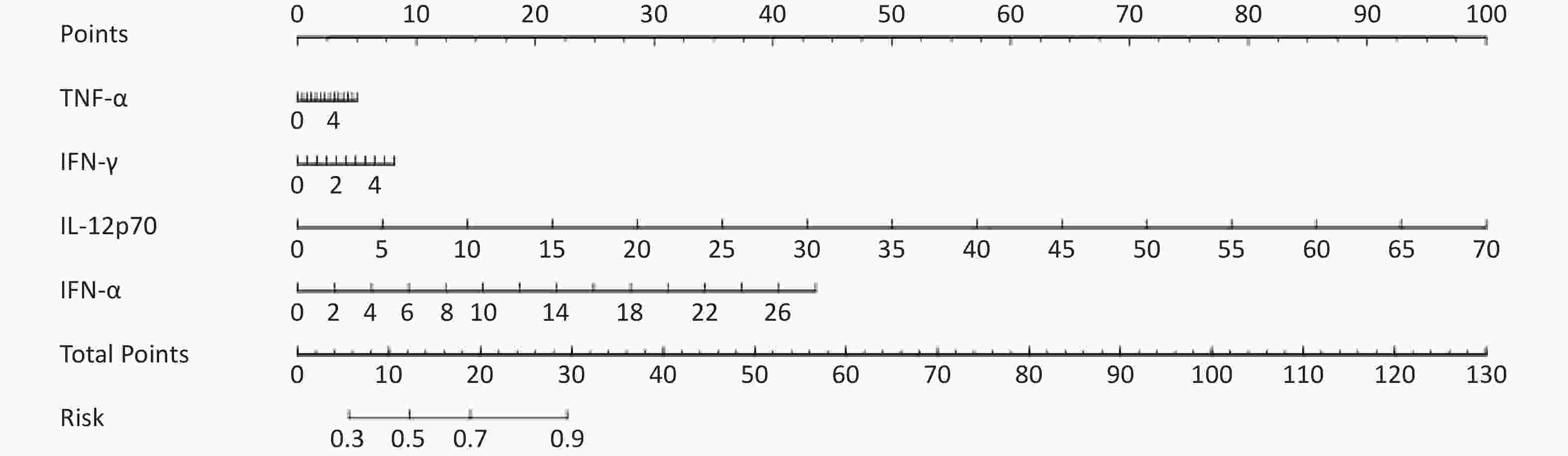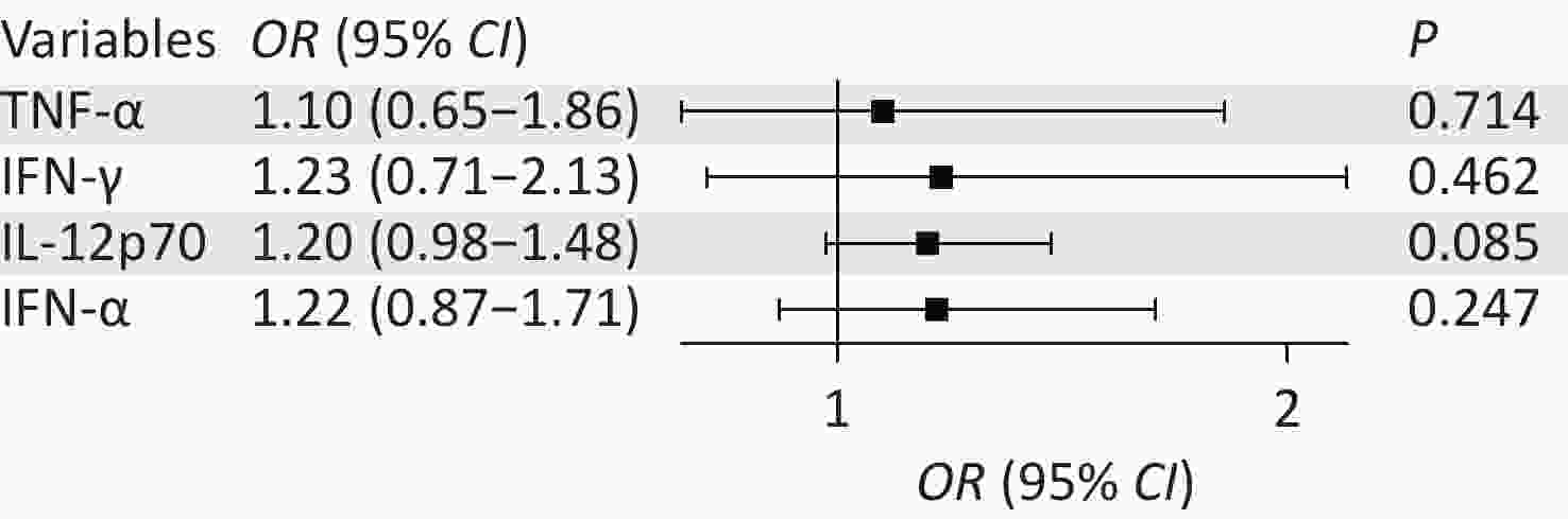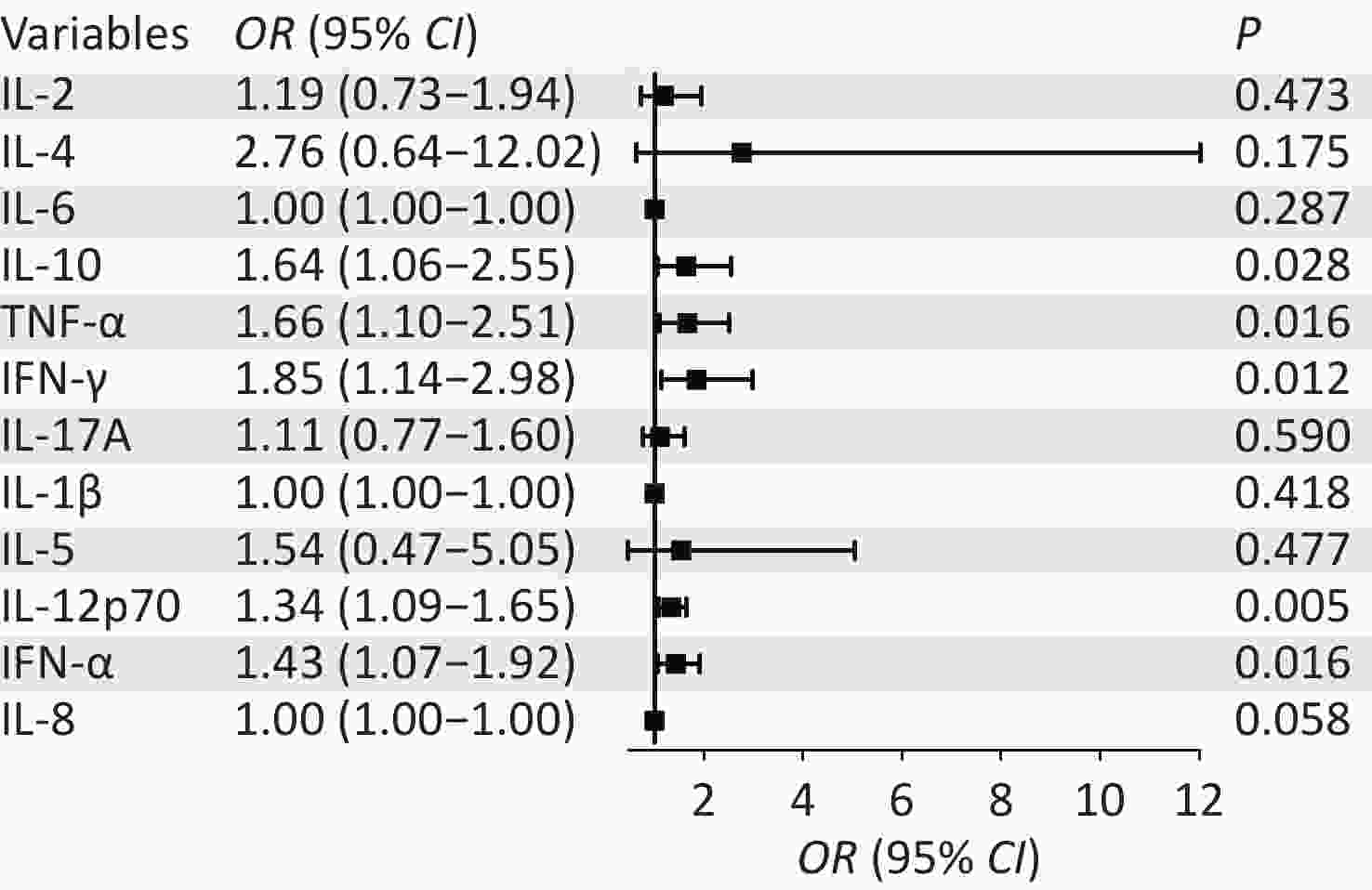 Variables β S.E Z P OR (95% CI) IL-2 0.18 0.25 0.72 0.473 1.19 (0.73–1.94) IL-4 1.02 0.75 1.36 0.175 2.76 (0.64–12.02) IL-6 0.00 0.00 1.06 0.287 1.00 (1.00–1.00) IL-10 0.50 0.22 2.20 0.028 1.64 (1.06–2.55) TNF-α 0.51 0.21 2.41 0.016 1.66 (1.10–2.51) IFN-γ 0.61 0.24 2.51 0.012 1.85 (1.14–2.98) IL-17A 0.10 0.19 0.54 0.590 1.11 (0.77–1.60) IL-1β 0.00 0.00 0.81 0.418 1.00 (1.00–1.00) IL-5 0.43 0.61 0.71 0.477 1.54 (0.47–5.05) IL-12p70 0.29 0.10 2.80 0.005 1.34 (1.09–1.65) IFN-α 0.36 0.15 2.40 0.016 1.43 (1.07–1.92) IL-8 0.00 0.00 1.90 0.058 1.00 (1.00–1.00) Note. OR, odds ratio, CI, confidence interval.