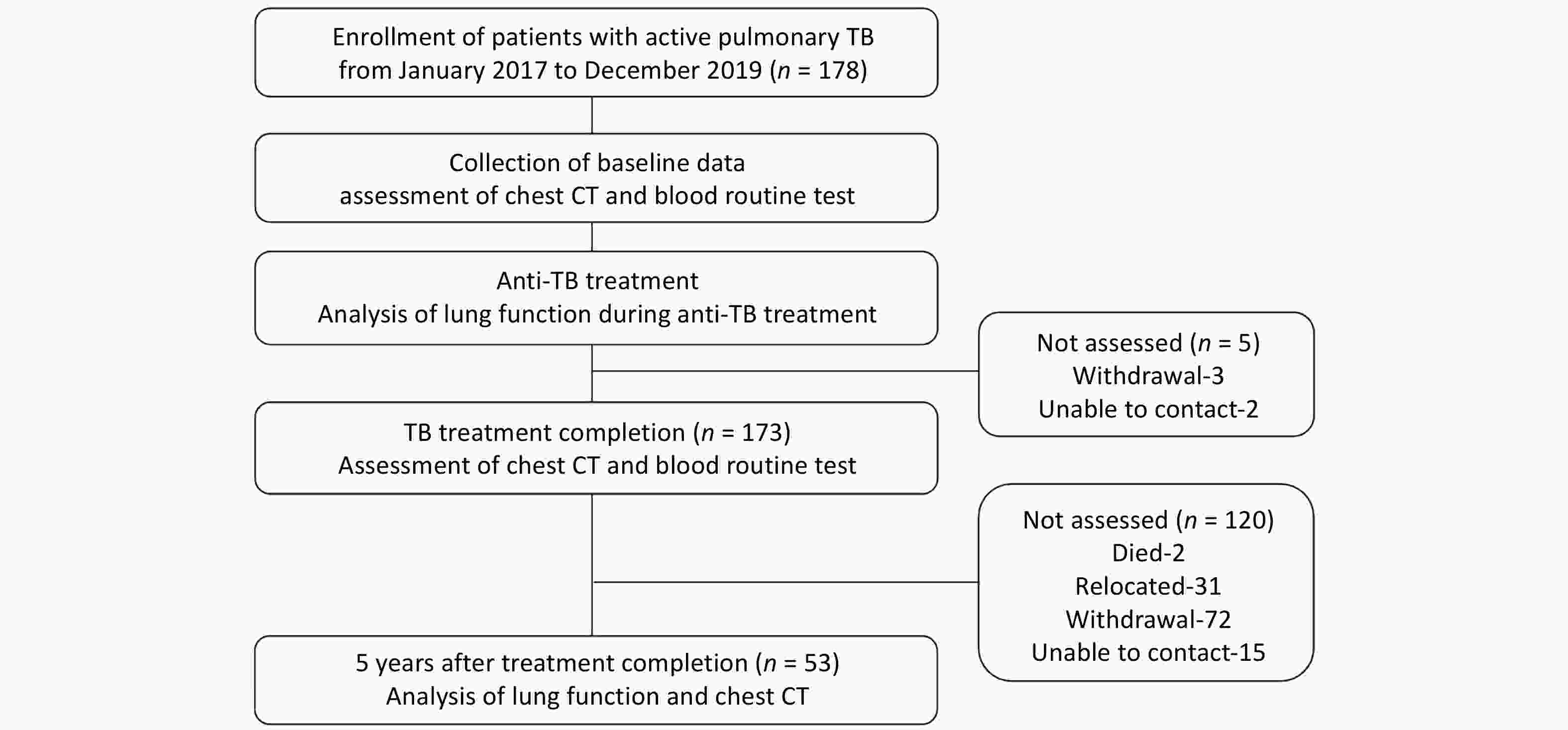 Clinical follow-up was conducted at Beijing Geriatric Hospital at two time points: (1) At completion of anti-TB treatment: primary follow-up assessments included chest CT and blood routine test. (2) Five years after treatment completion (5-year follow-up): comprehensive follow-up evaluations were performed, including: updated baseline data (age, BMI, newly developed comorbidities), respiratory symptom assessments [St. George’s Respiratory Questionnaire (SGRQ), COPD Assessment Test (CAT), modified Medical Research Council (mMRC) dyspnea scale], lung function test, Chest CT scan, and blood routine test (Figure 1). A total of 53 patients completed the 5-year follow-up.