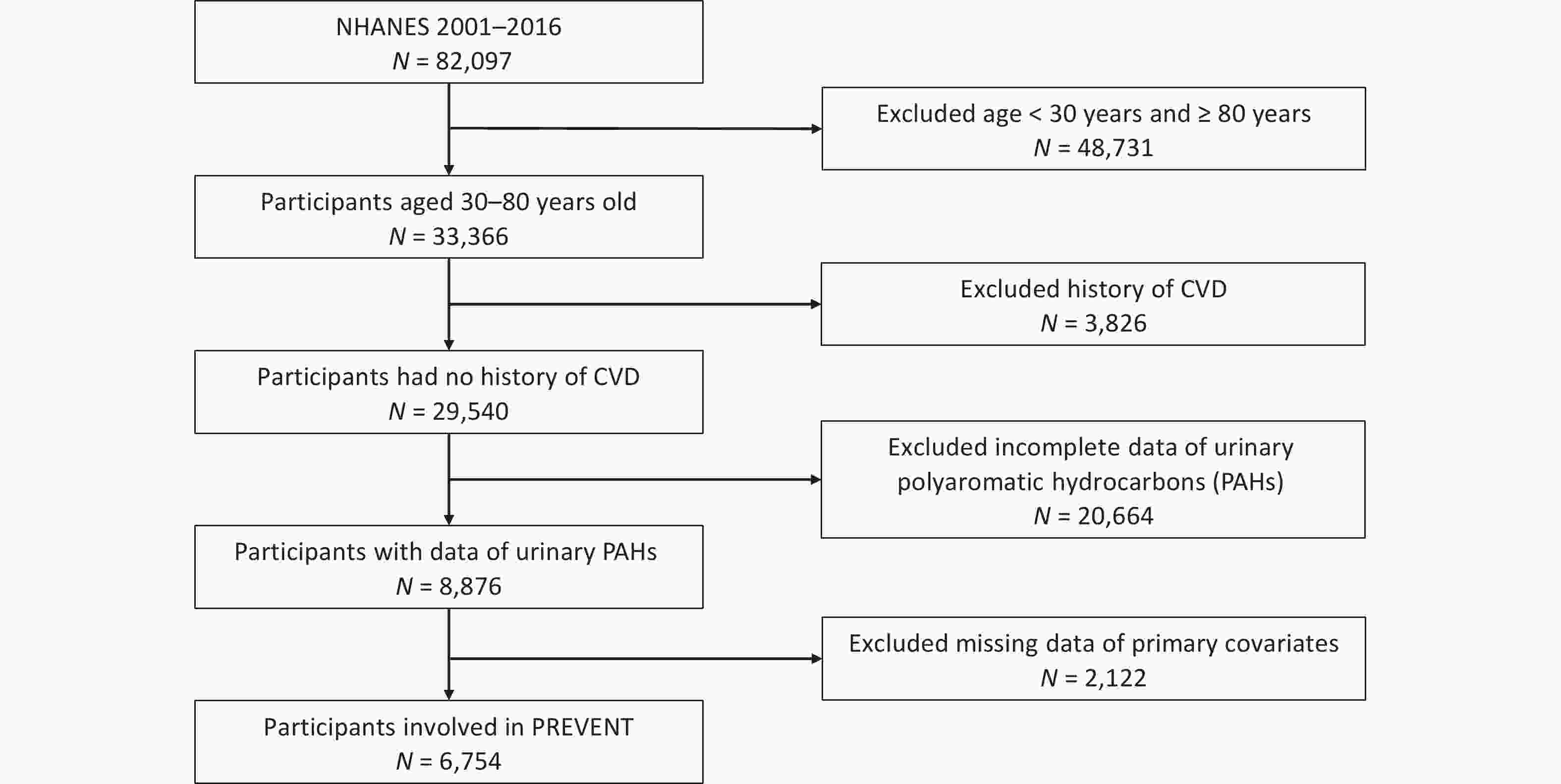All surveys and informed consent for NHANES were approved by the Institutional Review Board of the Centers for Disease Control and Prevention (CDC). We extracted data from eight survey cycles spanning the years 2001–2016, and approximately 82,097 participants were enrolled. Then 48,731 participants were excluded because they were < 30 or > 80 years of age, 3826 participants were excluded because of a history of CVD, 20,664 participants were excluded because of incomplete urinary PAH data, and 2,122 participants were excluded because of missing parameter data, such as smoking, alcohol consumption, and exercise. Ultimately, this study consisted of 6,754 participants. A detailed flowchart is shown in Figure 1.