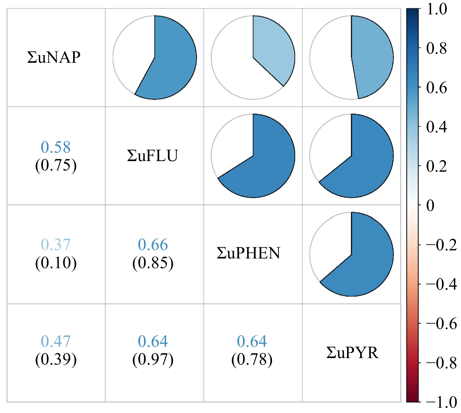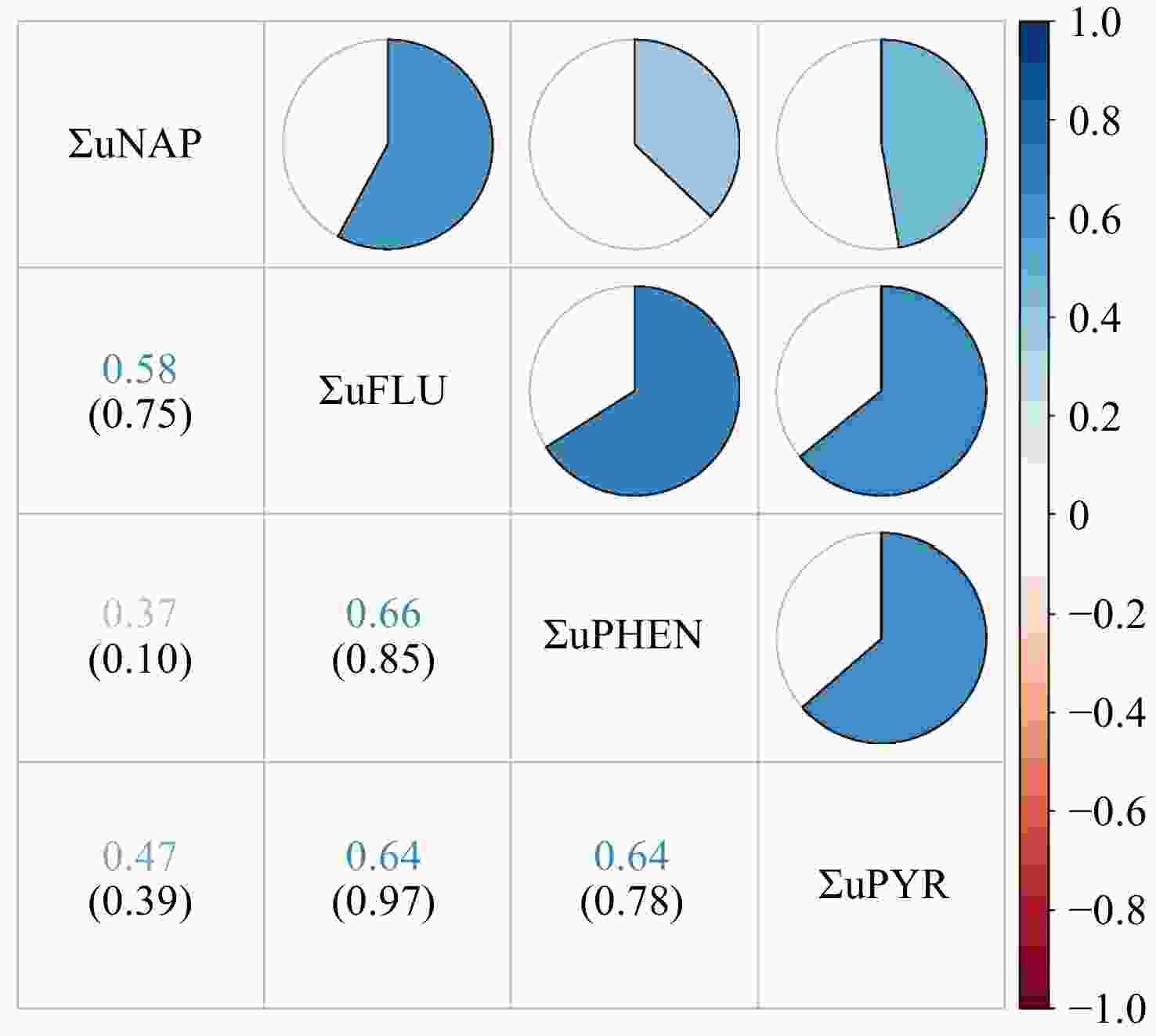 Figure 2. Pearson correlations between urinary OH-PAH levels (ng/g creatinine). Numbers in the figure represent correlation coefficients (upper row) and their corresponding P-values (lower row). The heat map of the correlation coefficients between urinary OH-PAHs concentrations is shown in the upper right part. White represents a null correlation, blue represents a positive correlation, and red represents a negative correlation. The darker the color, the greater the correlation coefficient. ΣuNAP: sum of urinary NAP metabolites (1- and 2-NAP), ΣuFLU: sum of urinary FLU metabolites (2- and 3-FLU), ΣuPHEN: urinary phenanthrene metabolites (1-PHE), ΣuPYR: urinary pyrene metabolites (1-PYR).