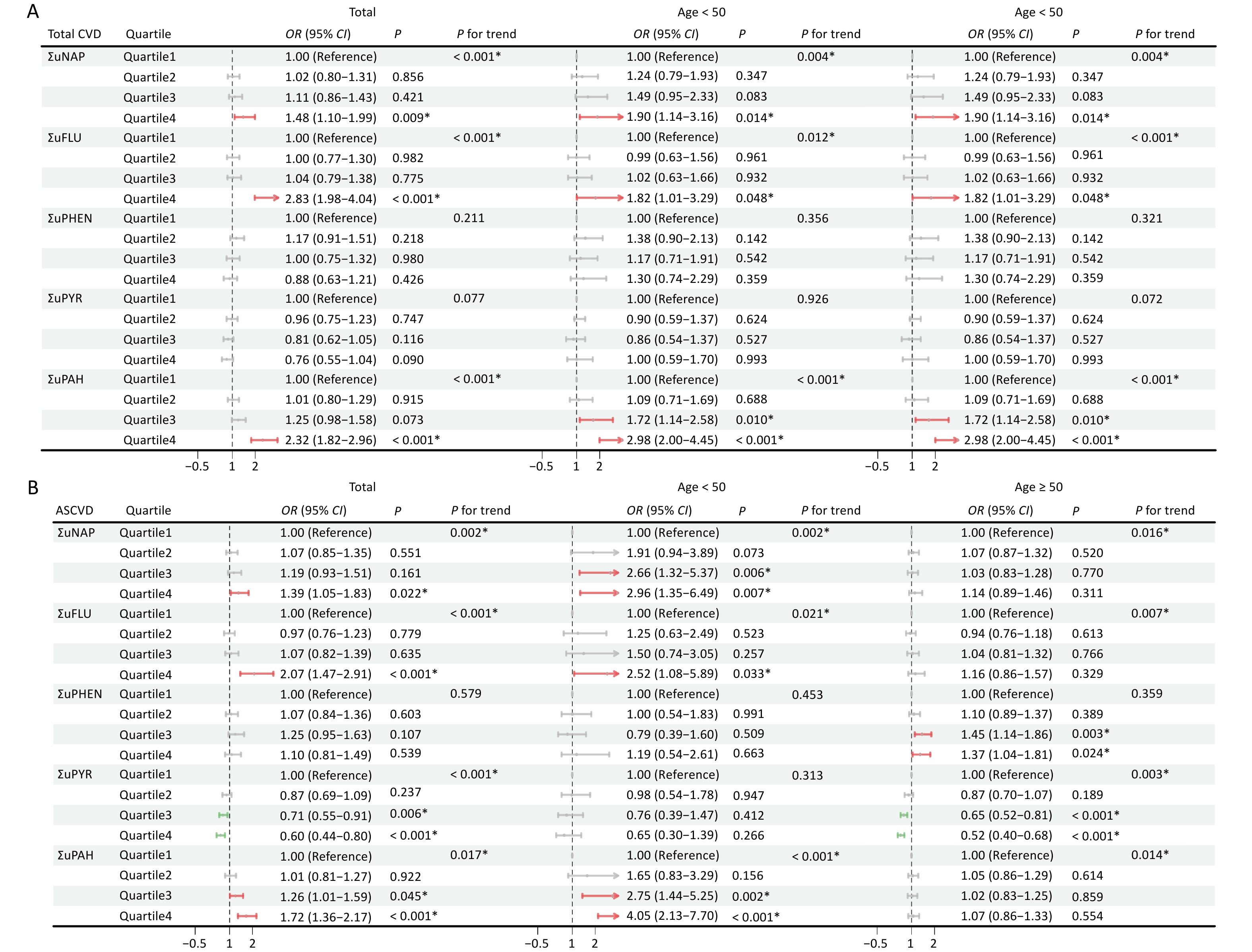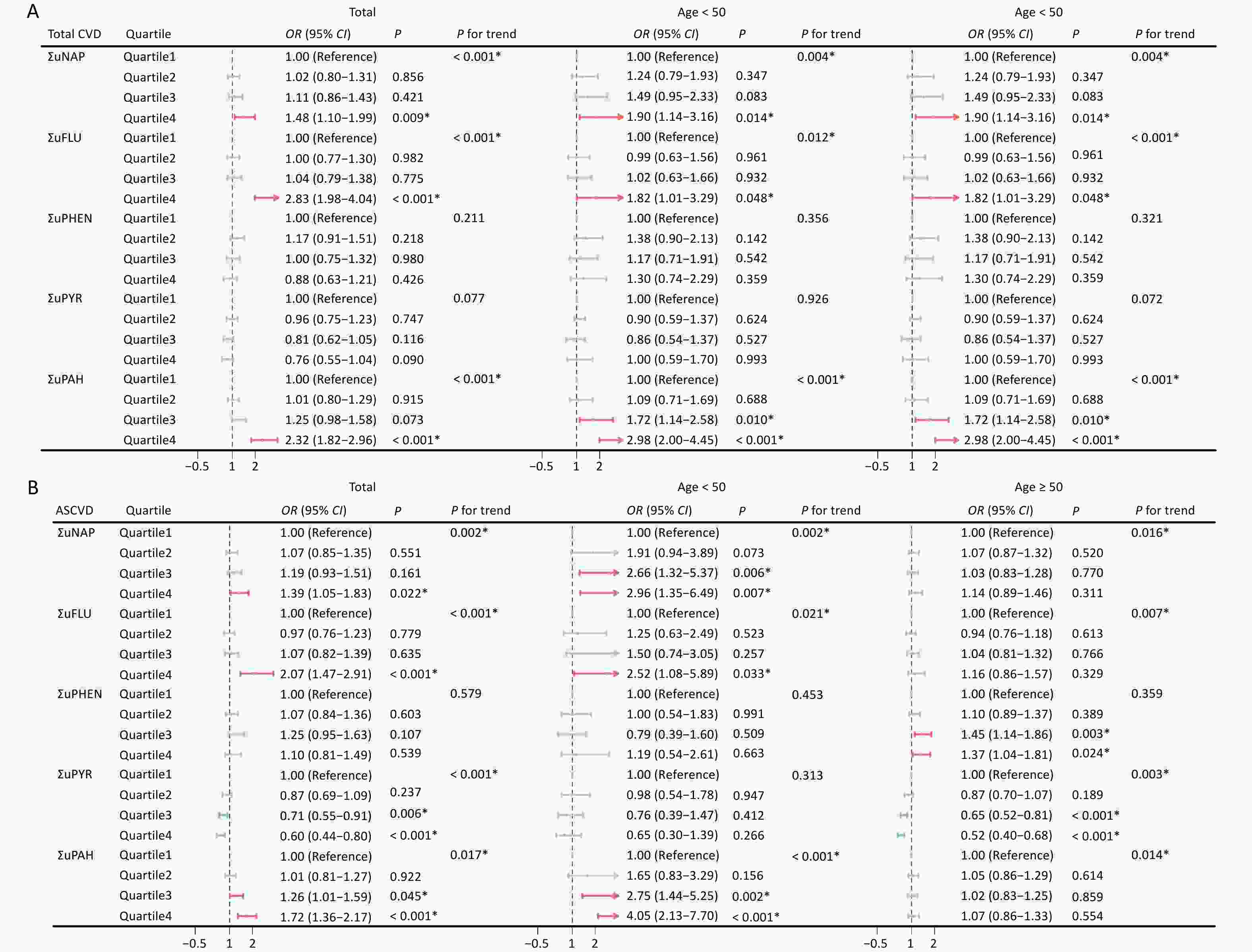 Figure 3. Association between urinary OH-PAHs and the risk of total CVD (A) and ASCVD (B) in total population and subgroups. Models were adjusted based on age, race, sex, BMI, marital status, education level, poverty income ratio, serum cotinine, drinking status, total energy intake, and physical activity. *P < 0.05. ΣuNAP: sum of urinary NAP metabolites (1- and 2-NAP), ΣuFLU: sum of urinary FLU metabolites (2- and 3-FLU), ΣuPHEN: urinary phenanthrene metabolites (1-PHE), ΣuPYR: urinary pyrene metabolites (1-PYR). ΣuPAHS: sum of urinary PAHS metabolites (1- and 2-NAP, 2- and 3-FLU, 1-PHE, and 1-PYR).
