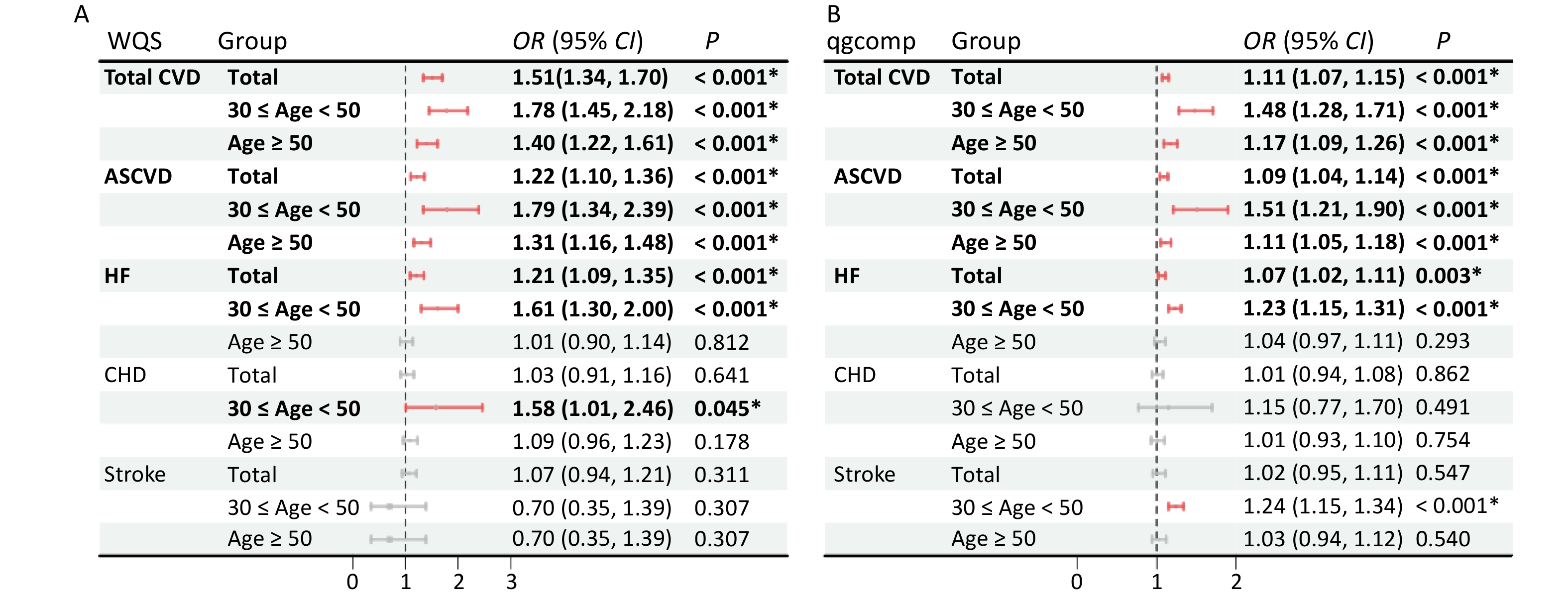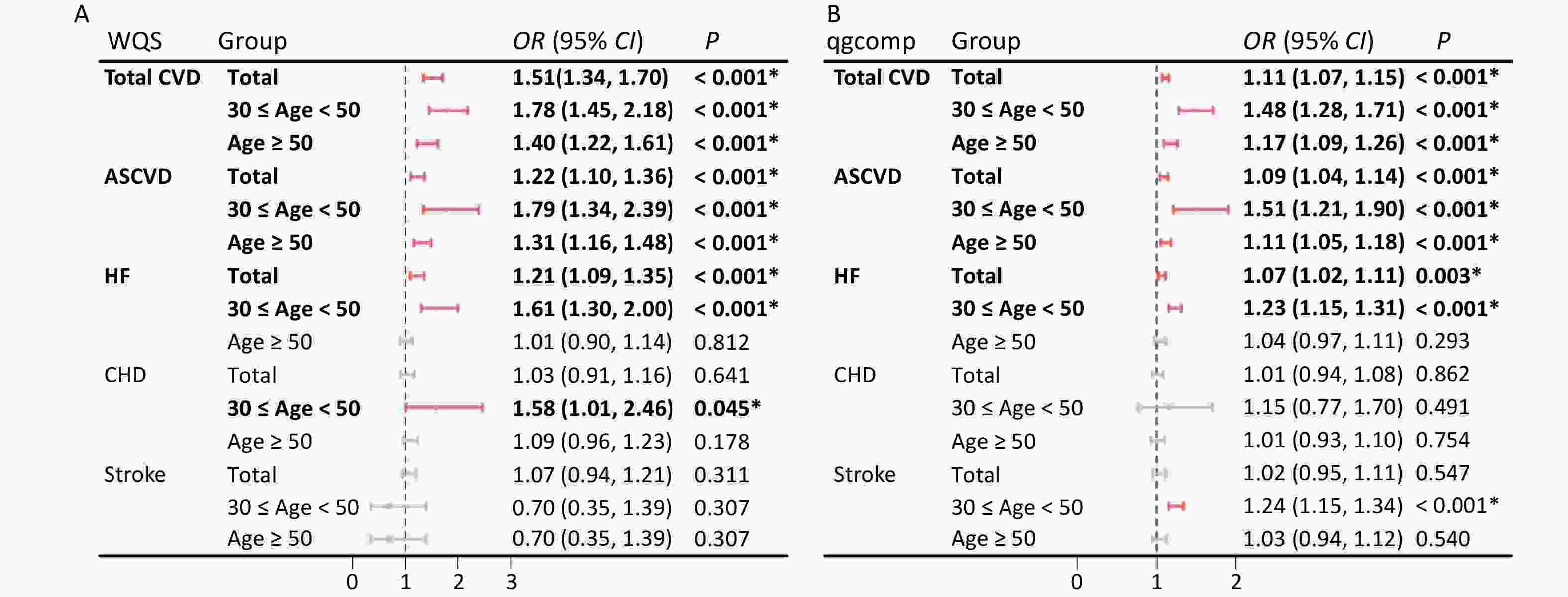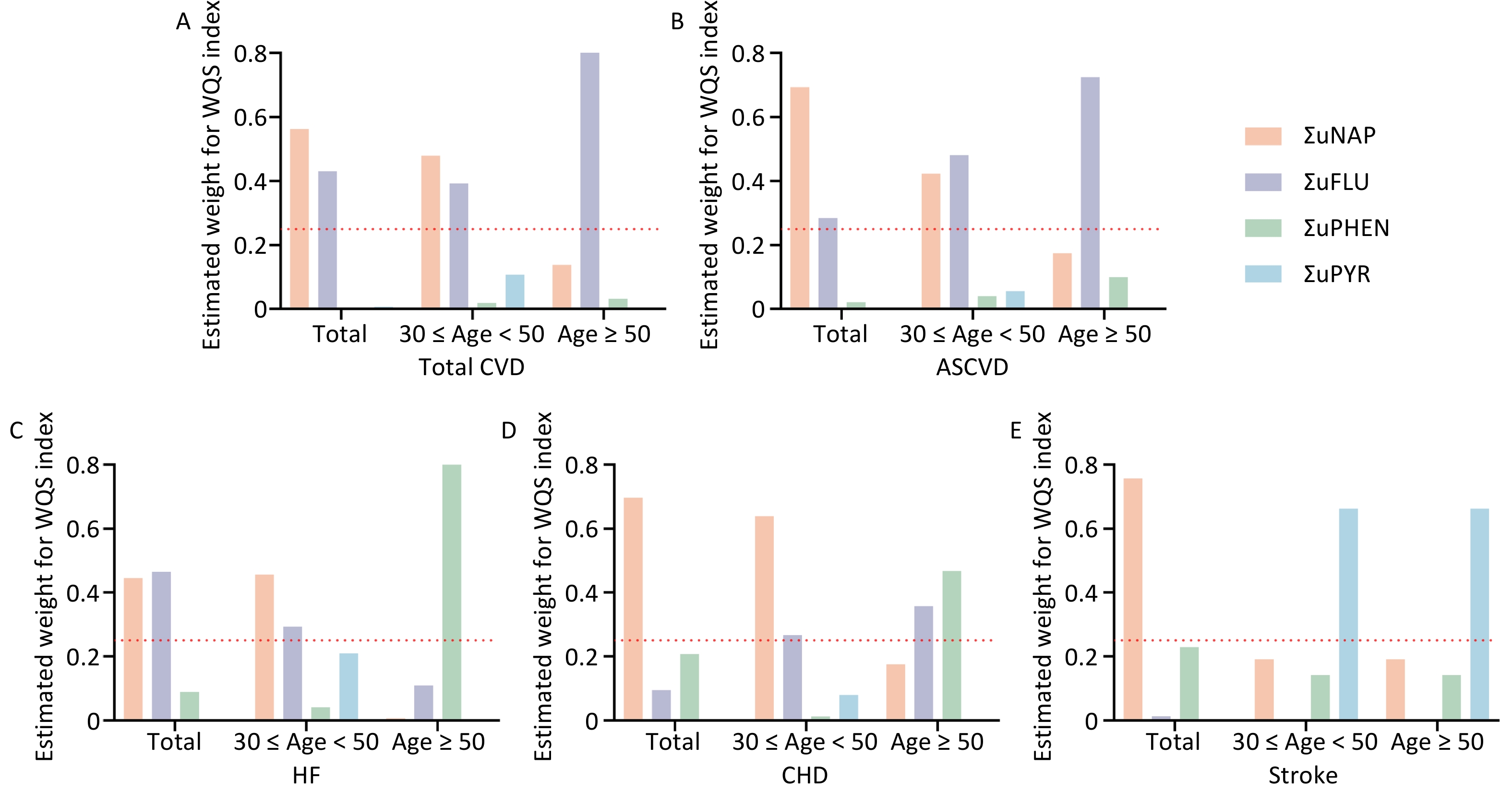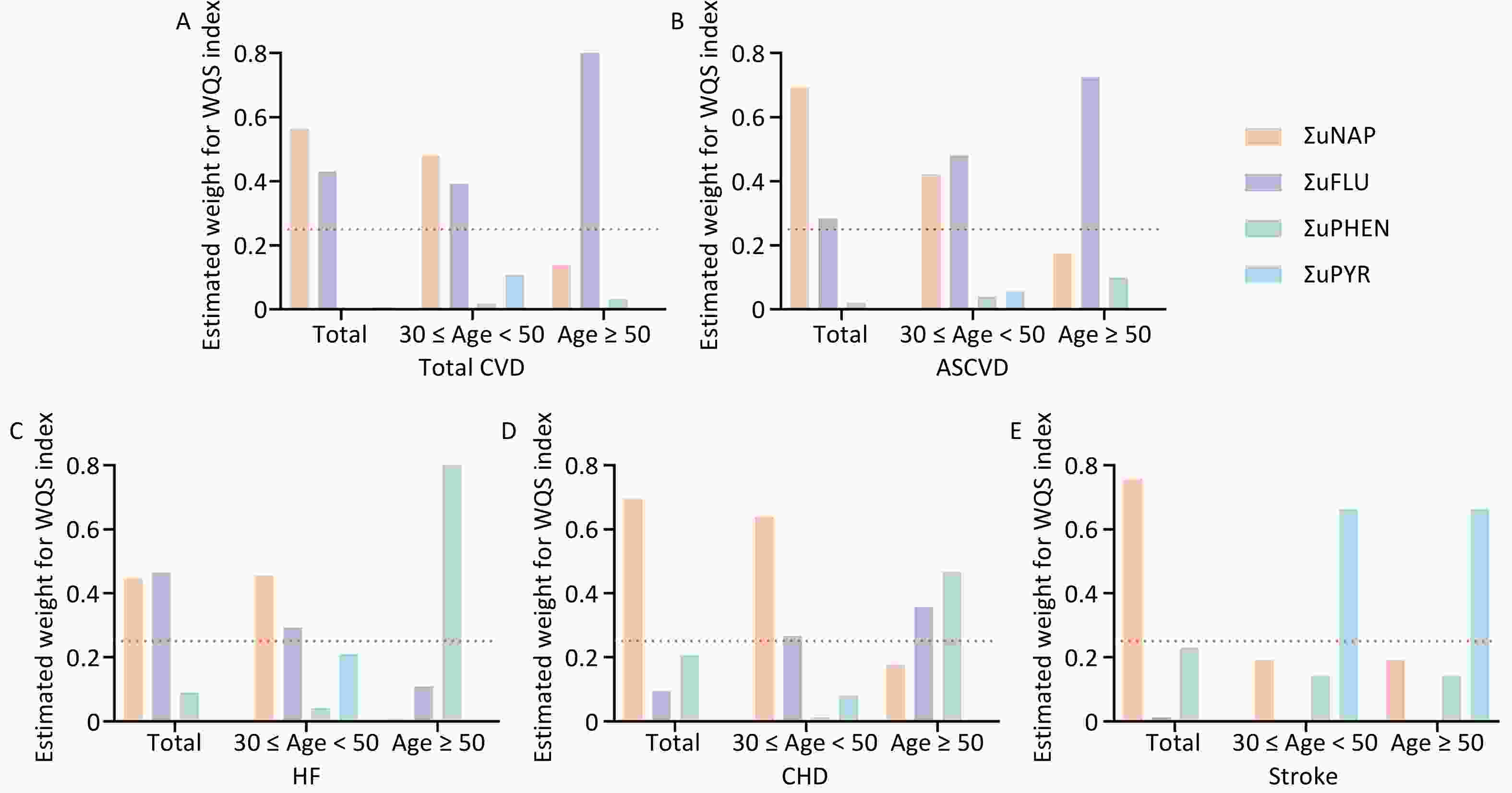 In younger participants (30 ≤ age < 50), the effects of ΣuNAP, ΣuFLU and ΣuPAHS on the total CVD, ASCVD and HF, ΣuFLU on stroke, and ΣuPAHS on CHD were noticeable, whereas the effects of ΣuPHEN on ASCVD, HF, CHD and stroke were dominant in aging participants (age ≥ 50). In addition, significant positive impact of ΣuFLU on total CVD were observed both in younger and aging participants.