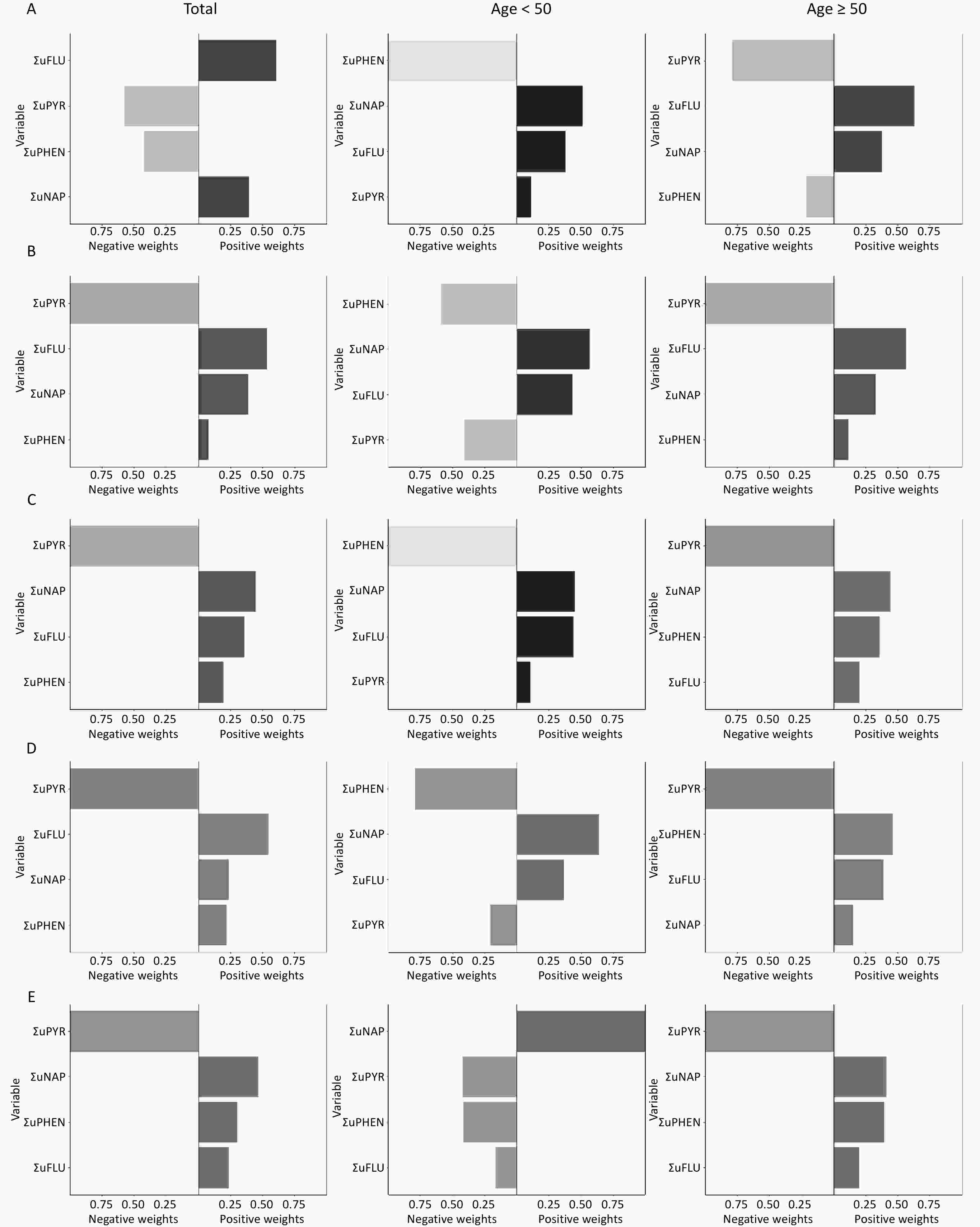Figure 6. The qgcomp model weights of urinary OH-PAHs for CVD risk in the total population and subgroups. Urinary OH-PAHs mixture on Total CVD (A), ASCVD (B), HF (C), CHD (D), and stroke (E). In the graphic results of the QG-C model, the length of the bars represents the magnitude of the weights. A darker color on the right side of the bar indicates an overall positive association, whereas similar or indistinct colors reveal a non-significant or negligible relationship.