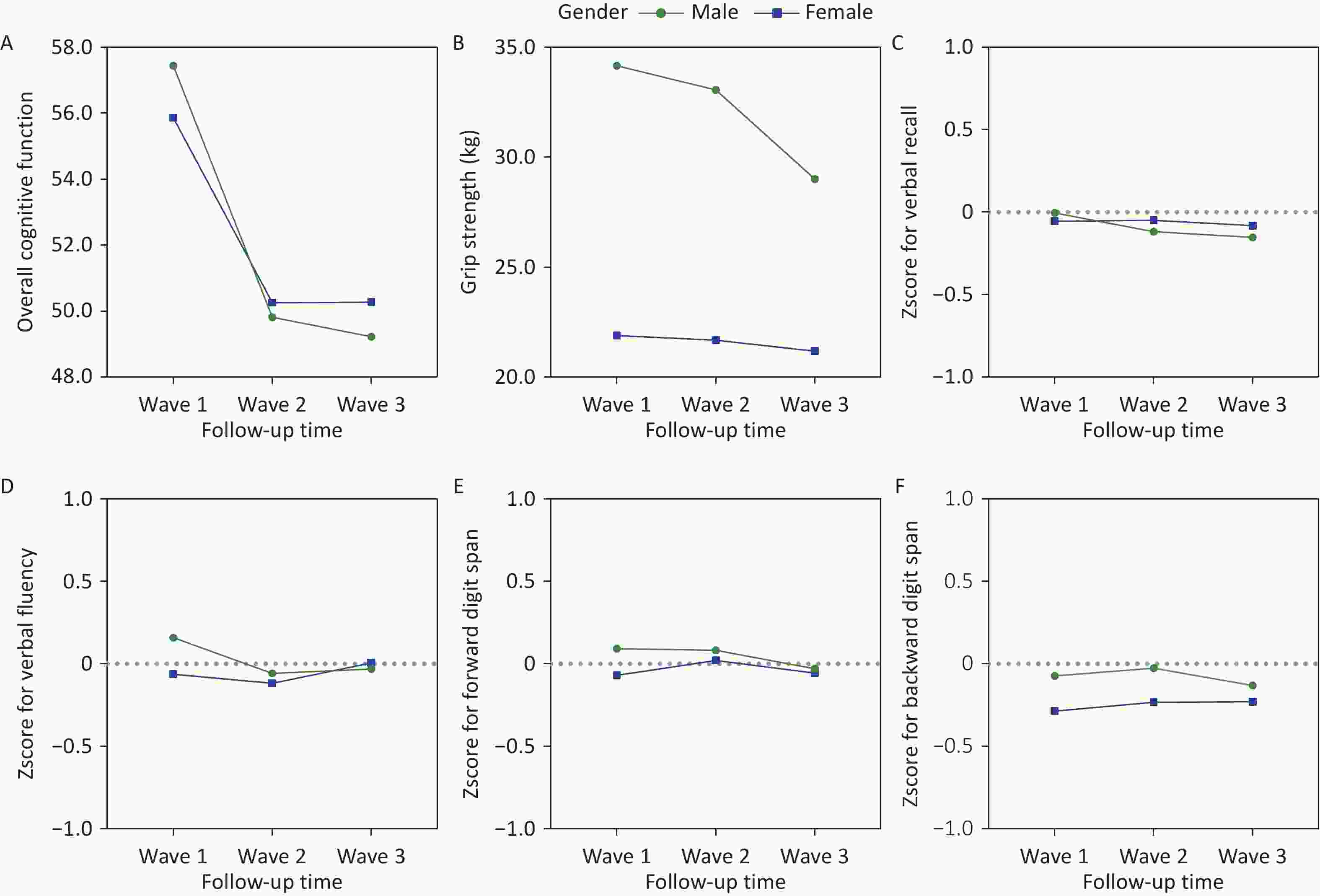 In 3 waves of survey, the mean scores for each component of cognitive function and grip strength measures for males and females are shown in Supplementary Table S3. Figure 2 shows the trends of cognitive function and grip strength in the 3 waves for all participants, males and females. The four components of cognitive function were presented in a standardized form.