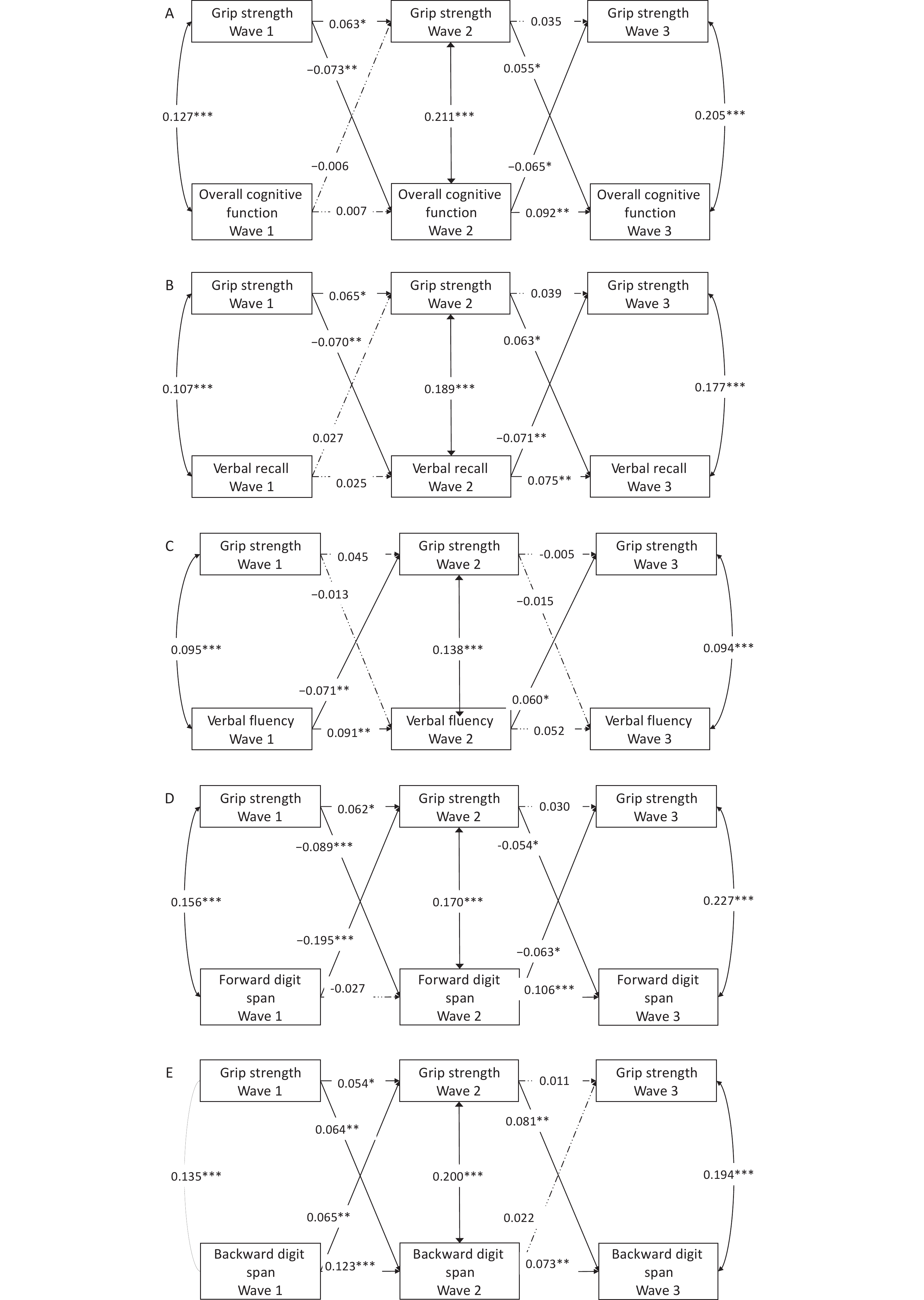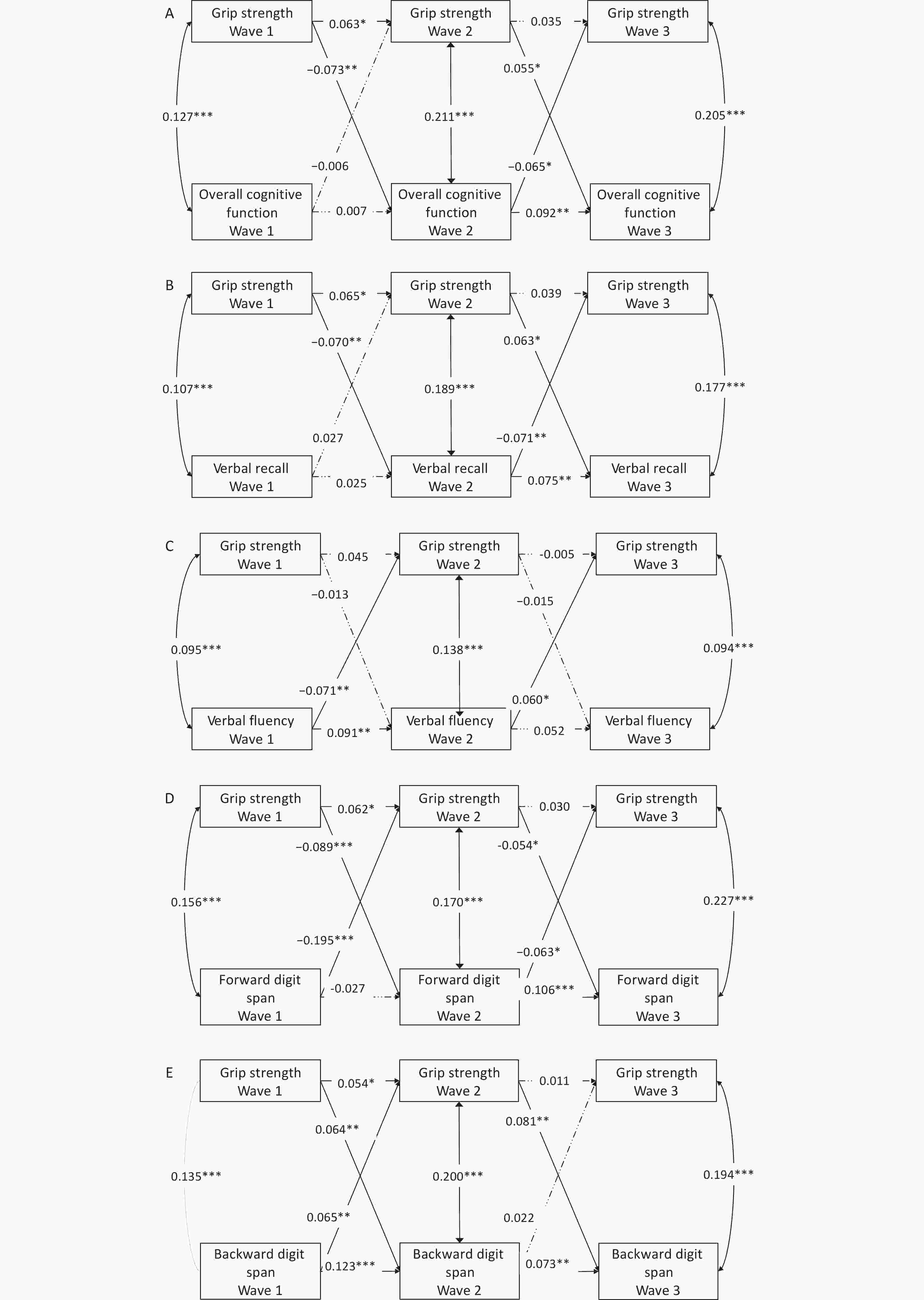 Figure 3. Cross-lagged model of grip strength and cognitive function. (A) Grip strength and overall cognitive function; (B) Grip strength and verbal recall; (C) Grip strength and verbal fluency; (D) Grip strength and forward digit span; (E) Grip strength and backward digit span. ***, P < 0.001; **, P < 0.01; *, P < 0.05.