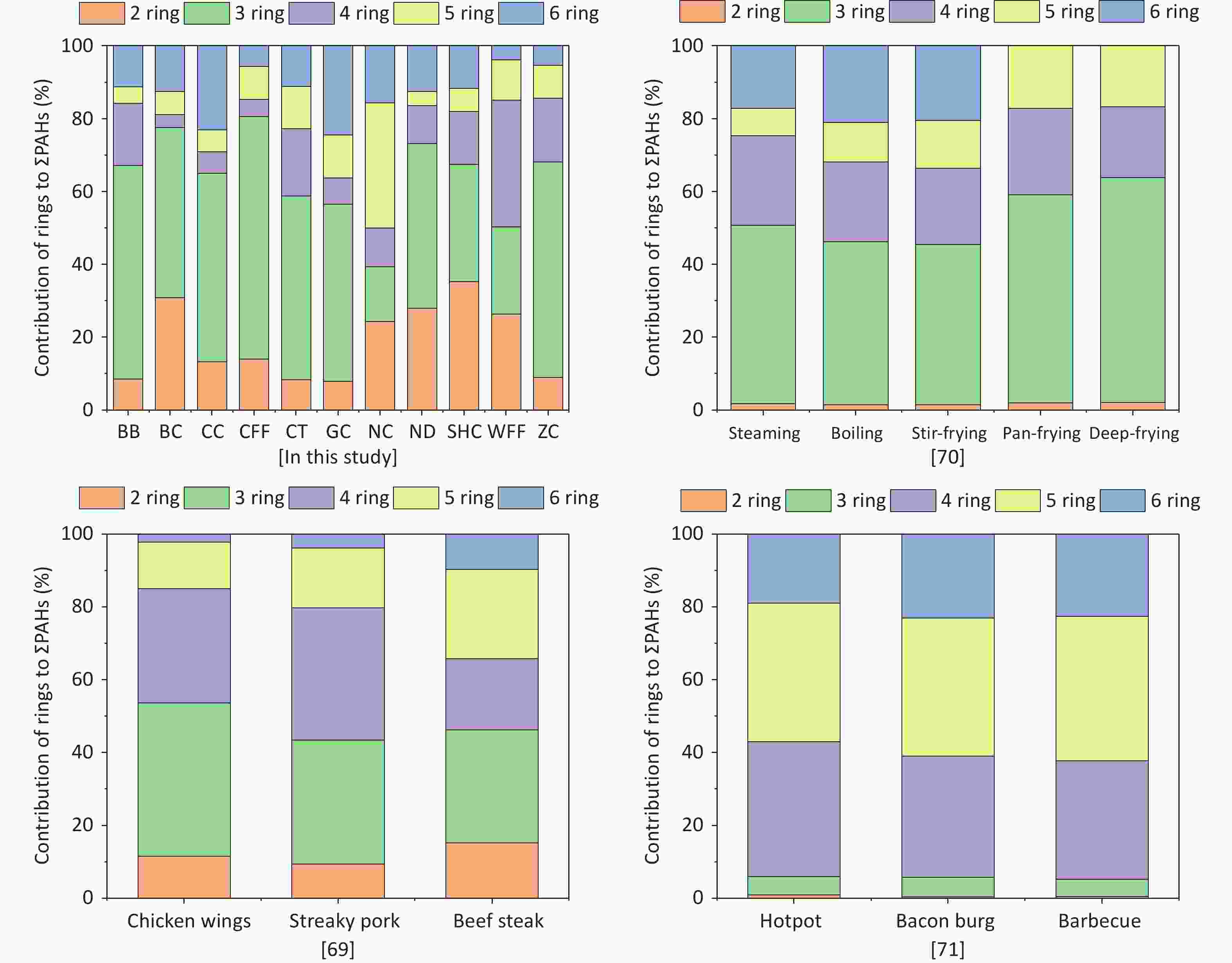 For all cooking methods, 2- and 3-ring PAHs constituted 39.4%–80.6% of ΣPAHs (Figure 2). Additionally, the contribution of 4-ring PAHs to ΣPAHs in the WFF sample reached 34.8%, and that of 5-ring PAHs in the NC sample was 34.4%, which was significantly higher than those of the other cooking types. In this study, low-molecular-weight PAHs were the main contributors to ΣPAHs for the majority of the cooking styles investigated. In another study, 3- and 4-ring PAHs were the main contributors to ΣPAHs during meat cooking [69], which was consistent with the results of some of the cooking styles in this study.