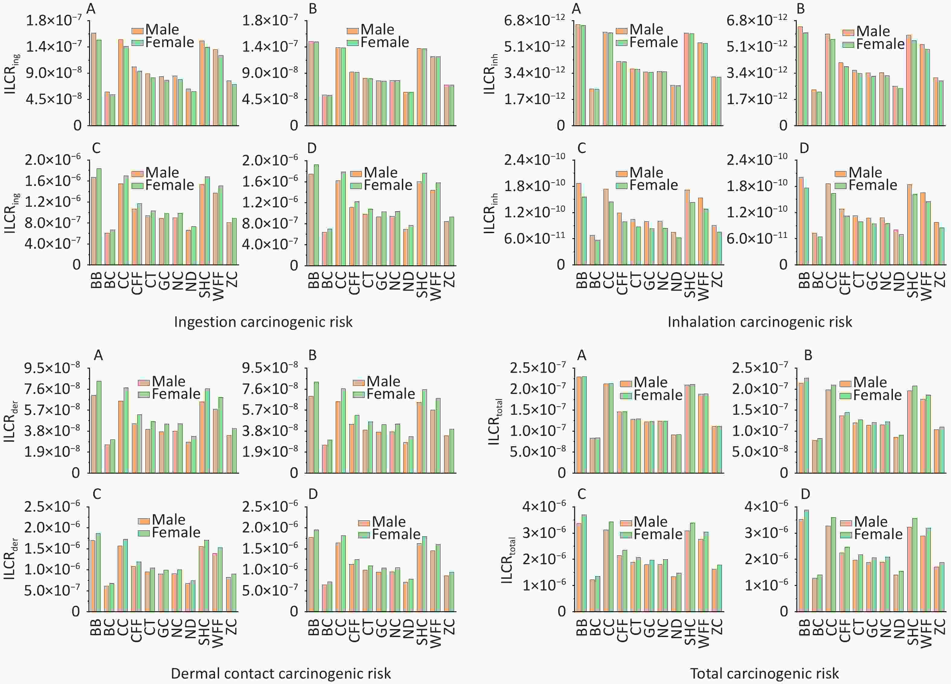 According to USEPA recommendations[78], ILCR < 10–6 indicates that the potential health risk is negligible; 10–6 < ILCR < 10–4 indicates that the potential health risk is within the acceptable range; and ILCR > 10–4 indicates a serious potential health risk. The ILCRs associated with the three exposure routes to PAHs from different cooking styles were assessed in four different groups stratified by age and sex and prioritized as ingestion > dermal contact > inhalation (Supplementary Table S8). For all cooking styles, the average ILCRtotal values ranged from 8.26 × 10−8 to 3.88 × 10−6 for females and from 7.81 × 10−8 to 3.53 × 10−6 for males. The ILCRtotal values for adults (1.23 × 10−6 to 3.70 × 10−6) and older adults (1.28 × 10−6 to 3.88 × 10−6) exceeded the acceptable limit of 1.00 × 10–6, and females showing a higher cancer risk (Figure 4). The ILCRtotal values were higher in the older adult group than in the other age groups. Generally, the ILCRtotal values were lower for children than for older adults, exhibiting a trend of first decreasing and then increasing with increase in age. Notably, the ILCRtotal values were significantly higher for BB, CC, SHC, and WFF than for the other cooking styles, which were mainly influenced by BaA, BaP, DBahA. In addition to the higher TEF values of these PAH monomers, the higher concentrations of some PAH monomers were also influencing factors.
