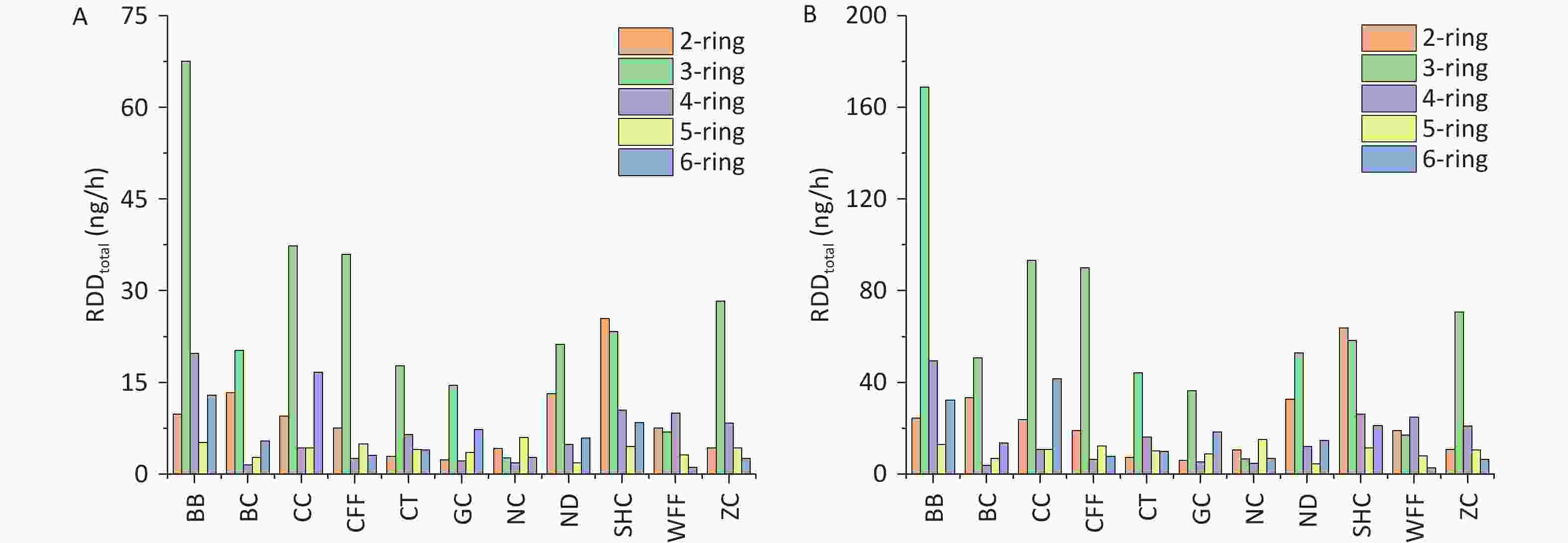 With regard to the contribution of PAHs of different ring numbers to the RDDtotal values, the cumulative impact of 2- and 3-ring PAHs on RDDtotal exceeded that of PAHs with other ring numbers. For the different cooking styles, the mean RDDtotal values of the 2- and 3-ring PAHs were respectively 9.11 and 25.07 ng/h for children and 22.79 and 62.67 ng/h for adults. The contribution of 3-ring PAHs from BB to the RDDtotal was markedly greater than that from similar PAHs from the other cooking styles. By contrast, the contribution of 2-ring PAHs from SHC to the RDDtotal was higher than that from similar PAHs from the other cooking styles, which was due to the high Phe and Ant contents. Similarly, the 2- and 3-ring PAHs contributed the most to the RDD values for the three respiratory system regions. However, 5- and 6-ring PAHs are more toxic[20]. The combined contributions of 5- and 6-ring PAHs from BB and CC to the RDDtotal were respectively 18.16 and 20.95 ng/h for children and 45.41 and 52.38 ng/h for adults.