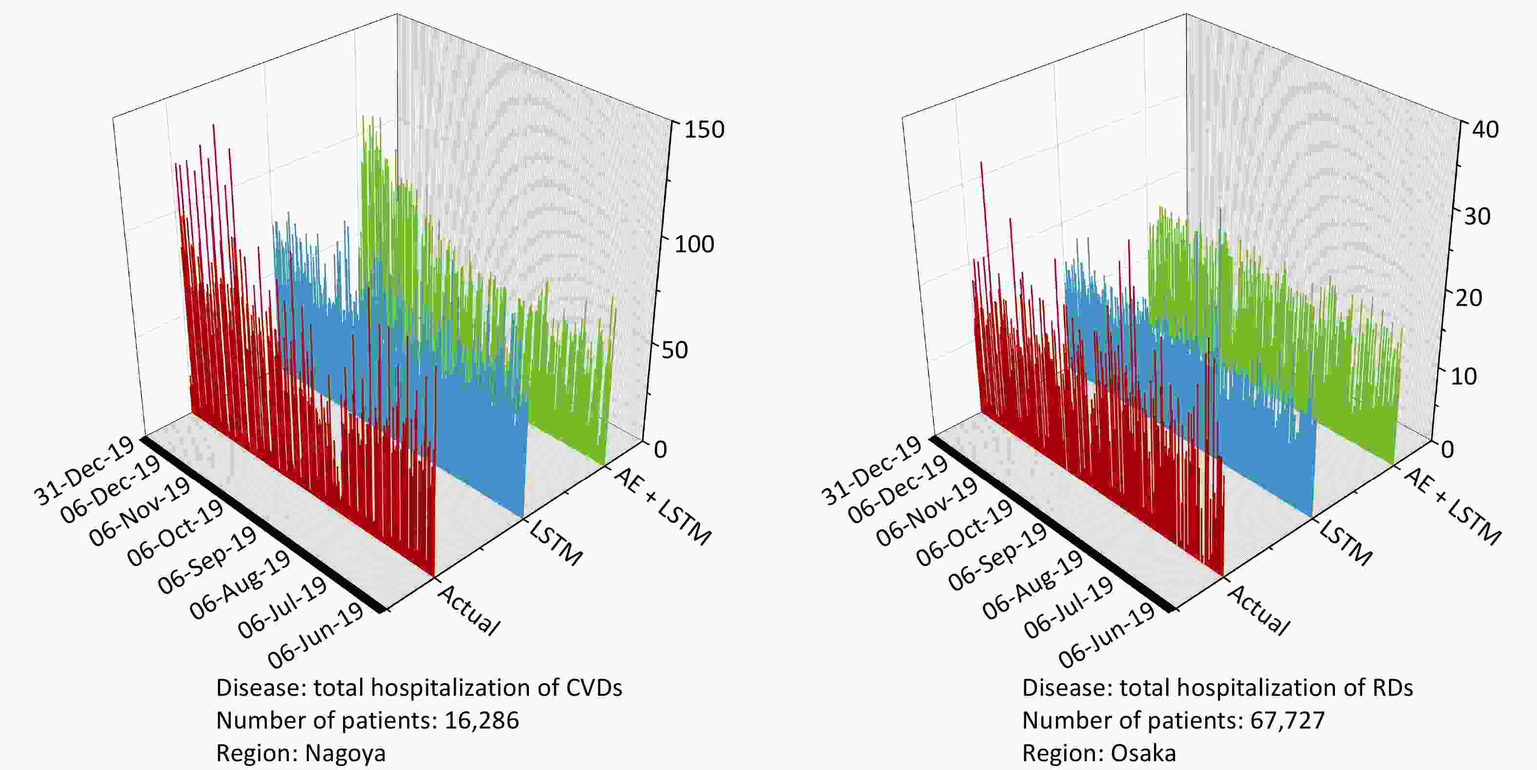 Figure 4. Visualization of prediction results with the best model performance in testing datasets. The vertical axis represents the number of daily hospitalizations. The left figure represents the prediction results of CVD-related hospitalization in Nagoya city, and the right figure illustrates the prediction results of RD-related hospitalization in Osaka city. The red line represnts actual hospitalization, the blue line represents the prediction value of the LSTM model, and the green line represents the prediction value of the AE+LSTM. CVDs, cardiovascular diseases; RDs, two respiratorydiseases; RMSE, Root Mean Square Error; MAE, Mean Absolute Error; LSTM, Long Short Term Memory; AE, autoencoder.