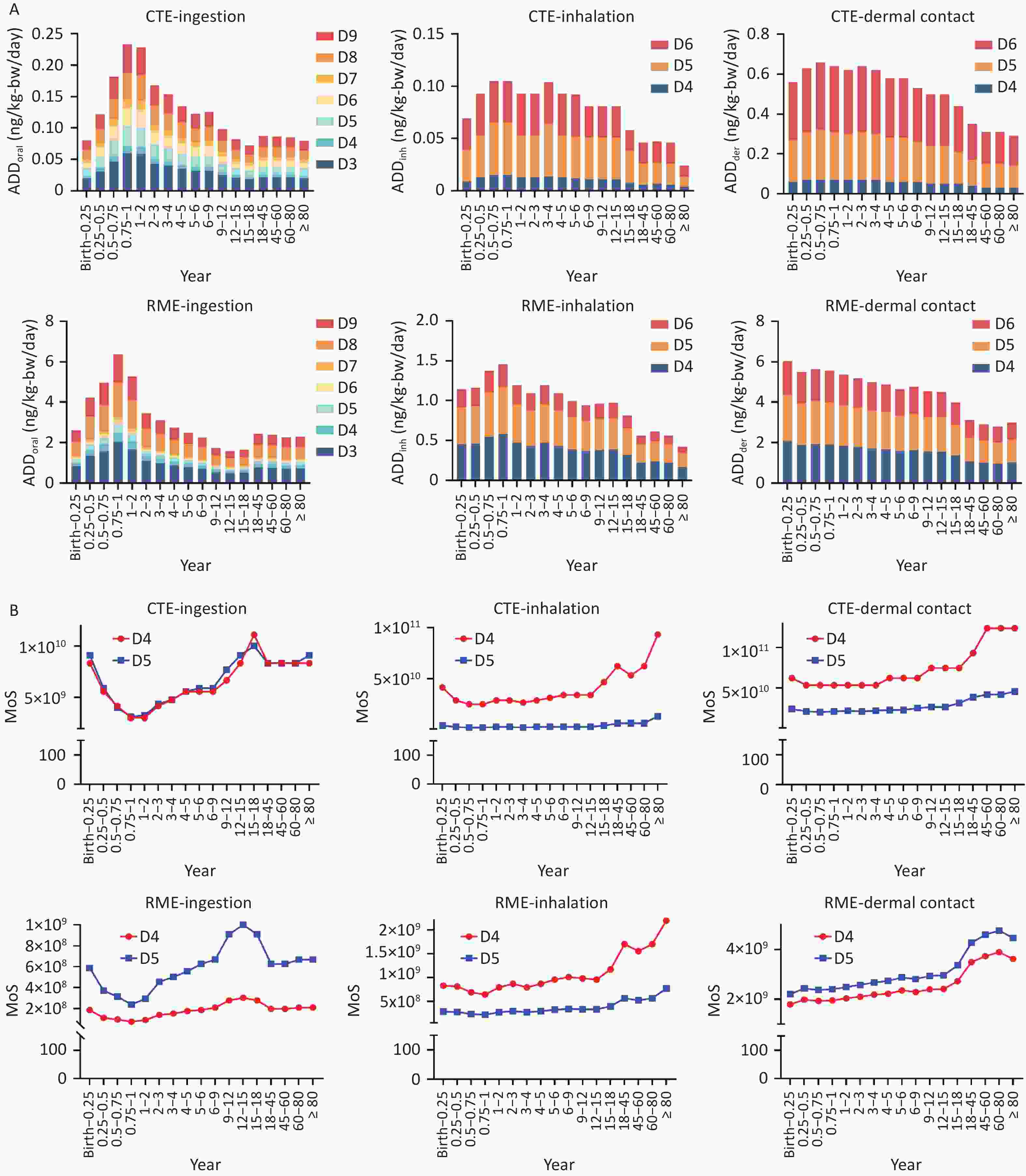 Figure 2. Estimated average daily exposure to cVMSs (A) and estimated MoS values of cVMSs (B) via ingestion, inhalation, and dermal contact from drinking water in three DWTPs across different age groups. The daily exposure and the health risks were estimated under both CTE and RME scenarios. cVMSs, cyclic volatile methyl siloxanes; DWTPs,drinking water treatment plants; MoS, margin of safety; CTE, central tendency exposure; RME, reasonable maximum exposure.