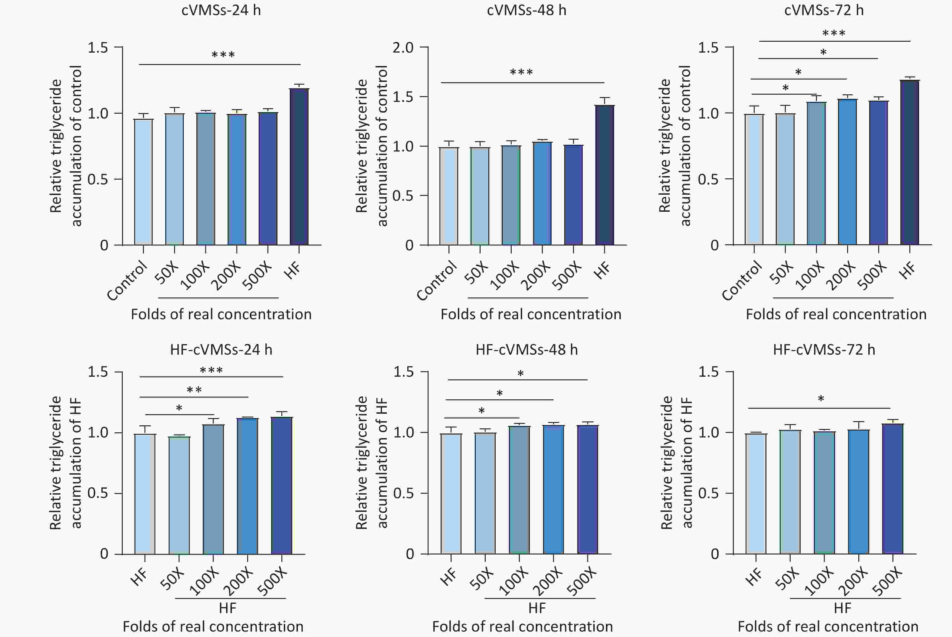 Figure 3. Lipid accumulation effects of mixed exposure to cVMSs in drinking water in Shanghai on HepG2 cells under normal and HF culture conditions after 24, 48, and 72 h exposure to cVMSs at varying folds of realistic levels (n = 3, *P < 0.05, **P < 0.01, ***P < 0.001 compared with control or HF group). cVMSs, cyclic volatile methyl siloxanes.