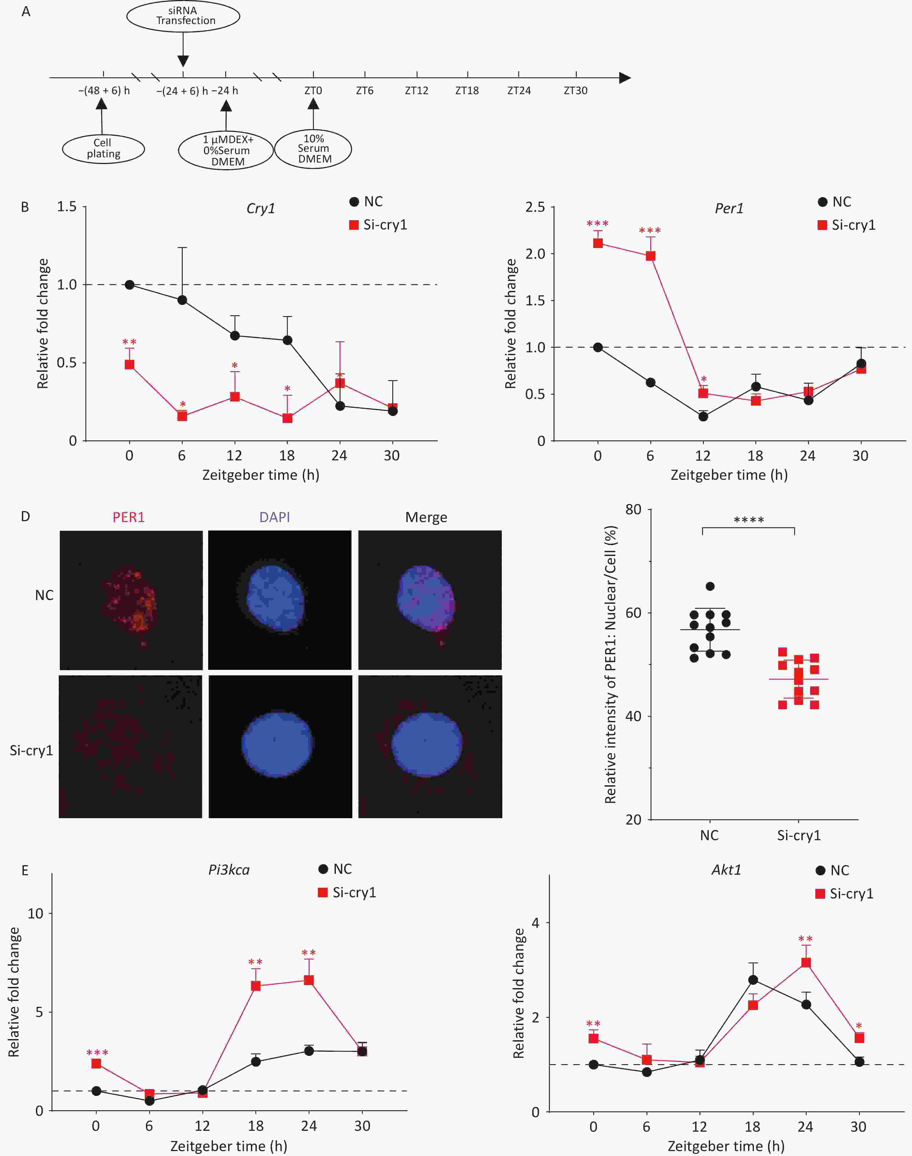 Figure 3. Nuclear imports of PER1 regulates the downstream PI3K/AKT pathway. (A) Scheme for siRNA transfection of HT22 cells. (B–C) mRNA levels of the circadian genes Cry1 (B) and Per1 (C) in synchronized HT22 cells transfected with siRNAs were measured using quantitative PCR. (D) PER1 in the nucleus of HT22 cells treated with si-Cry1 (PER1, red; DAPI, blue). Immunofluorescence was performed using the indicated antibodies. (E) mRNA levels of Pi3kca and Akt1 in synchronized HT22 cells transfected with siRNAs were measured using quantitative PCR. The data are shown as the means ± S.D., n = 3. *P < 0.05, **P < 0.01, ***P < 0.001, ****P < 0.0001 by two-tailed Student’s t test indicate statistical significance.