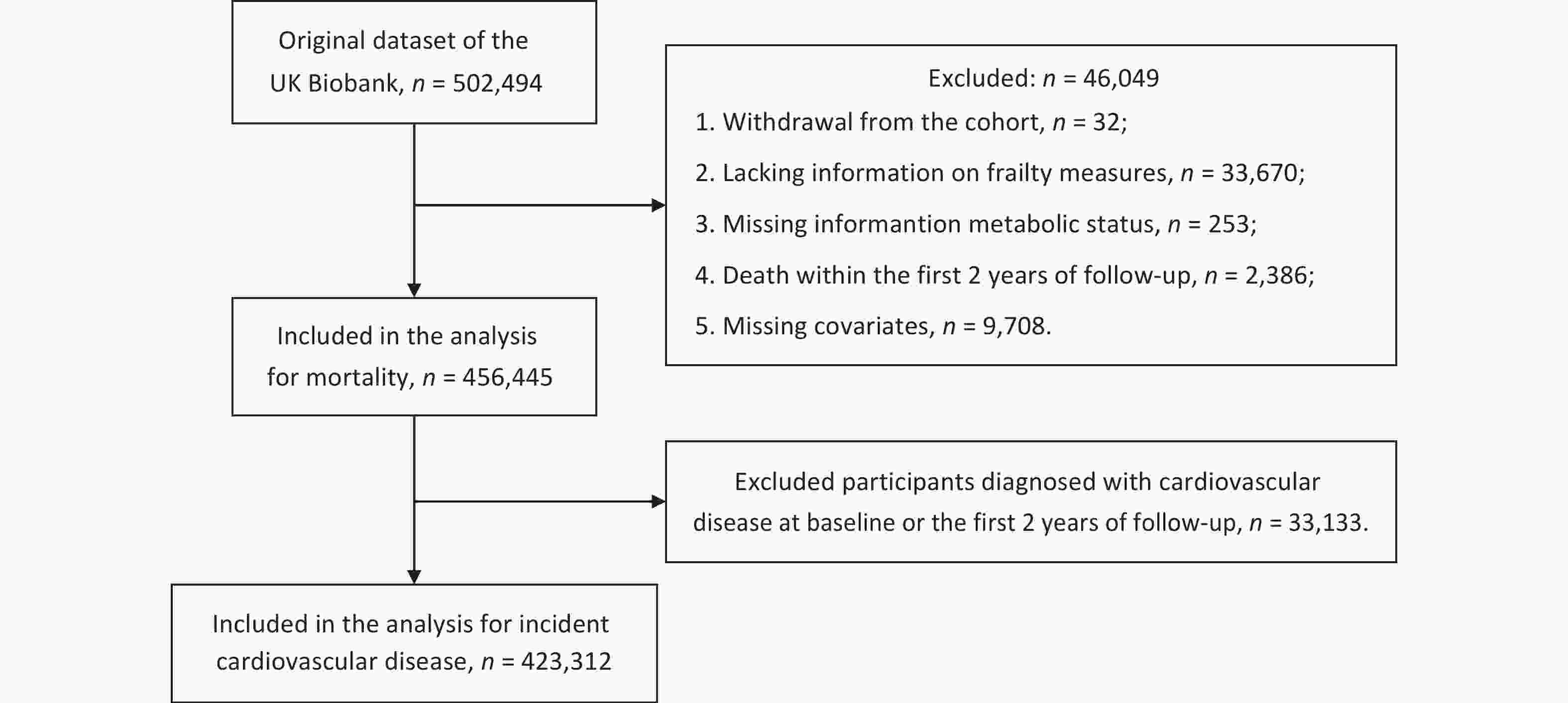 As shown in Figure 2, among the 502,494 participants, those who withdrew from the cohort (n = 32), were missing information for frailty phenotypes (n = 33,670), metabolic status (n = 253), or covariates (n = 9,708), or who died within the first two years of follow-up (n = 2,386) were excluded. This left 456,445 participants for the analyses of mortality. A total of 33,133 participants diagnosed with CVD at baseline or within the first two years of follow-up were further excluded from the CVD analyses, and 423,312 participants remained for the analyses of incident CVD.