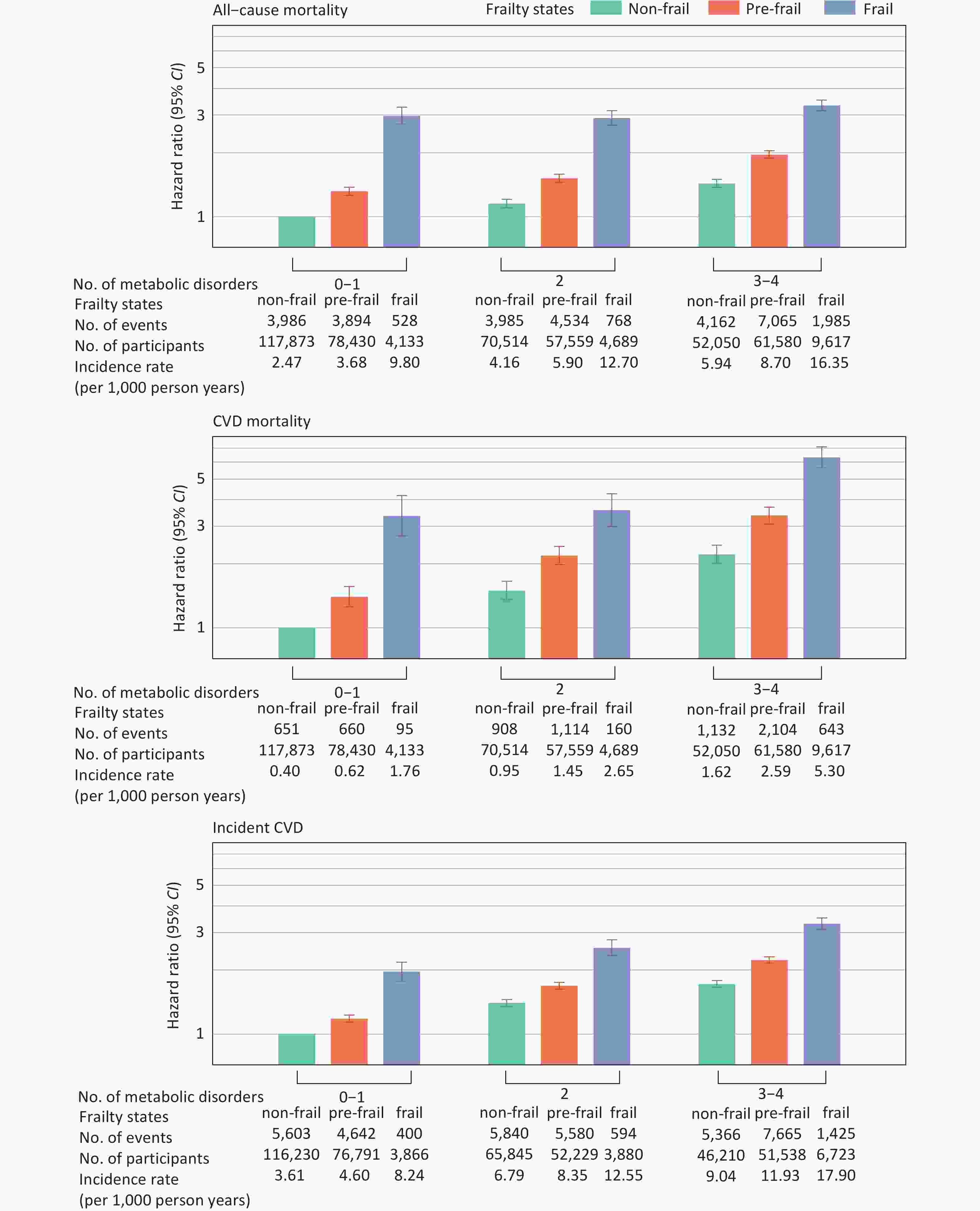 metabolic statusAll-cause mortality Non-frail 12,133 3.71 1.00 1.00 − Pre-frail 15,493 5.87 1.37 (1.34–1.40) 1.33 (1.30–1.37) 8.4 (7.5–9.4) Frail 3,281 13.91 2.62 (2.52–2.73) 2.41 (2.31–2.51) 8.7 (8.0–9.5) Per-point increment in frailty score − − 1.34 (1.32–1.35) 1.30 (1.29–1.32) 8.5 (7.8–9.3) CVD mortality Non-frail 2,691 0.82 1.00 1.00 − Pre-frail 3,878 1.47 1.55 (1.48–1.63) 1.46 (1.39–1.53) 14.4 (12.4–16.5) Frail 898 3.81 3.18 (2.93–3.45) 2.64 (2.43–2.87) 16.1 (14.5–17.8) Per-point increment in frailty score − − 1.44 (1.41–1.47) 1.36 (1.33–1.39) 15.3 (13.9–16.8) Incident CVD Non-frail 16,809 5.59 1.00 1.00 − Pre-frail 17,887 7.71 1.27 (1.24–1.29) 1.22 (1.20–1.25) 15.0 (13.4–16.8) Frail 2,419 13.79 2.06 (1.97–2.15) 1.83 (1.75–1.91) 16.4 (15.1–17.9) Per-point increment in frailty score − − 1.24 (1.23–1.26) 1.20 (1.19–1.22) 16.0 (14.8–17.2) Note. Incidence rates were calculated at the end of follow-up and are reported per 1,000 person-years. All models were adjusted for age, sex, ethnicity, Townsend Deprivation Index, assessment center, educational attainment, smoking status, alcohol consumption, diet, and sleep duration. Metabolic status was defined using a summary score (range: 0–4) based on central obesity, hyperglycemia, hypertension, and dyslipidemia. Only participants free from CVD at baseline and during the first two years of follow-up were included in the analysis of incident CVD (n = 423,312). CVD, cardiovascular disease; HR, hazard ratio; CI, confidence interval. Table 3. Interactions between frailty and metabolic status in relation to mortality and incident CVD